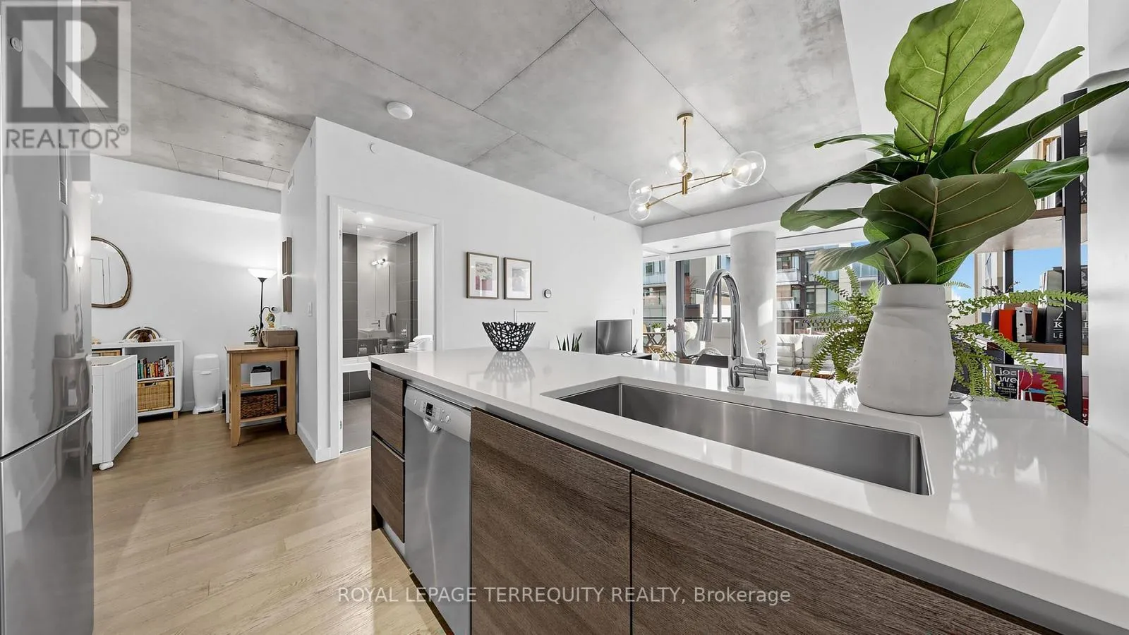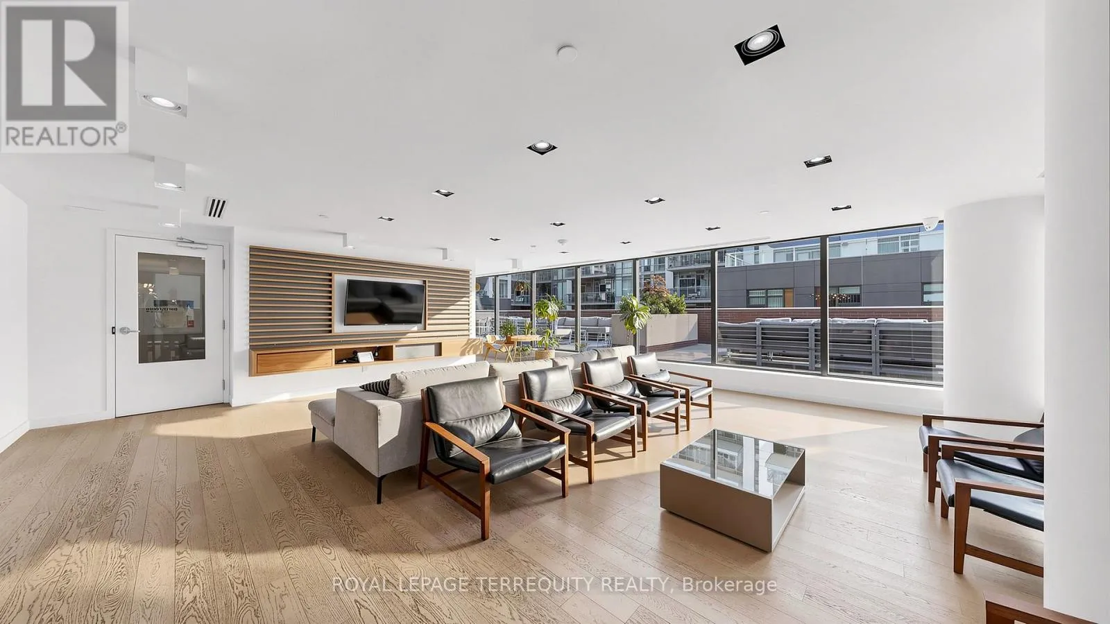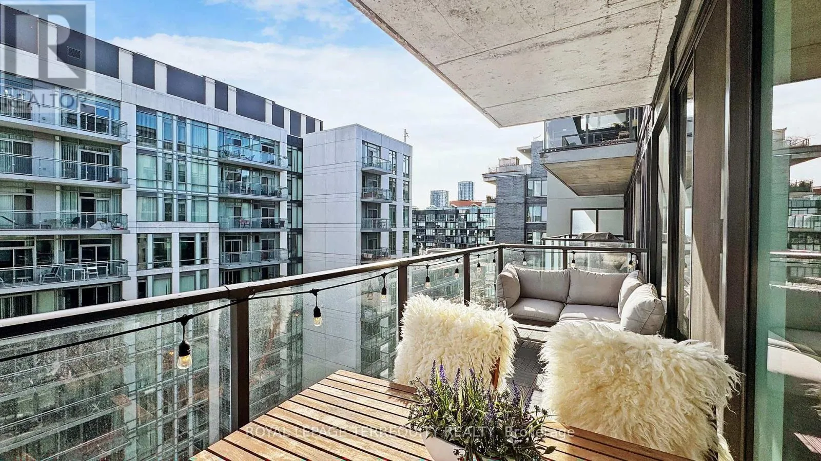 Cross Streets: Bathurst & King. ** Directions: S of Bathurst. King West vibe - this generous 1+den suite is clean, modern, and effortlessly cool. Think 9-ft exposed concrete ceilings, floor-to-ceiling windows, and an open-concept layout that feels both airy and intentional. The east-facing exposure keeps things bright with soft morning light and open terrace views that make the space feel calm above it all. Custom tall kitchen cabinetry, quartz counters, integrated stainless appliances, a sleek backsplash, breakfast bar, and a gas range-rare for condo living and perfect if you actually cook. Engineered hardwood runs throughout, adding warmth to the industrial edge. The den is almost a second bedroom in size, making it genuinely versatile-set it up as a proper home office, guest room, or creative space without compromise. The layout just works-no wasted space, no awkward corners. The terrace spans the full width of the suite, it's an oversized outdoor extension with a gas line-perfect for BBQs, morning coffee, or hosting friends before heading out. It's the kind of space that's hard to find and even harder to leave. Maintenance fees are exceptionally low at $541.55, excellent value for the neighbourhood! The building offers everything you need without overdoing it: rooftop terrace with BBQs, party room, guest suites, great neighbours and concierge that cares. And the location? This is why people want King West. Step outside and you're walking everywhere-coffee, fitness studios, groceries, restaurants, parks, nightlife. It's a real community vibe where you start recognizing faces, favourite spots, and your go-to routines. You're minutes to Stanley Park, Waterworks Food Hall, The Well, STACKT Market, and some of the city's best dining. The waterfront is a quick bike or walk, and the Gardiner is right there when you need to get out of the core. With the future King-Bathurst Ontario Line station around the corner, this pocket is only getting better. (id:27476)