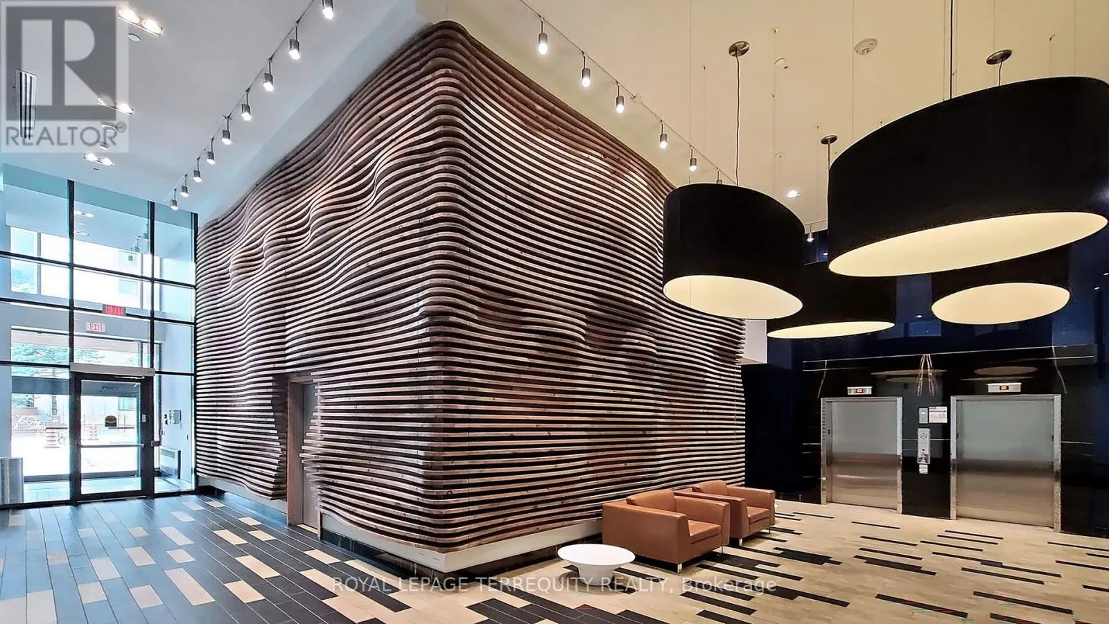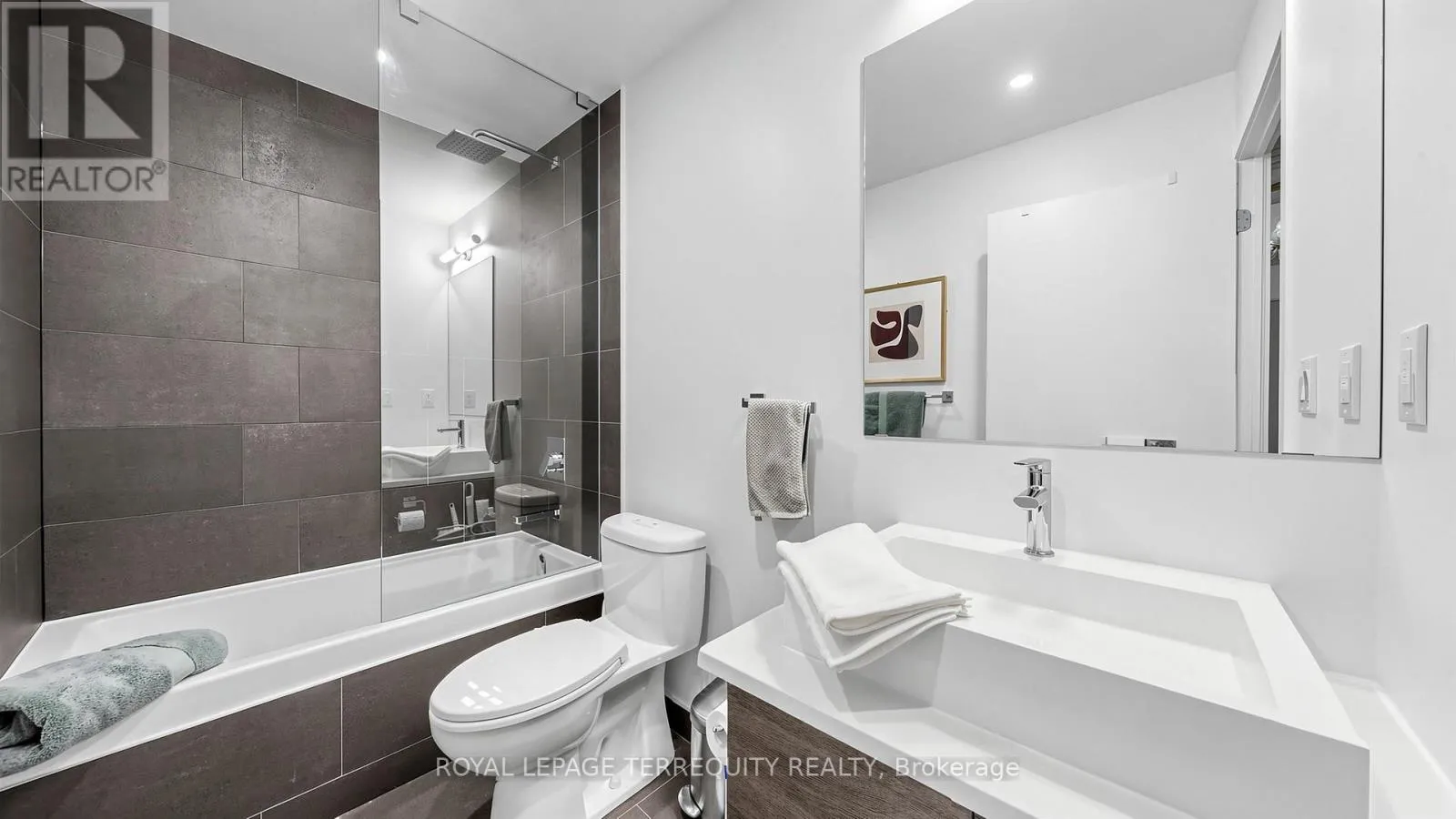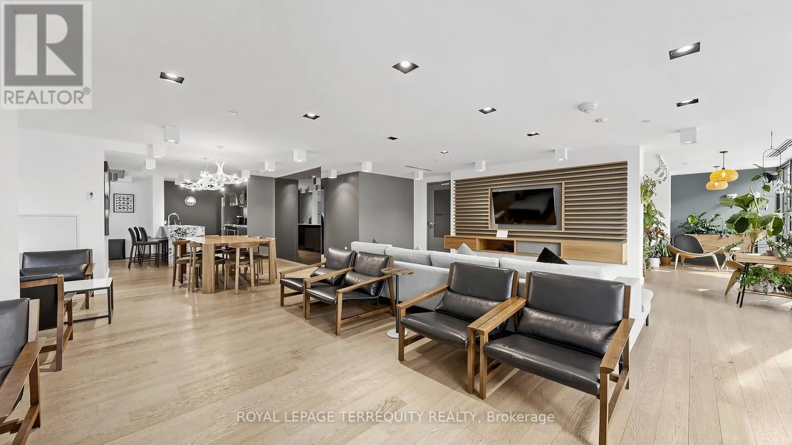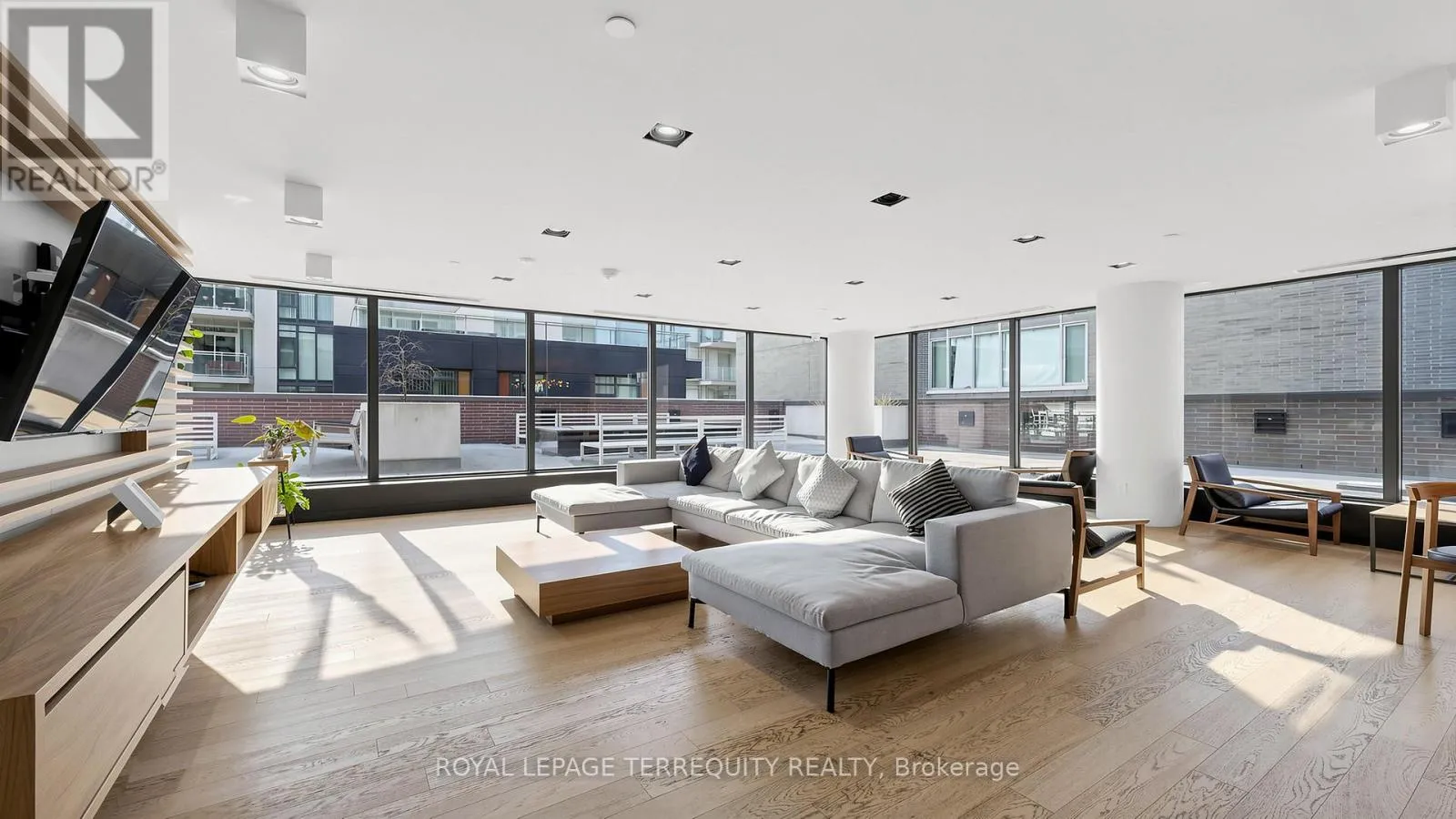Cross Streets: Bathurst & King. ** Directions: S of Bathurst. King West vibe - this generous 1+den suite is clean, modern, and effortlessly cool. Think 9-ft exposed concrete ceilings, floor-to-ceiling windows, and an open-concept layout that feels both airy and intentional. The east-facing exposure keeps things bright with soft morning light and open terrace views that make the space feel calm above it all. Custom tall kitchen cabinetry, quartz counters, integrated stainless appliances, a sleek backsplash, breakfast bar, and a gas range-rare for condo living and perfect if you actually cook. Engineered hardwood runs throughout, adding warmth to the industrial edge. The den is almost a second bedroom in size, making it genuinely versatile-set it up as a proper home office, guest room, or creative space without compromise. The layout just works-no wasted space, no awkward corners. The terrace spans the full width of the suite, it's an oversized outdoor extension with a gas line-perfect for BBQs, morning coffee, or hosting friends before heading out. It's the kind of space that's hard to find and even harder to leave. Maintenance fees are exceptionally low at $541.55, excellent value for the neighbourhood! The building offers everything you need without overdoing it: rooftop terrace with BBQs, party room, guest suites, great neighbours and concierge that cares. And the location? This is why people want King West. Step outside and you're walking everywhere-coffee, fitness studios, groceries, restaurants, parks, nightlife. It's a real community vibe where you start recognizing faces, favourite spots, and your go-to routines. You're minutes to Stanley Park, Waterworks Food Hall, The Well, STACKT Market, and some of the city's best dining. The waterfront is a quick bike or walk, and the Gardiner is right there when you need to get out of the core. With the future King-Bathurst Ontario Line station around the corner, this pocket is only getting better. (id:27476)