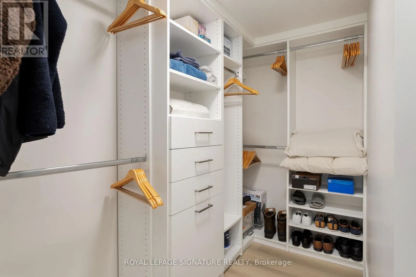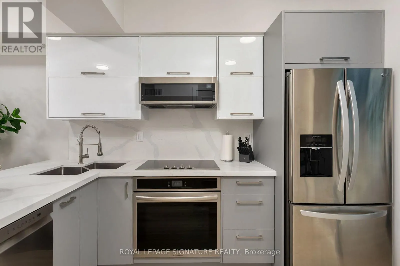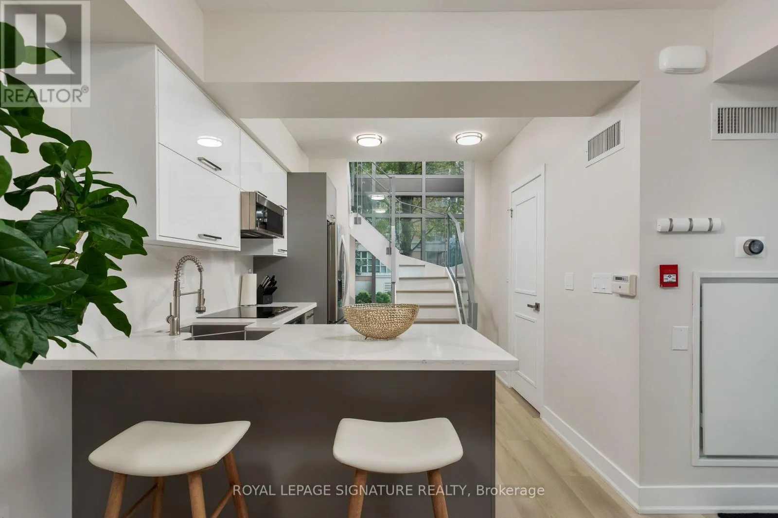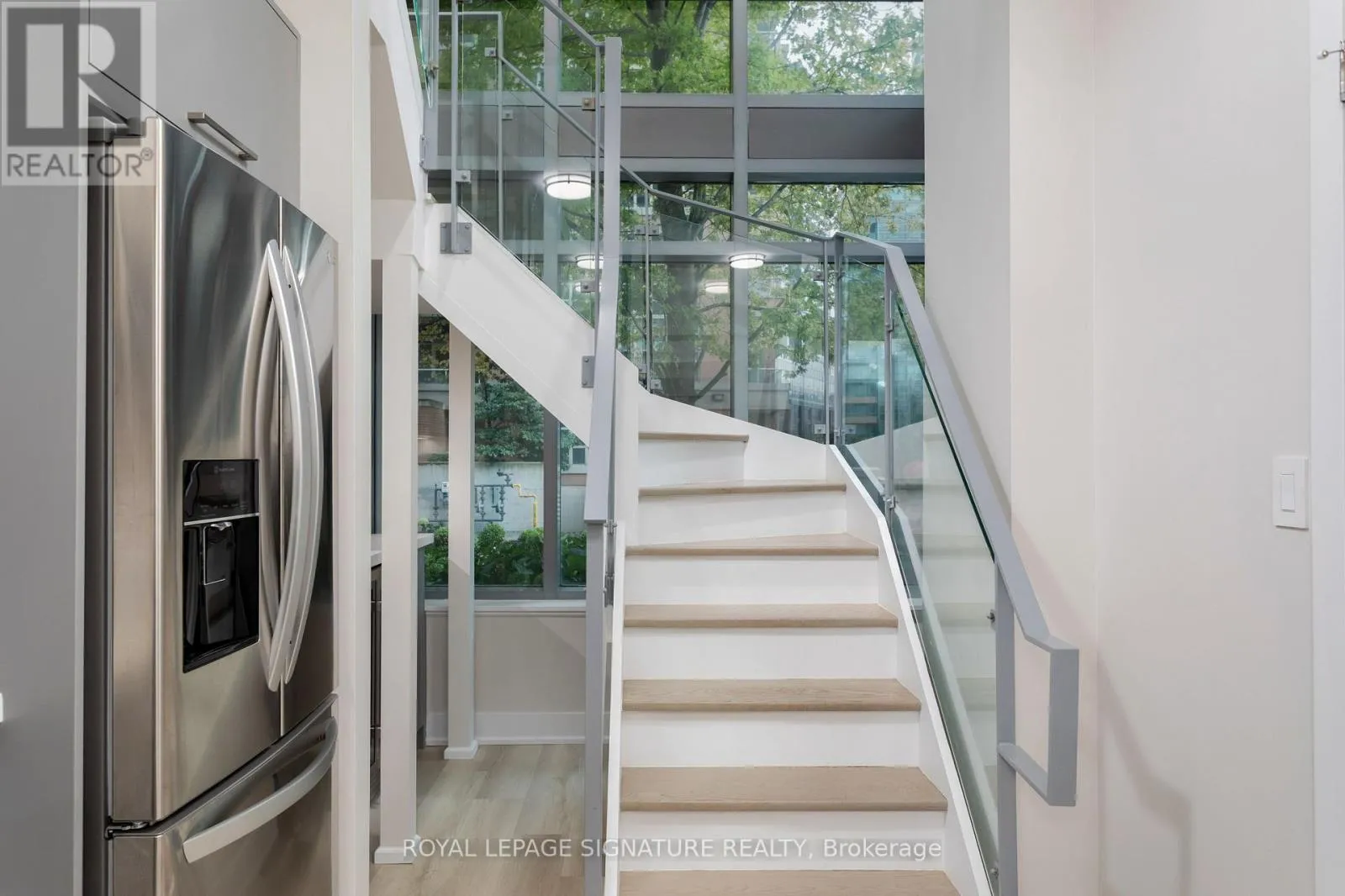 King St W & Strachan Ave Step into this 870 sq ft luxury and extensively upgraded 1-bedroom + den, 2 bathroom condo townhouse, designed for those who appreciate modern elegance. The professional 2023 renovation showcases hardwood stairs with sleek glass rails, soaring 18-foot ceilings with two storeys of windows, and smooth ceilings throughout. The kitchen features quartz countertops, a double butterfly sink, all new appliances, a wine fridge, a soft-closing mechanism for cabinets, and a counter stovetop, perfect for the discerning chef. Enjoy spacious living with 7-inch wide vinyl flooring, while the large living room window leads to the front patio for outdoor relaxation. The custom-built walk-in closet in the bedroom is complemented by mechanical blackout blinds, and the ensuite includes a glass walk-in shower. Smart home features like two Nest thermostats, brand-new full-sized laundry appliances, and two EV charging stations make this home as functional as it is beautiful. (id:27476)