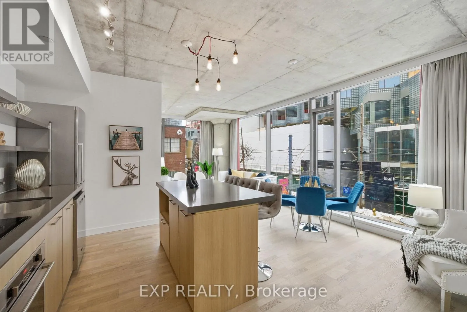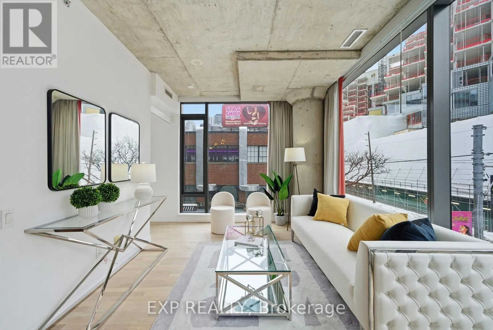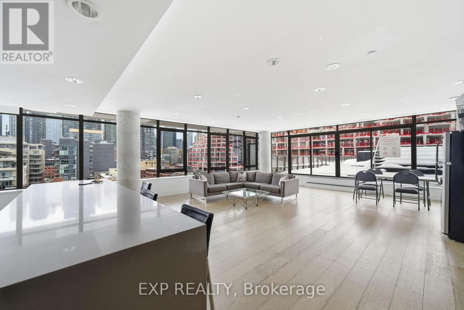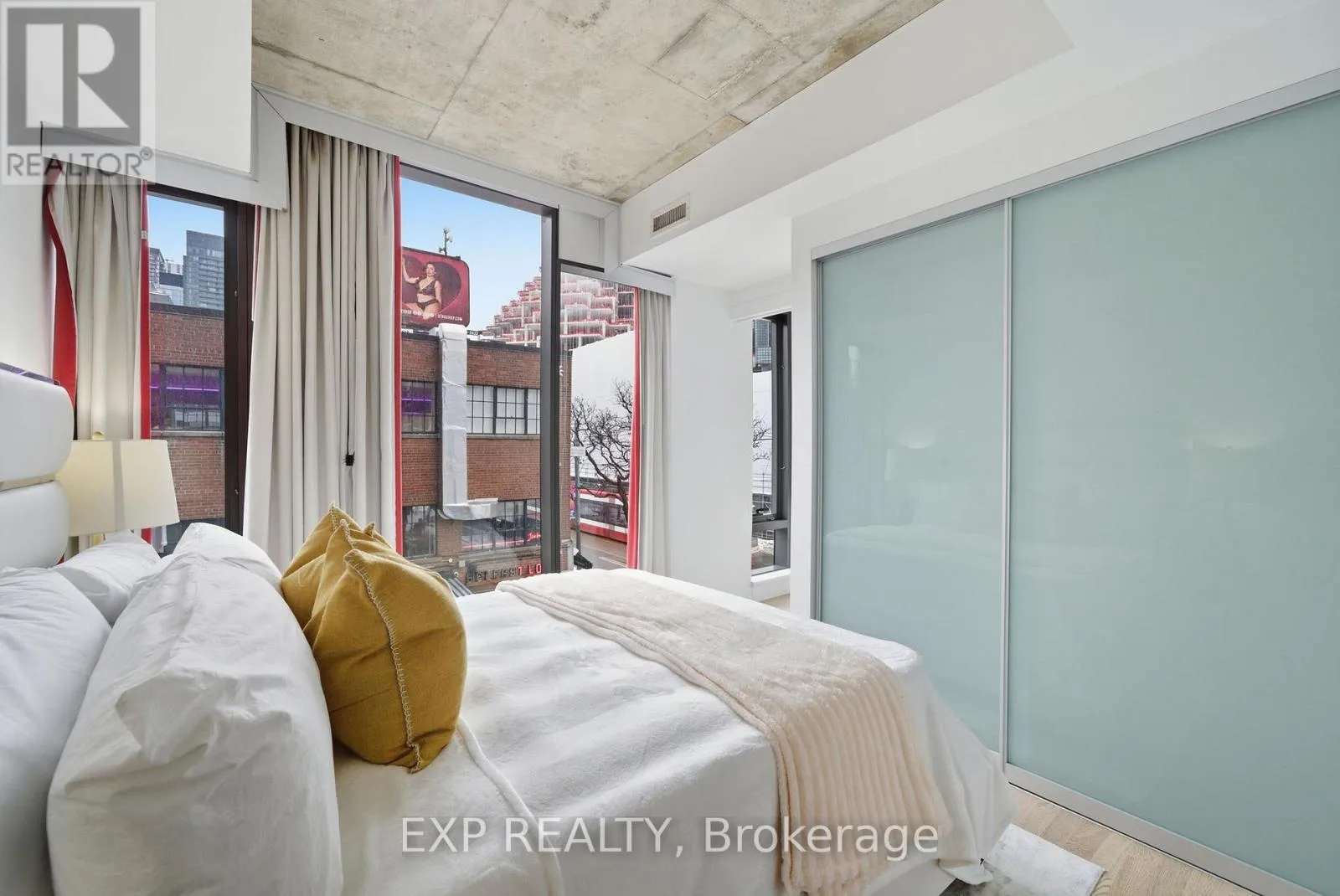 King & Portland Welcome to Fashion House - one of Toronto's most coveted boutique residences, masterfully developed by Freed and architecturally designed by CORE Architects. Perfectly positioned in the heart of King West, this celebrated address places you above The Keg, beside Wilbur, and directly across from Rodney's Oyster House and Mademoiselle - immersed in Michelin Guide dining, world-class nightlife, and the city's most electric energy. This sun-filled corner loft offers a rare split 2-bedroom, 2 bathroom design with almost 800 square-feet of living area and southeast exposure, delivering breathtaking city views through floor-to-ceiling windows. Inside, 9 foot exposed concrete ceilings, sculptural columns, and a seamless open-concept layout create an effortlessly cool, gallery-like atmosphere. The Scandinavian-inspired kitchen features sleek finishes and bar seating, offering a perfect view of the living and dining space-ideal for entertaining or elevated everyday living. The primary suite is a serene retreat with dramatic windows, frosted sliding closet doors, and a spa-inspired ensuite complete with a soaker tub. A thoughtfully placed guest bathroom offers a generously sized walk-in shower. Owned parking and a locker complete this highly functional and stylish home. Designed for those who prioritize health, wellness, and lifestyle, you're within a 10-minute walk to Toronto's top fitness and wellness destinations, including Sweat & Tonic, Othership, Hammam, Studio Lagree, F45, One Academy, YMCA, GoodLife, Totum, and more. Whole Foods is opening across the street! Residents enjoy resort-style amenities, including a stunning infinity pool with cabanas, a fully equipped gym, and an elegant party room. TTC is at your doorstep, steps to the future Ontario Line, five minutes to the waterfront, and minutes to the Financial District, TIFF, theatre district, DVP, and Gardiner. Heat, A/C, gas, and water are included-hydro is the only extra. This isn't just a condo. It's a lifestyle. (id:27476)
