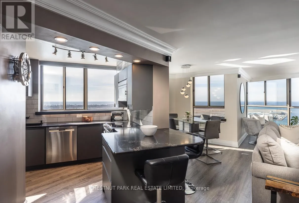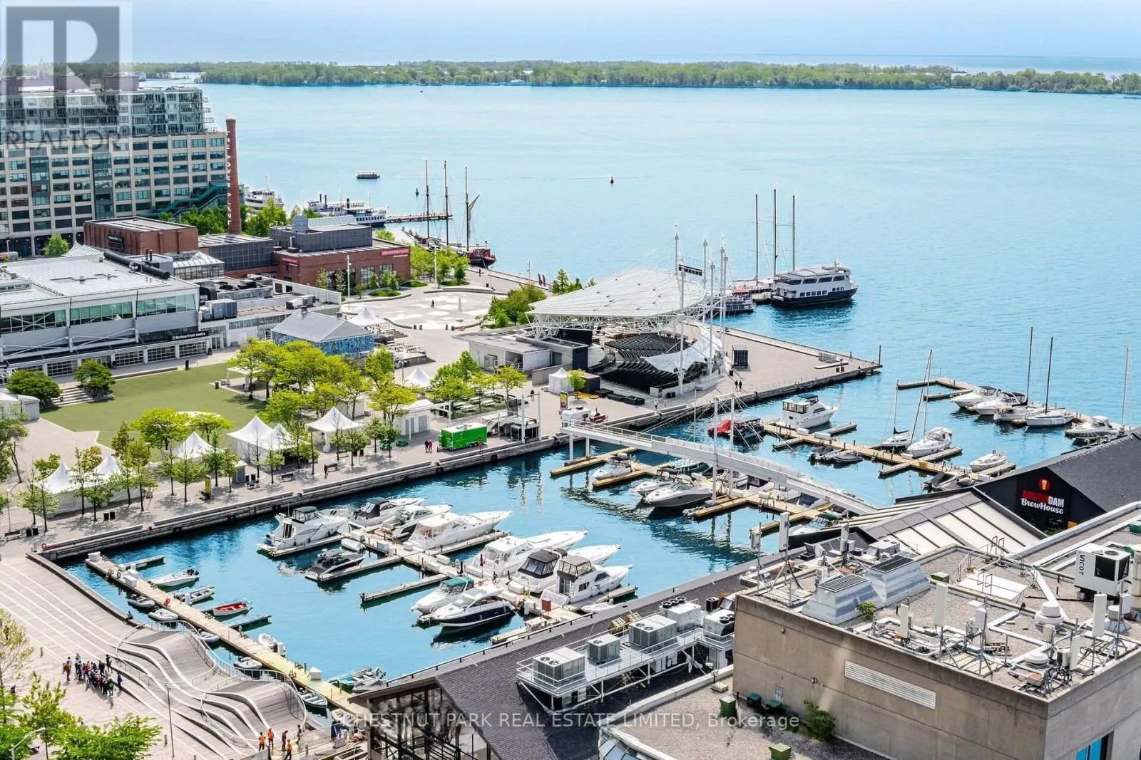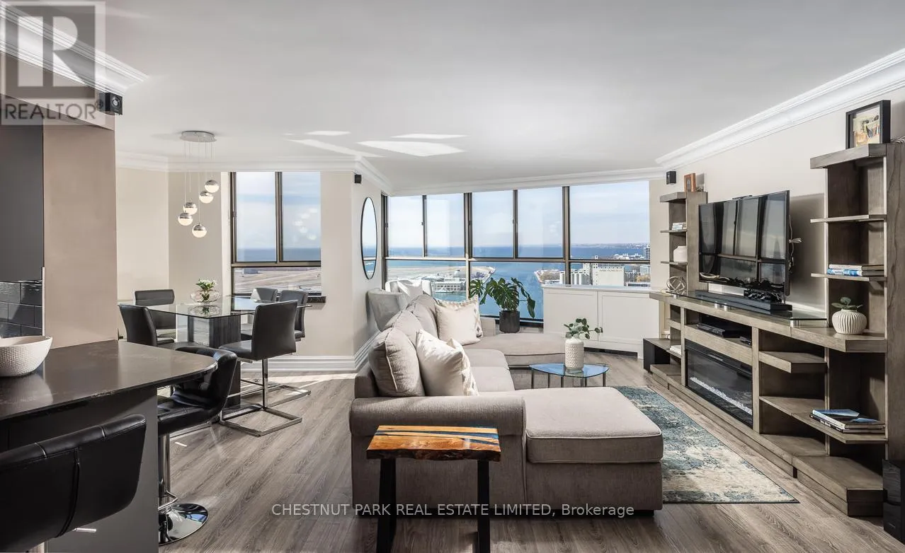 Queens Quay West & Spadina Avenue Breathtaking sunrises to sunsets from this one-of-a-kind 1,740 sq. ft. south-facing PENTHOUSE! Literally perched atop Lake Ontario, this fully renovated split-plan suite offers expansive, unobstructed, forever views of the Toronto Islands and the city skyline, stretching all the way to the U.S. With exceptional space, light, and flow, the suite feels very much like a bungalow in the sky. The sleek, contemporary chef's kitchen was renovated in 2024 and features ample storage, quartz countertops, pantry cupboards, double drawers, and a wine fridge. The extra-large primary suite showcases incredible views of the city skyline and lake, along with two seating areas, custom built-ins, a small office area, a large walk-in closet, and a stone, spa-inspired ensuite. The dining area overlooks the famed Toronto Islands. The spacious living area features custom cabinetry and an electric fireplace, while a separate bar area offers the option for a second dining space. The second bedroom includes a large double closet and stunning west-facing views of parkland and the Toronto skyline. Additional features include Hunter Douglas electric blinds, a smart lighting system, two designated side-by-side parking spots, and two oversized lockers. Enjoy a newly renovated, notable rooftop terrace with BBQs just one floor away. TTC is right at your door, with minutes to the Financial District, Harbourfront, Billy Bishop Airport, and the UP Express. This waterfront downtown penthouse truly has it all! Note: Fibre internet and cable are included in the maintenance fee. (id:27476)