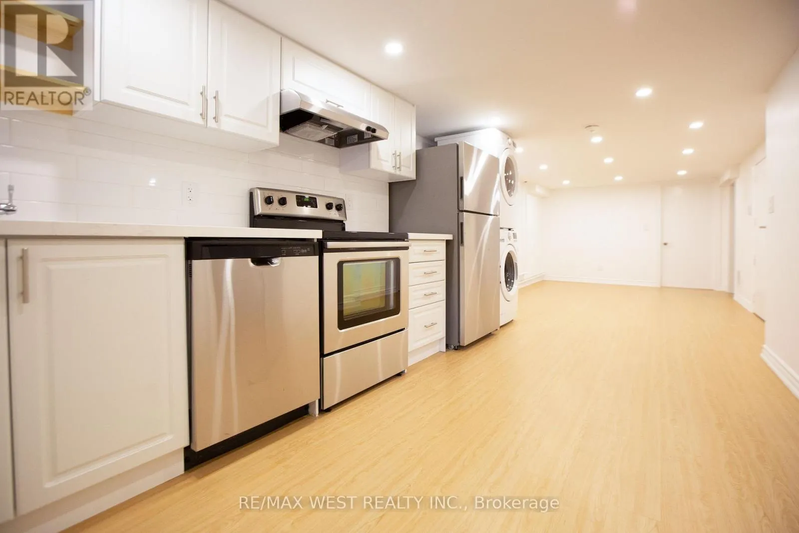 Cross Streets: King & Jameson. ** Directions: Off of Leopold. Bright and spacious 2-bedroom basement apartment offering over 700 sq. ft. in a charming Victorian home. Features high ceilings, pot lights, and an open-concept layout. Modern kitchen with stainless steel appliances and quartz countertops. Designer vinyl flooring throughout. Updated bathroom with large walk-in shower. Ensuite laundry. Renovated in 2018. Prime location near Liberty Village, Queen St. W., and King St. streetcar, with easy access to highways. Available as early as April 1, 2026. (id:27476)