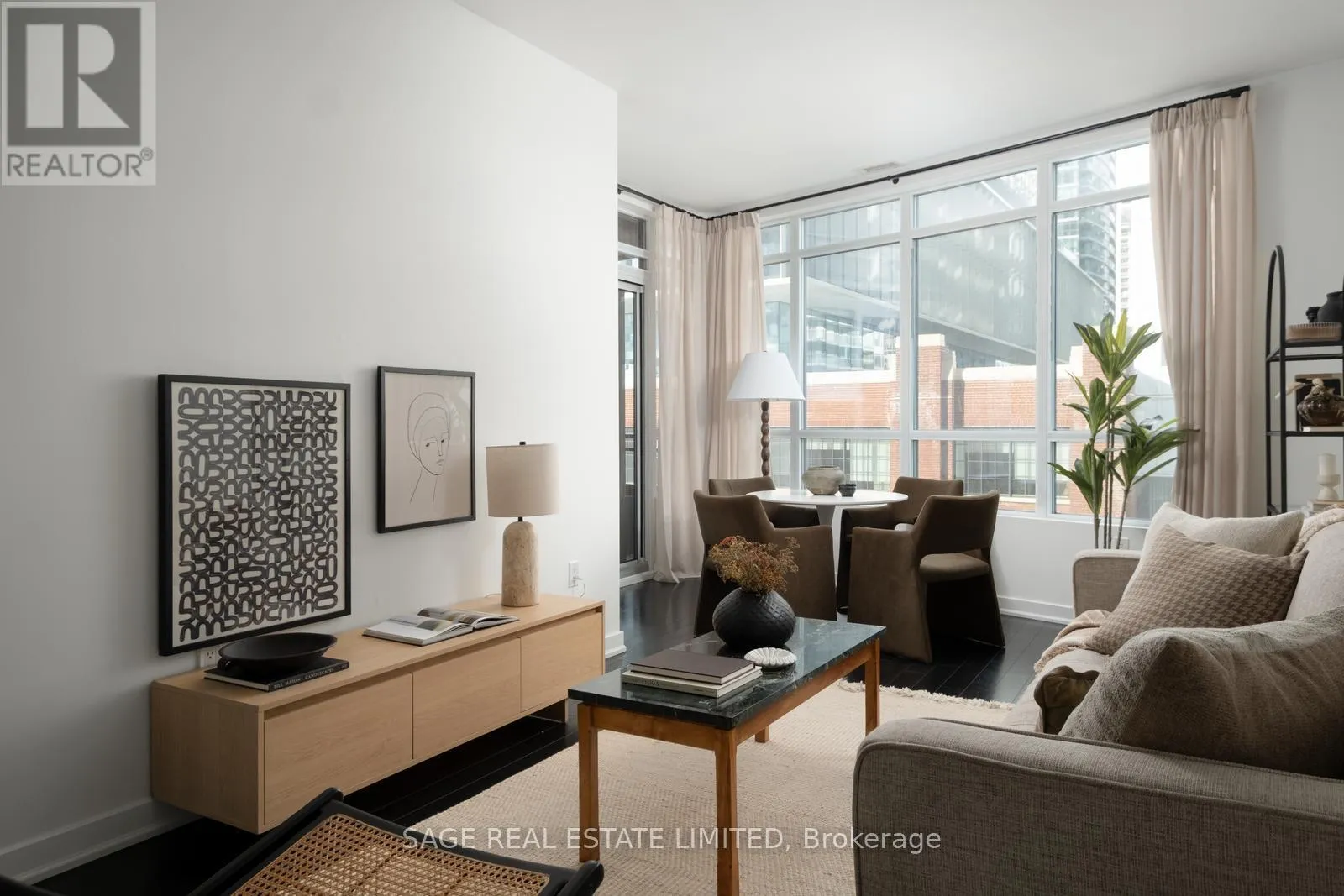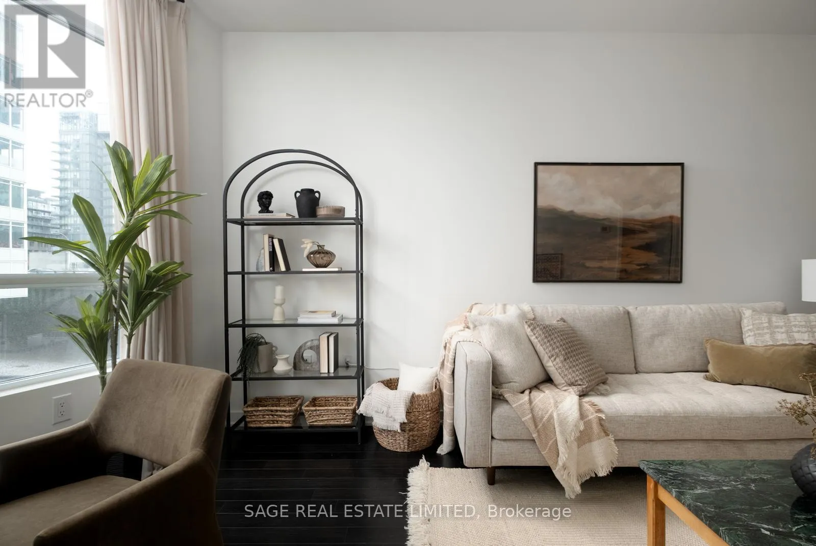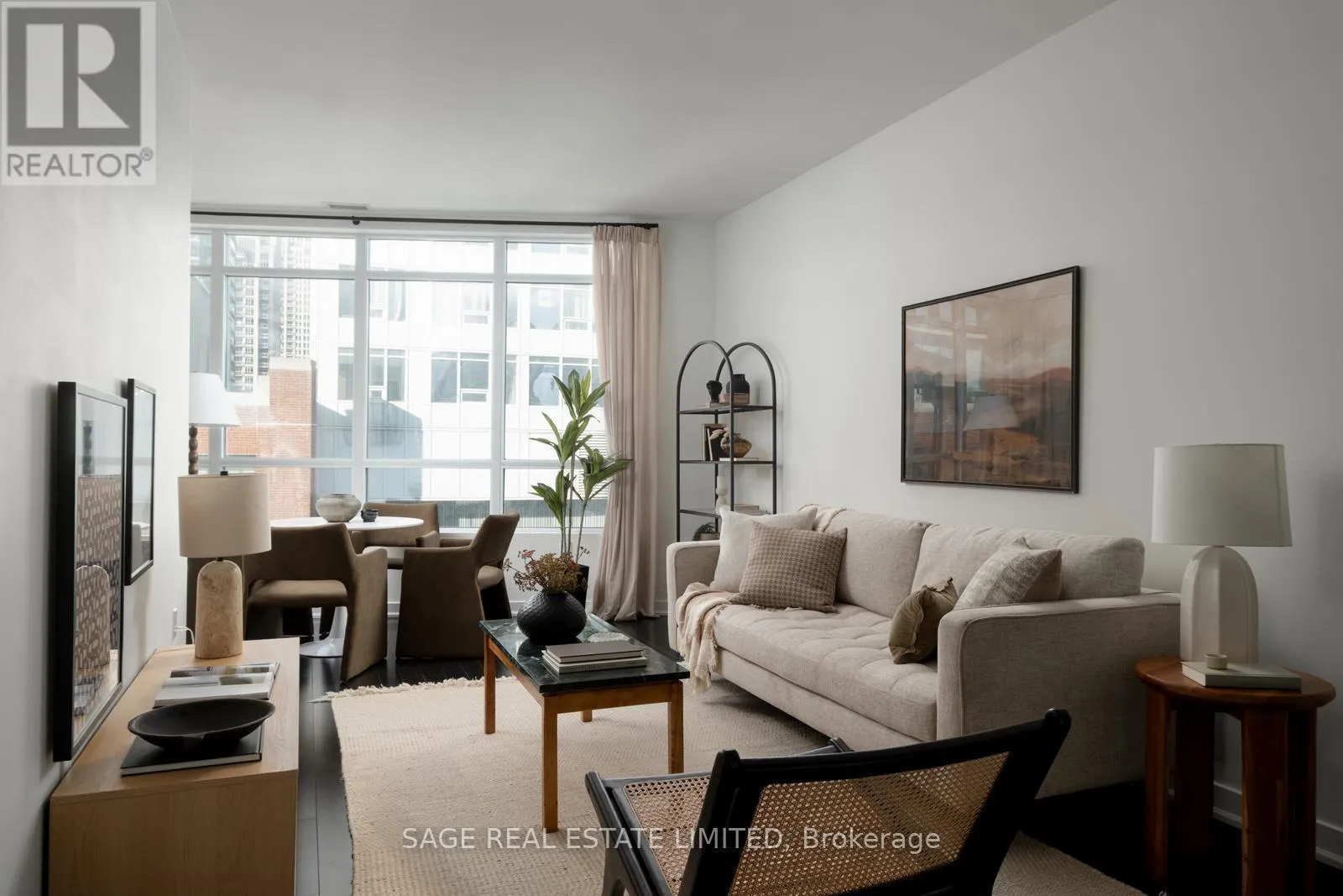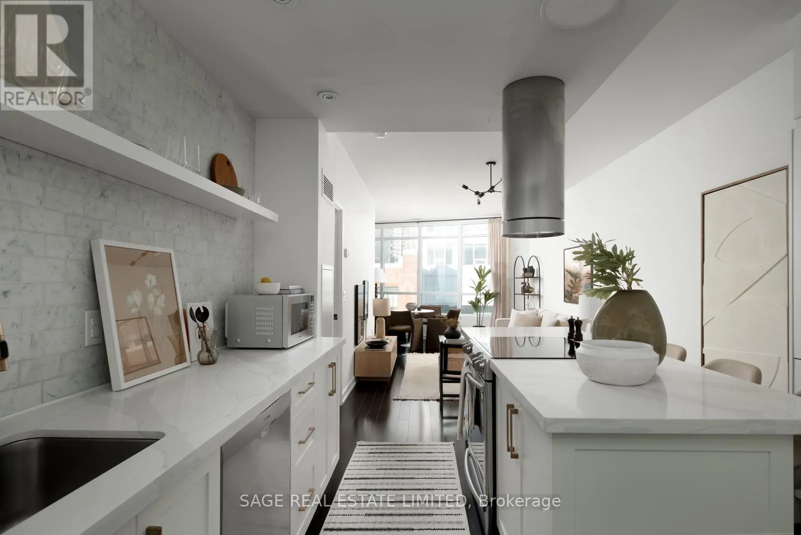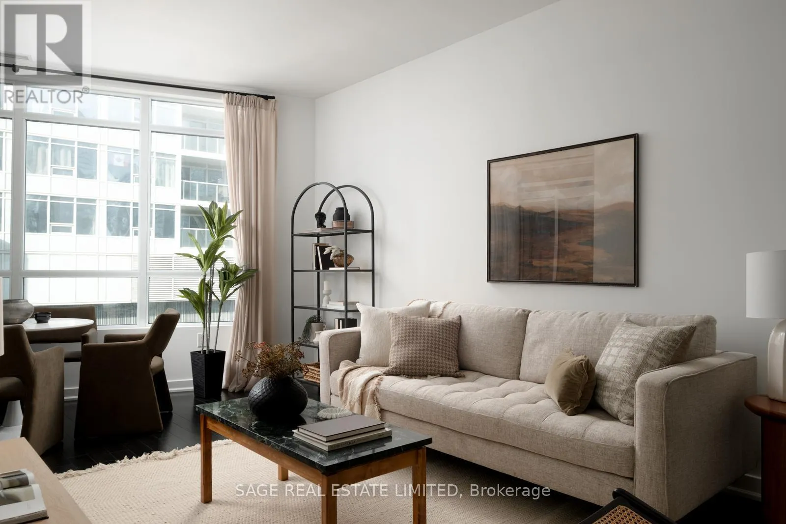 Lakeshore/Bathurst Set along Toronto's dynamic waterfront, this west-facing 2-bedroom, 1-bath condo delivers nearly 900 sq ft of intelligently designed living in one of downtown's most connected communities. A proper foyer with an oversized closet creates a sense of arrival and separation before opening into the kitchen, which flows seamlessly into the open-concept living and dining area. Floor-to-ceiling windows and warm natural light throughout the day keep the entire space feeling bright and airy. Renovated in 2020, the kitchen anchors the home with a generous quartz island, full-size stainless steel appliances, and a large custom pantry that adds rare, functional storage. Clean finishes and thoughtful built-ins elevate both form and function, creating a space that feels modern without sacrificing practicality. The primary bedroom is calm and efficient, with direct access to a smartly configured 4-piece bath that's designed for real life. Double sinks keep mornings easy, and an inner privacy door allows the space to operate as a guest-friendly powder room when entertaining, while still preserving a true primary-suite feel. The second bedroom comes complete with a large wardrobe and is ideal for guests, a nursery, or a home office. At 38 Dan Leckie Way, cafés, restaurants, and daily essentials, including a nearby grocery store, are just steps from your door. The lake and surrounding green space are under a five-minute walk, and the Rogers Centre is roughly 15 minutes on foot. The Queens Quay streetcar provides quick access across downtown, and when driving is essential, the Gardiner is minutes away. One underground parking space is included. The amenities round out your lifestyle with 24-hour concierge service, an exercise room, party/meeting spaces, guest suites, visitor parking, bike storage, and spa-inspired amenities, including a sauna and hot tub, plus a rooftop deck and garden with an outdoor BBQ area. (id:27476)