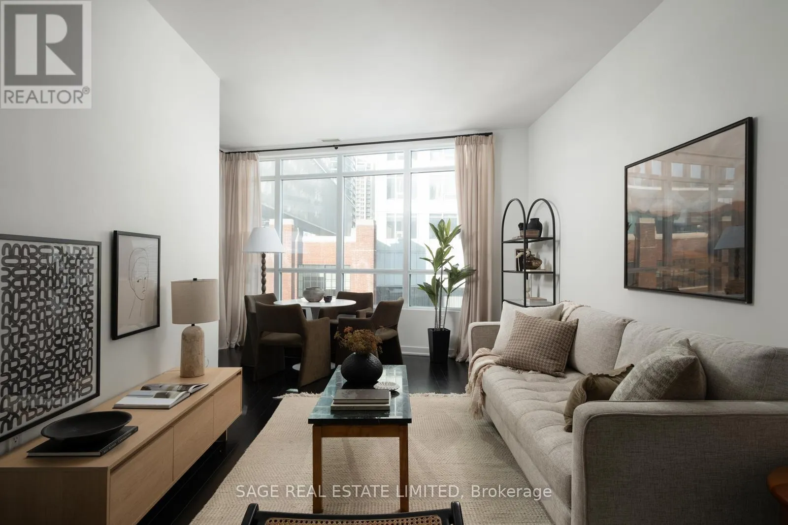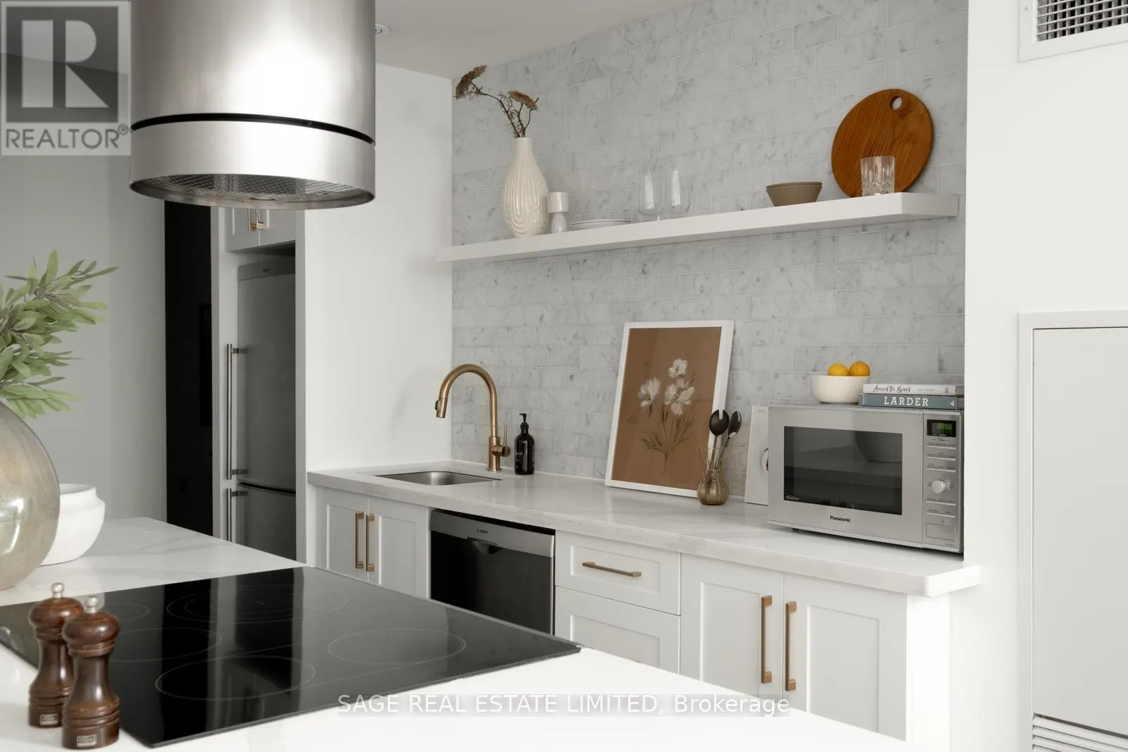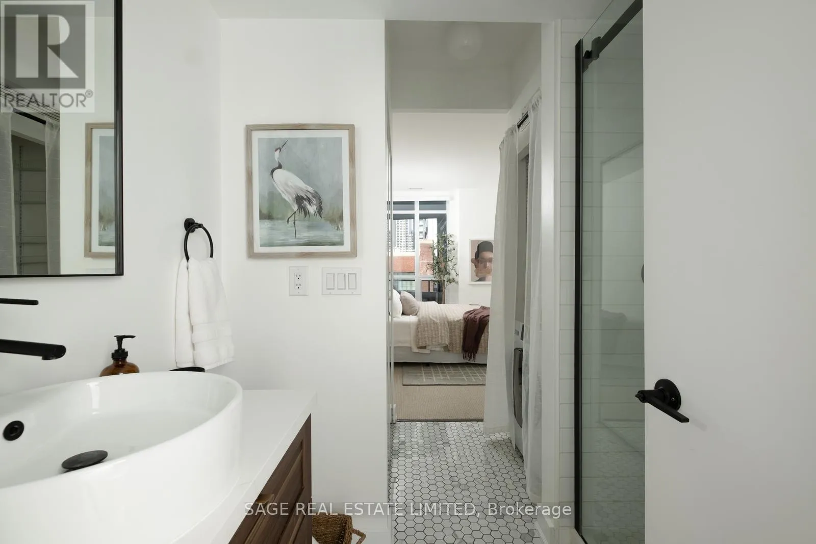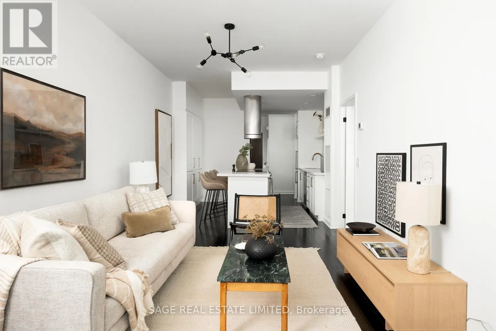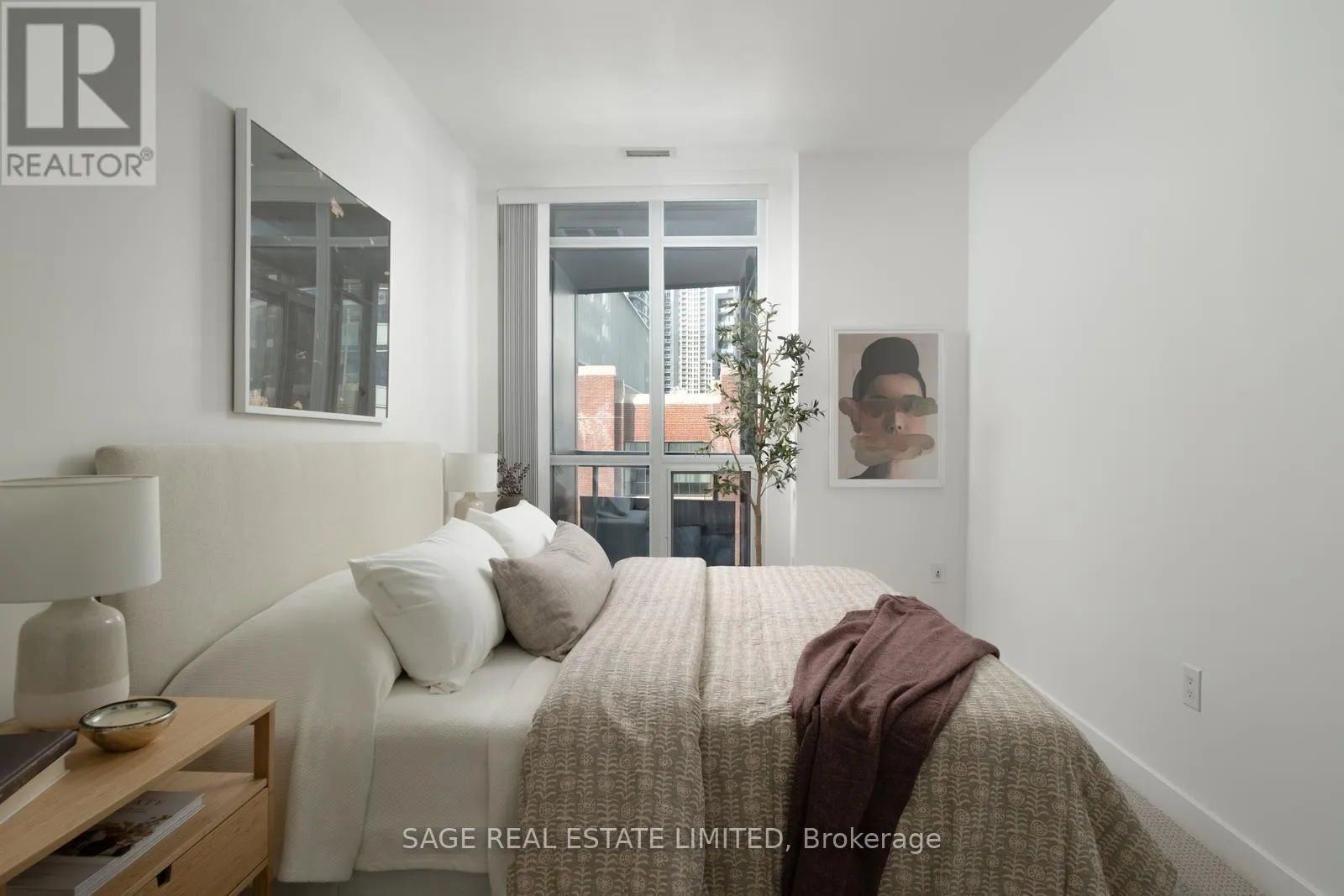 Lakeshore/Bathurst Set along Toronto's dynamic waterfront, this west-facing 2-bedroom, 1-bath condo delivers nearly 900 sq ft of intelligently designed living in one of downtown's most connected communities. A proper foyer with an oversized closet creates a sense of arrival and separation before opening into the kitchen, which flows seamlessly into the open-concept living and dining area. Floor-to-ceiling windows and warm natural light throughout the day keep the entire space feeling bright and airy. Renovated in 2020, the kitchen anchors the home with a generous quartz island, full-size stainless steel appliances, and a large custom pantry that adds rare, functional storage. Clean finishes and thoughtful built-ins elevate both form and function, creating a space that feels modern without sacrificing practicality. The primary bedroom is calm and efficient, with direct access to a smartly configured 4-piece bath that's designed for real life. Double sinks keep mornings easy, and an inner privacy door allows the space to operate as a guest-friendly powder room when entertaining, while still preserving a true primary-suite feel. The second bedroom comes complete with a large wardrobe and is ideal for guests, a nursery, or a home office. At 38 Dan Leckie Way, cafés, restaurants, and daily essentials, including a nearby grocery store, are just steps from your door. The lake and surrounding green space are under a five-minute walk, and the Rogers Centre is roughly 15 minutes on foot. The Queens Quay streetcar provides quick access across downtown, and when driving is essential, the Gardiner is minutes away. One underground parking space is included. The amenities round out your lifestyle with 24-hour concierge service, an exercise room, party/meeting spaces, guest suites, visitor parking, bike storage, and spa-inspired amenities, including a sauna and hot tub, plus a rooftop deck and garden with an outdoor BBQ area. (id:27476)