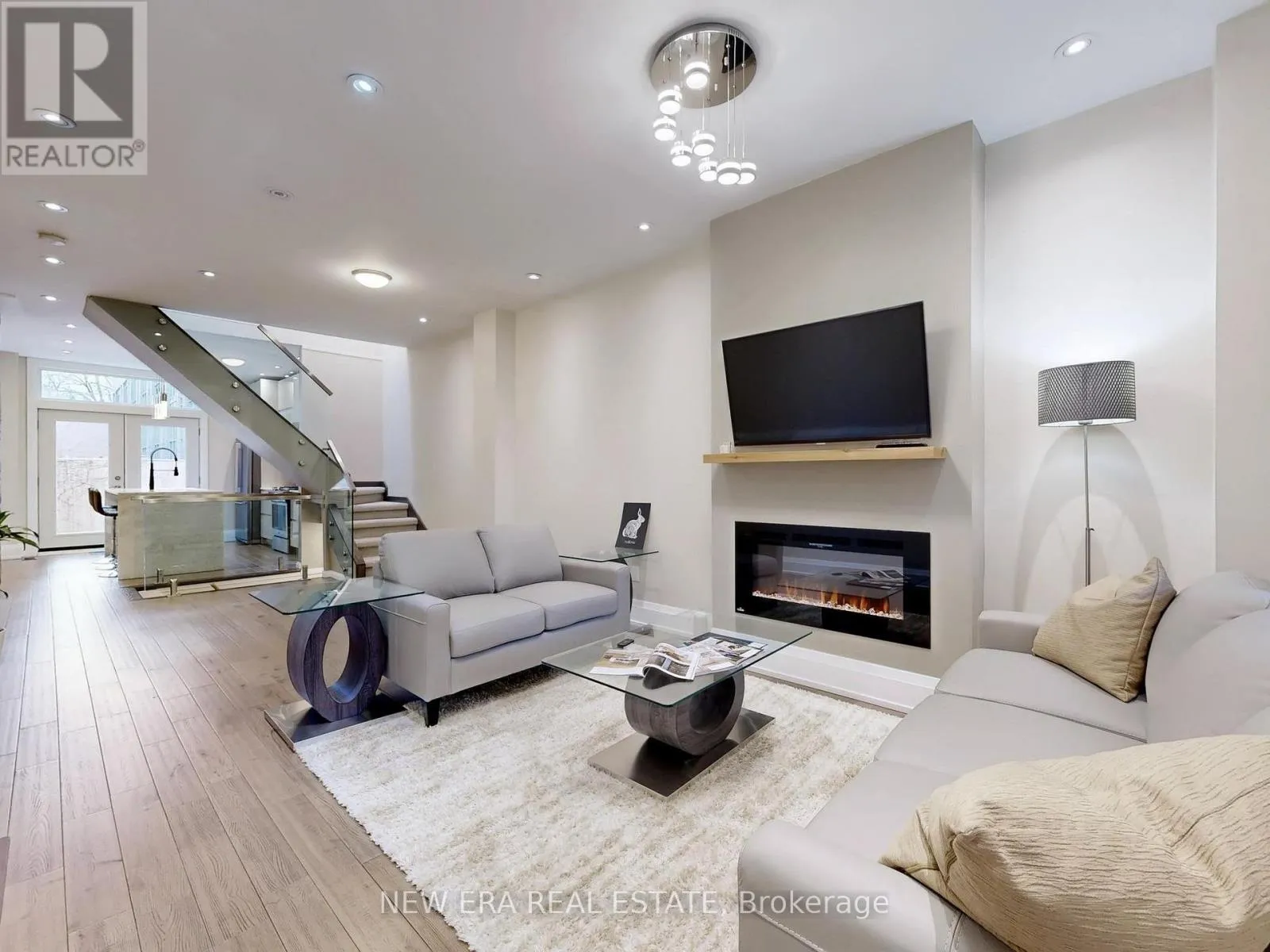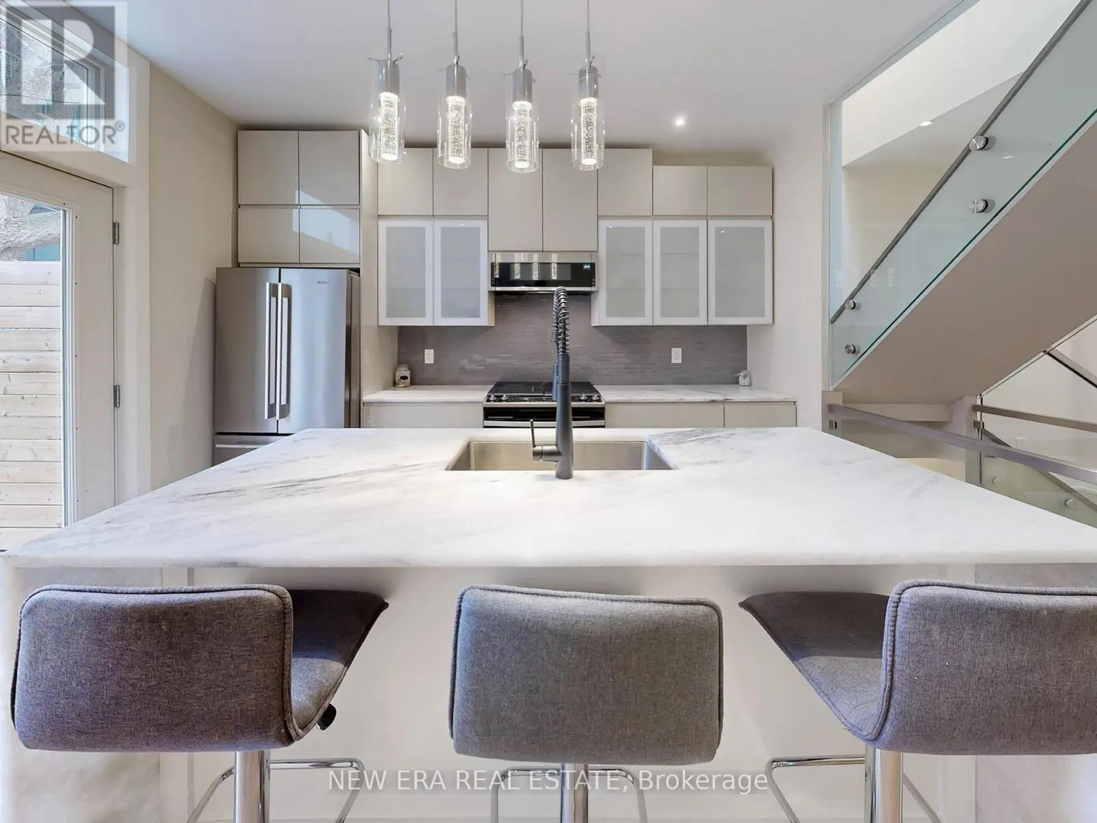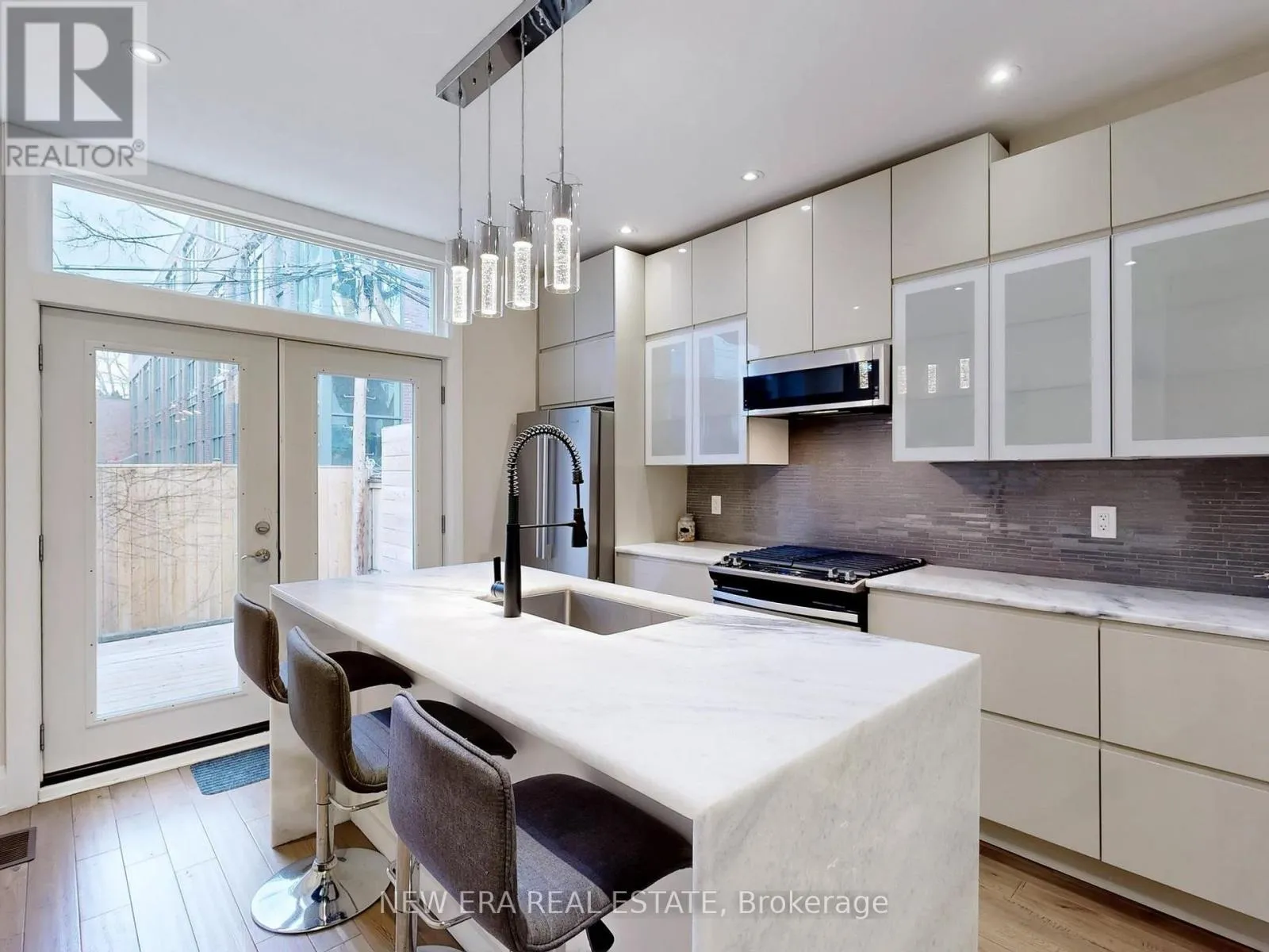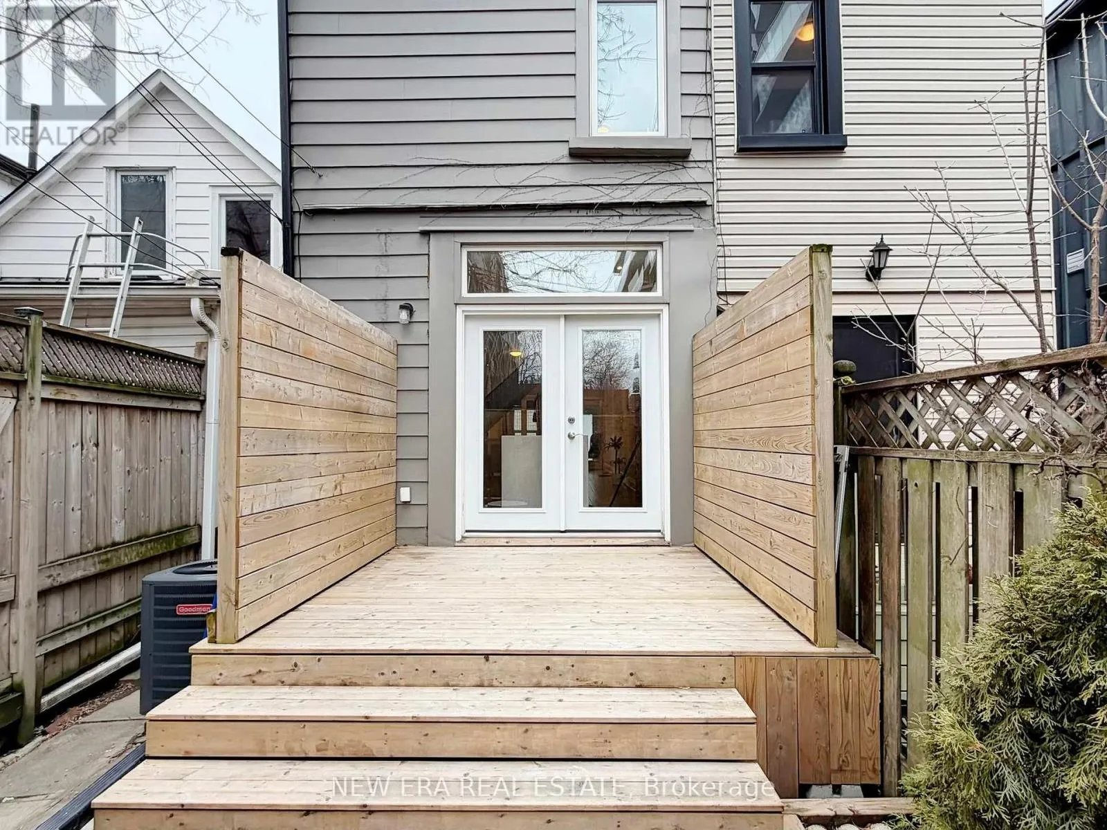 Leslie St & Queen St E Offers gratefully accepted Wednesday April 1st at 6pm. 75 Laing is the end-unit unicorn we didn't know we needed. Not a flip that skipped quality and care but rather a full 2020 gut-to-studs rebuild that nails quiet luxury without shouting about it. Rockwool in walls/ceilings kills city noise, spray-foam roof, new mechanicals, tankless hot water, owned high-efficiency furnace/AC, so bills stay low, life stays calm. Kitchen's pure chef vibes: huge quartzite waterfall island, pro gas range, premium appliances, pot lights everywhere. Solid maple hardwood throughout, 9ft main ceilings, incredible 14ft vaulted primary, custom glass-railing staircase, oversized baseboards, skylights pouring in light. Two sleek full baths, second-floor laundry (huge win), blank canvas lower level for office/gym/media. End-unit bonus: windows on three sides, real privacy, courtyard view instead of brick wall. Leslieville magic: steps to Maple Leaf Forever Park, 5-min to Greenwood (pool, rink, dog park), Queen streetcar to downtown in 15, Farmboy/Loblaws nearby, endless Queen East dining, hip yet family feel. Low-maintenance fenced yard, two-tiered deck, street permit parking. Turn-key modern in one of Toronto's best walkable spots, not cookie-cutter. Who's ready to move in? (id:27476)