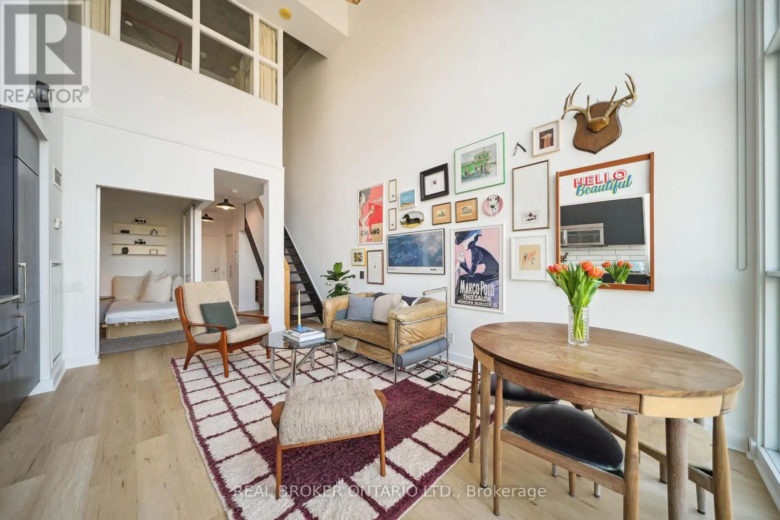 Liberty Village/E. Liberty St. Rare, 2-storey 2 bedroom 775 sf loft with 1 parking at the prized Liberty Market Lofts. Curated wood design accents throughout the unit add warmth and zen feel - this property has the aesthetic appeal of what a loft should be. It's located on the quieter, less dense side of Liberty Village and it features floor-to-ceiling windows that let in abundant natural light and showcase beautiful sunsets over top of the protected heritage-designated buildings surrounding it. An excellent use of space greets you at the door with custom fit hallway closets with a thoughtful setback to widen the entryway. An updated bathroom (tiles, mirror, lights, toilet) sits on the right and is followed by ample space under the stairs for storage or a perfect spot for a work desk. The open concept kitchen features an updated subway tile backsplash, built-in dishwasher and granite countertops. A recessed 2nd bedroom gives room to relax listening to the record player. Upstairs primary bedroom allows for genuine separation, ideal for couples or anyone wanting a comfortable live-work setup, while still preserving a sense of openness and view. The generous walk-in closet, 2nd floor laundry (w/ new Whirlpool stacked washer/dryer) and updated bathroom (tiles, walls and toilet) complete the upstairs space. The building is exceptionally well-managed and has outstanding maintenance fees. Amenities include: 24 hour concierge, well-equipped gym, yoga studio and even a hard to find half basketball court. There are multiple executive meeting rooms, business centre, tool/utility room, lounge with a kitchen, wet bar and pool table. There is even an art gallery with rotating art installations. A 4900 sq. m. park is being built beside the building that this unit will overlook and cafes, multiple grocery stores, pubs, professional services are all walkable. GO train (Exhibition) and the future Ontario line is 200 metres away and BMO field is right there too. Enjoy the World Cup this summer from your doorstep! (id:27476)