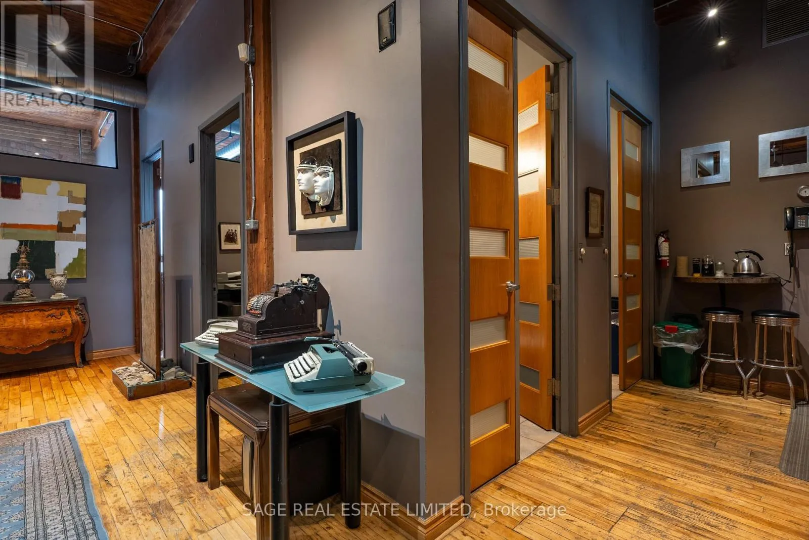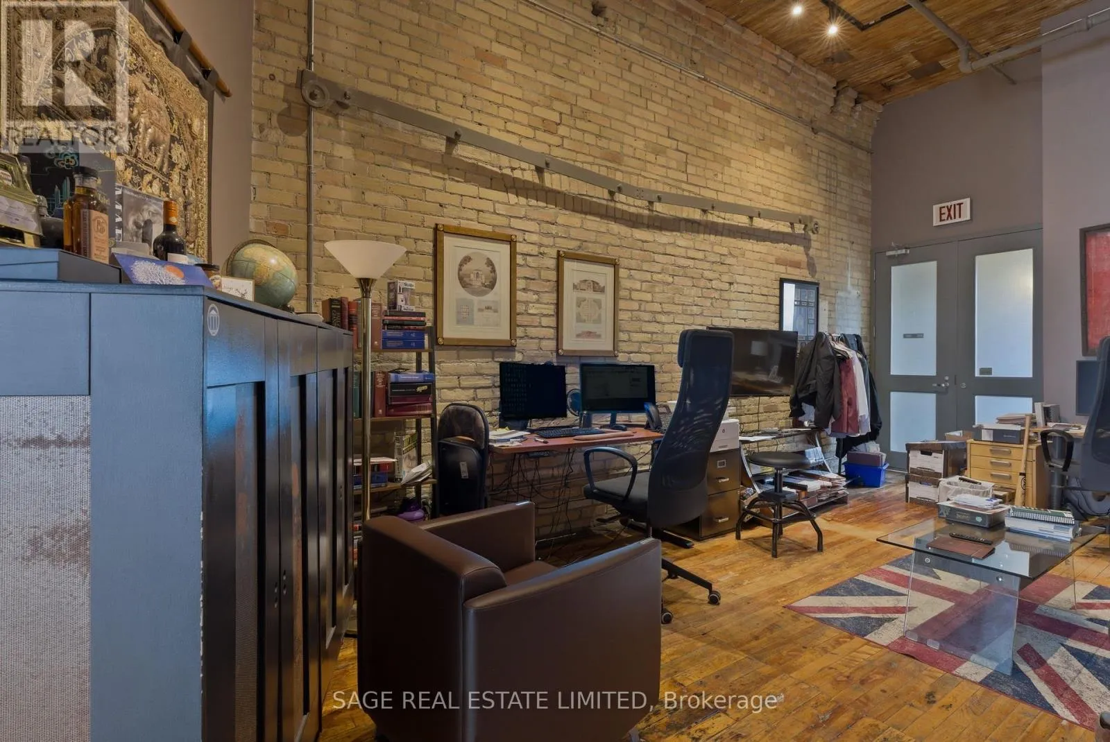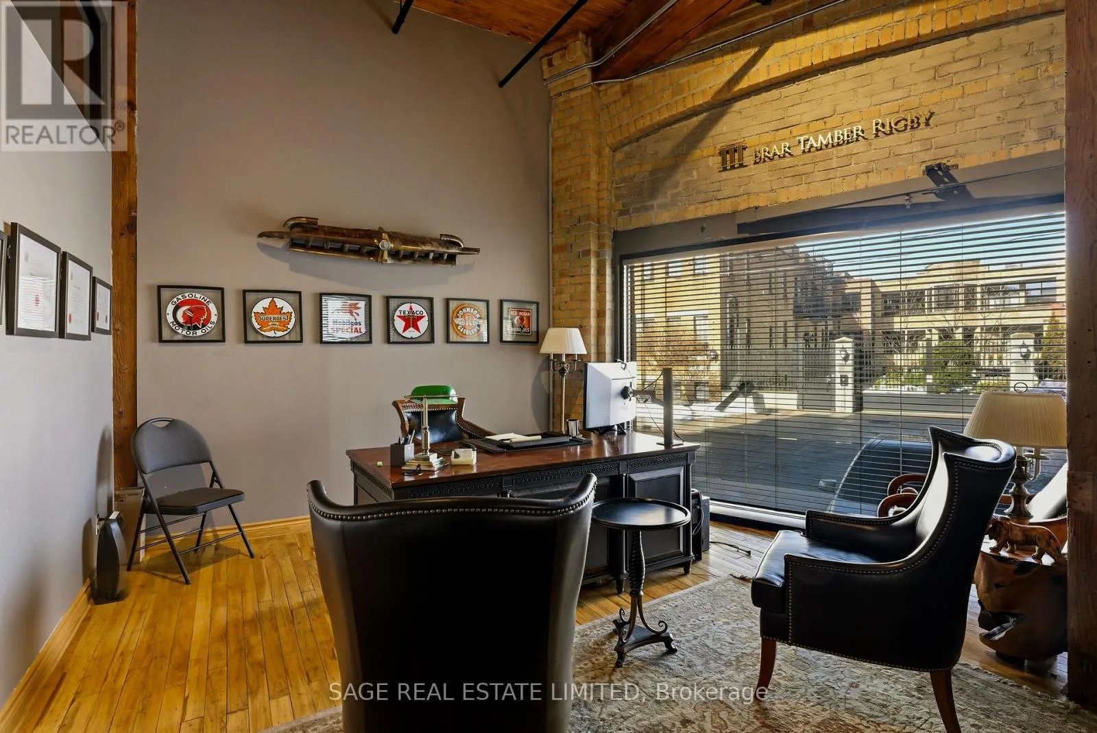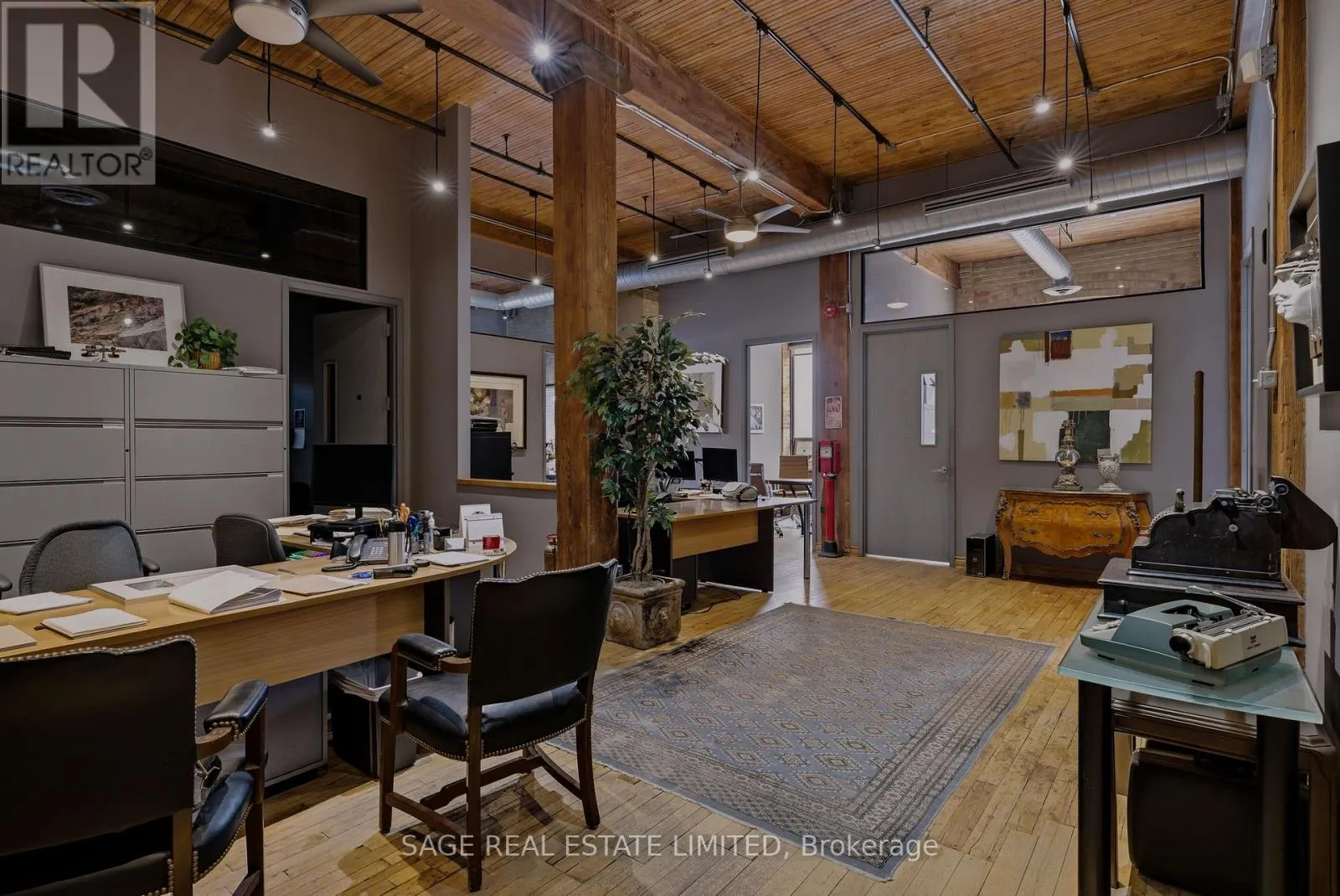 Roncesvalles / Dundas W Rare opportunity to share stunning professional office space in fully restored grand century hard loft warehouse located at the Galleries on Morrow Avenue. Exposed post and beam construction and brick walls, hardwood floors, soaring wood ceilings with massive windows and abundant natural light. Direct grade access from courtyard to 3000 ft. space featuring beautiful reception area with fireplace, large boardroom, kitchen and bathrooms, collating room, separate spacious exclusive office areas, and open concept area for support staff and/or workstations. Perfectly suited for lawyers, architects, engineers, psychologists, etc. Exclusive office spaces with all amenities starting at $1400 plus TMI and utilities plus HST and parking also available. Must be seen to be appreciated. (id:27476)
