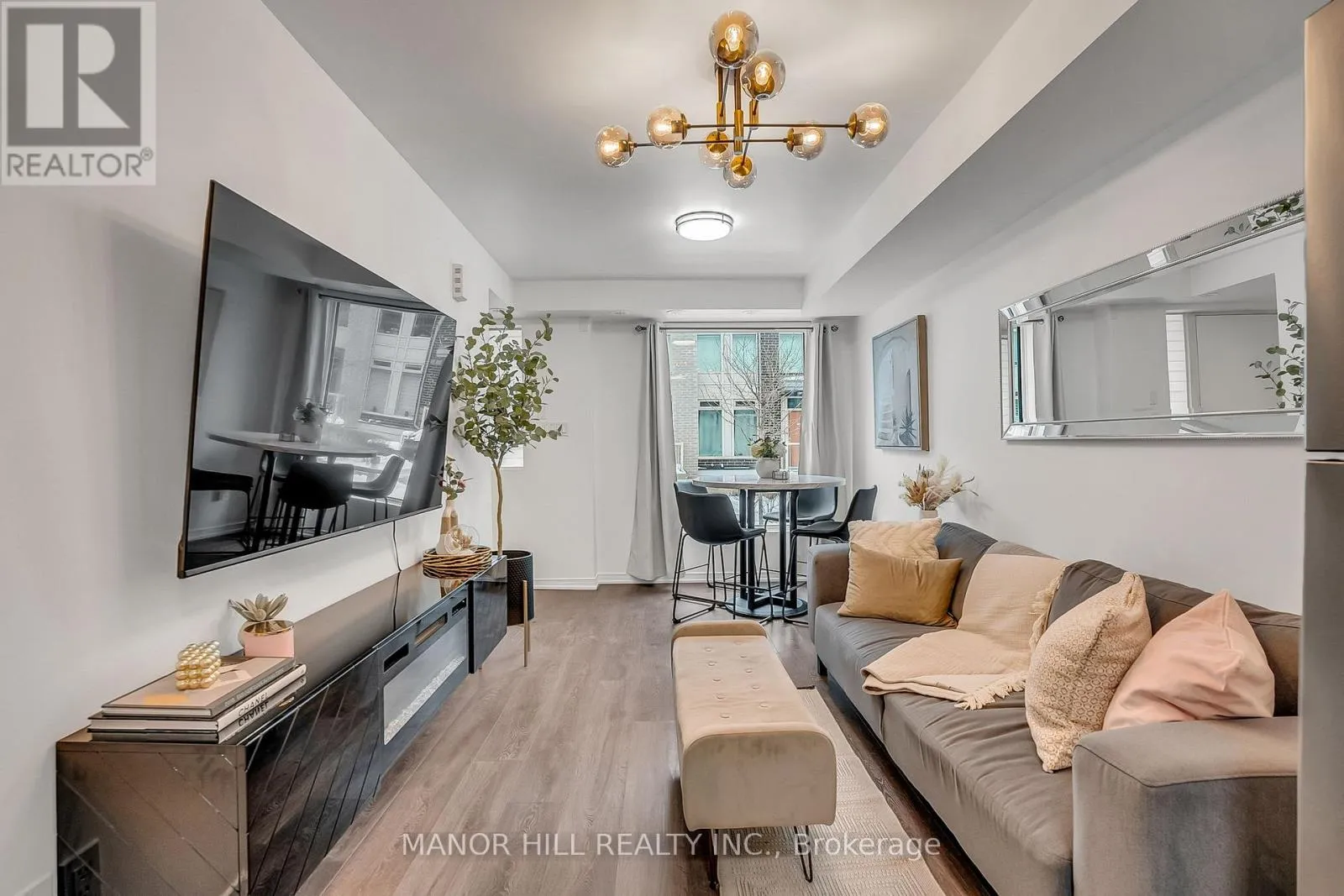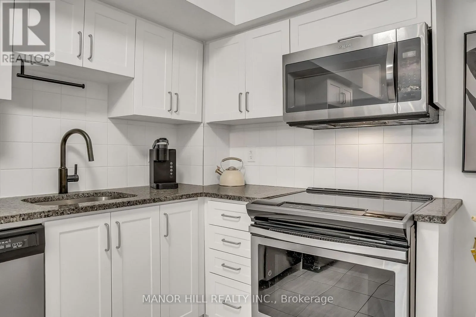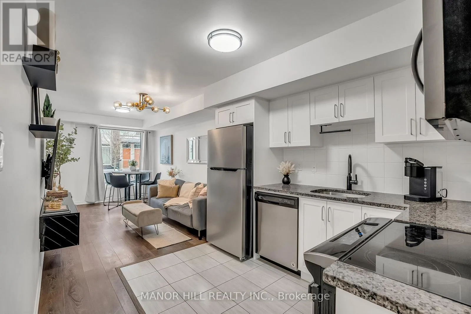 Cross Streets: Burnhamthorpe/427. ** Directions: GPS. Welcome home to this bright and airy above grade 2 bedroom 1 bathroom stacked townhouse. Open concept living space with functional kitchen. Well appointed with white cabinets, granite counters and stainless steel appliances makes this a dream kitchen to cook in. Living room features an electric fireplace with functional wall storage to maximize space. Functional sized bedrooms with ample closet space. Private balcony Low maintenance fees and courtyard outside your front door with underground and parking make this a perfect blend between living in a condo and house. conveniently located close to 427/401/Pearson and TTC (id:27476)