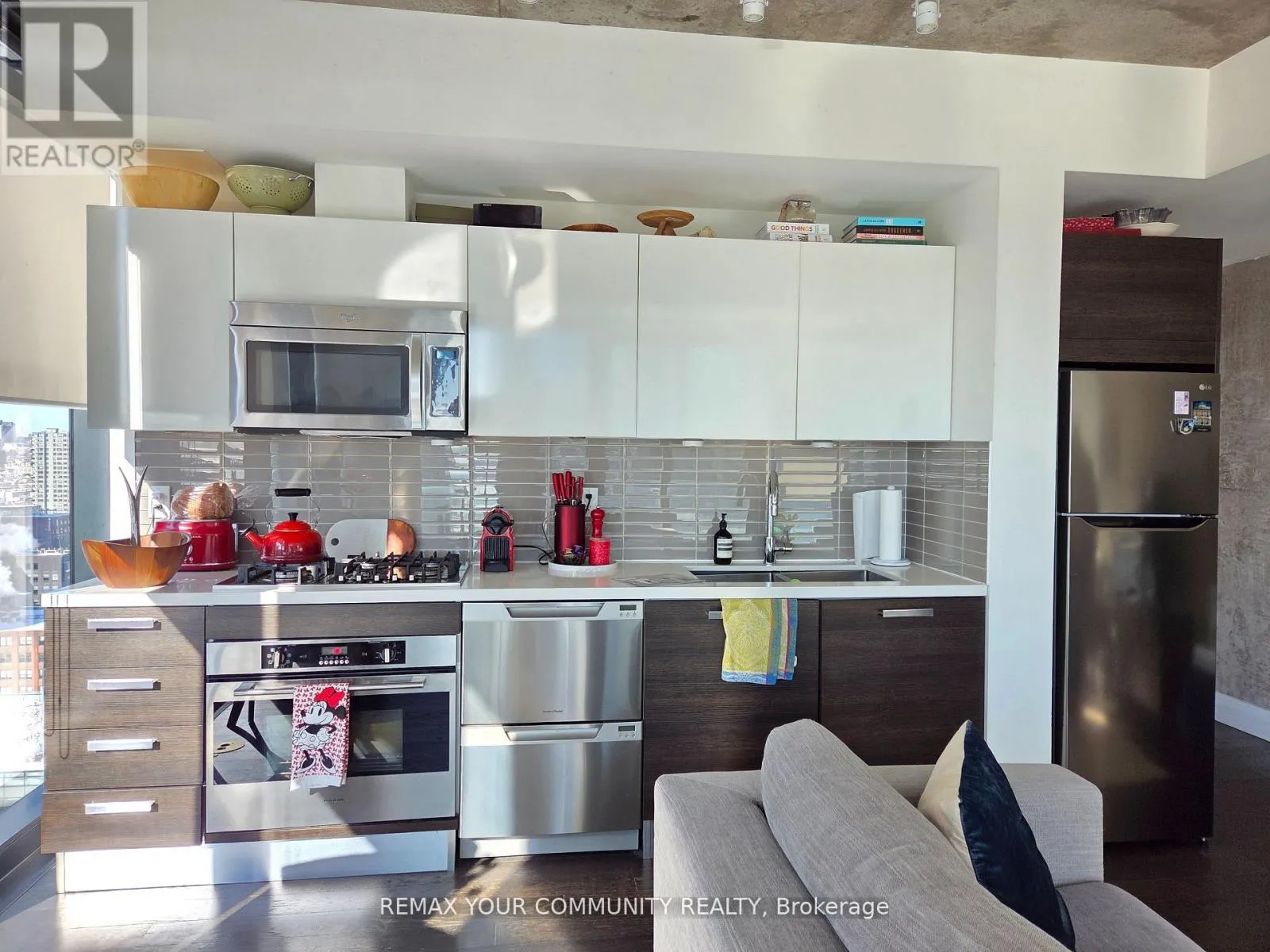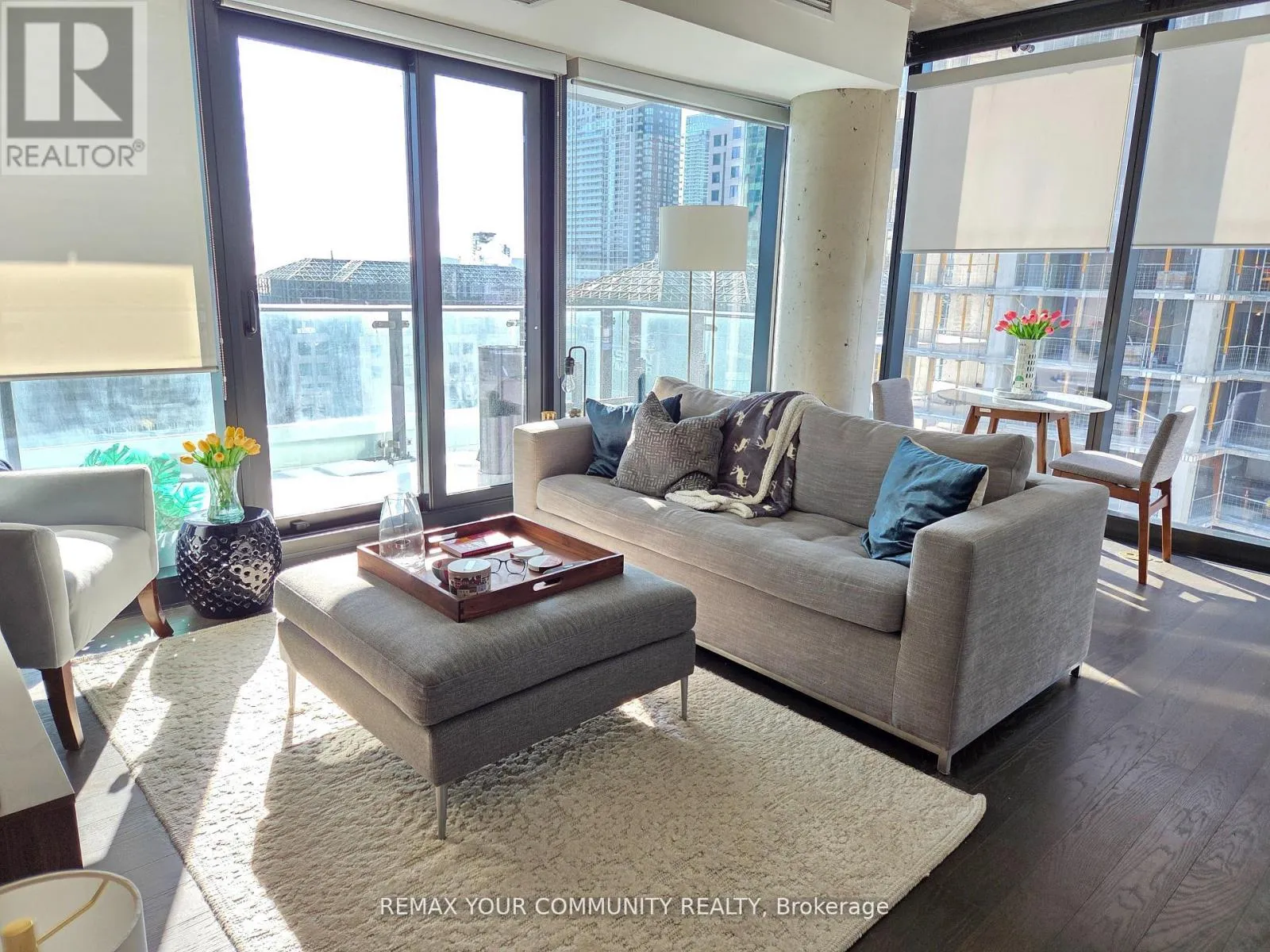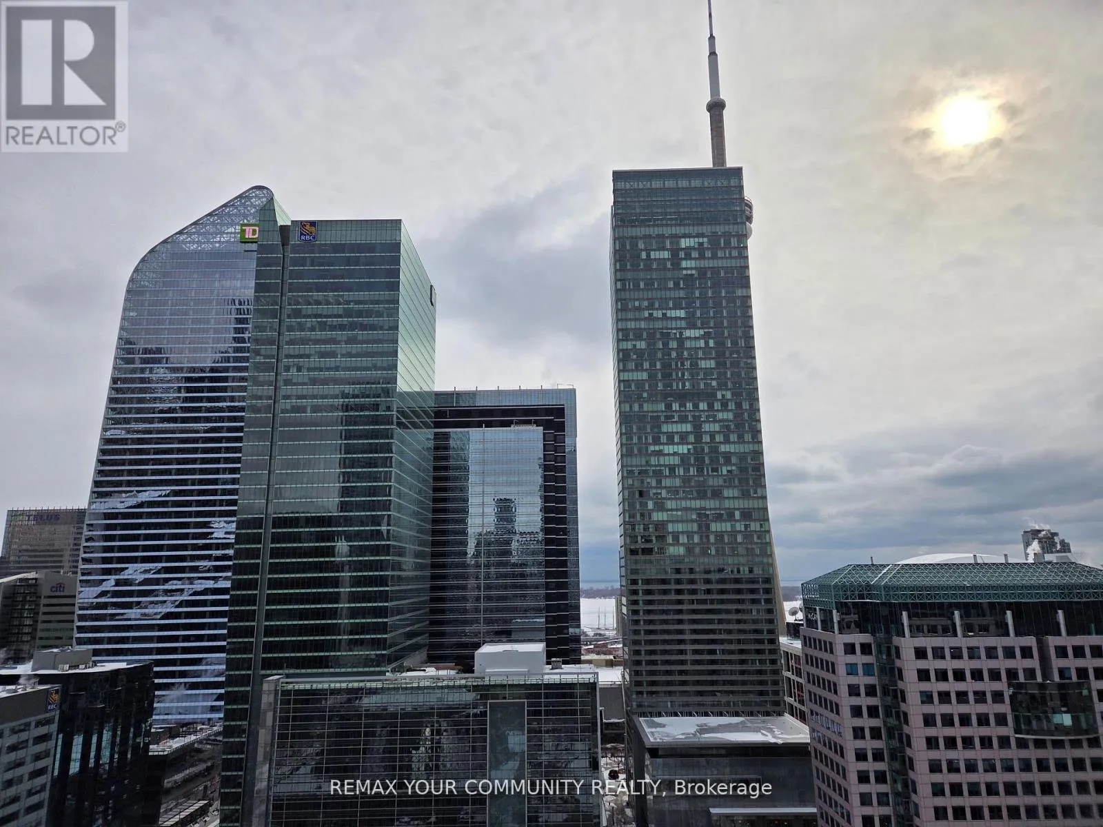 University/King A corner 2 bedroom condo with stunning views of the city, Lake Ontario, and CN Tower. Loft-like luxury of a prestigious Theatre Park Condos. Exposed concrete ceilings and feature walls, floor to ceiling windows. A gourmet kitchen with a gas cooktop and open shelves. Gas line on a spacious balcony, enjoy BBQ year round. Primary bedroom fits king sized bed. 2nd bedroom fit for a growing family or large home office with more spectacular views. Next door to Royal Alexandra Theatre, across from Roy Thompson Hall, steps to world famous King Street West restaurants. Walk score 100 out of 100!! Amenities include Outdoor pool, Gym, Party room, 24 hr concierge. (id:27476)