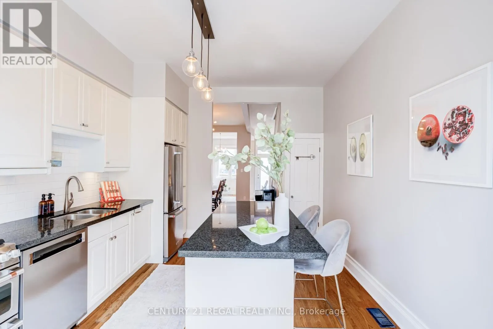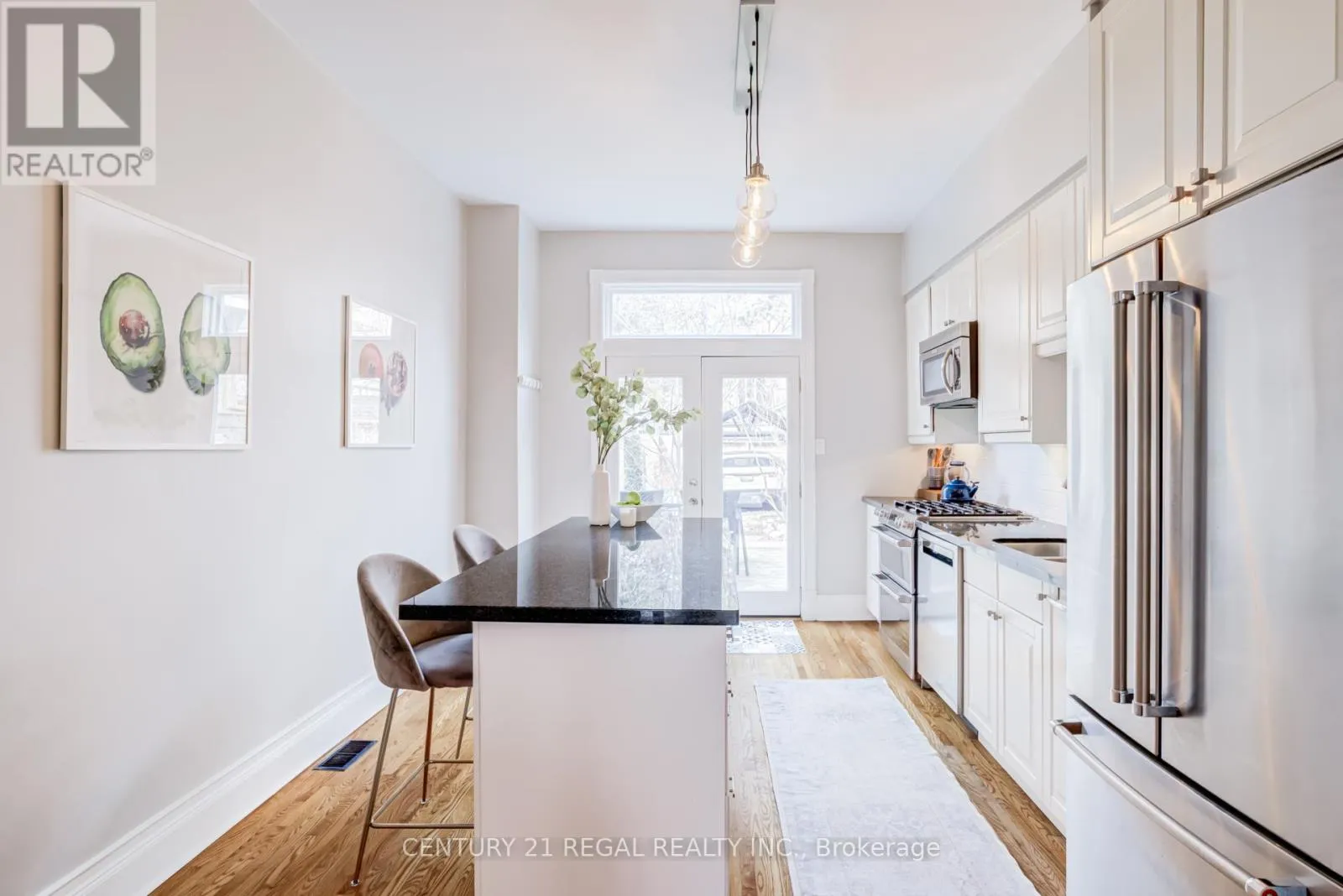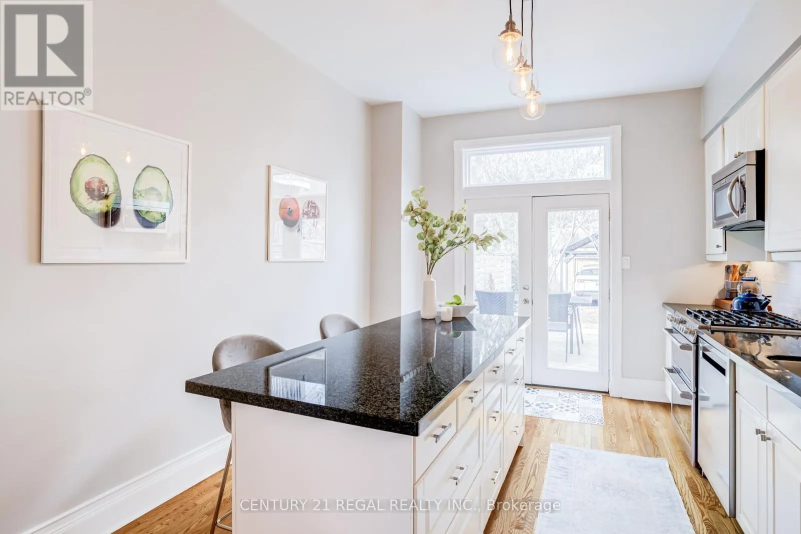 Dundas/Roncesvalles Discover the perfect blend of historic charm and modern luxury at 36 Golden Ave, a thoughtfully reimagined 2-storey, 3-bedroom Victorian hidden in a cul-de-sac within one of Toronto's most beloved neighborhoods. This stunning home offers an ideal entry point for young families or professionals seeking the vibrant, community-focused lifestyle of Roncesvalles. You're steps away from incredible, neighborhood cafes, restaurants, farmers markets, parks, and easy transit access. This classic, red brick beauty features an inviting yet chic exterior with new concrete slab, updated front door and new front windows. Ideal open concept living with tons of natural light, the main floor boasts high ceilings and a spacious layout. The renovated, Chef's kitchen features a fabulous, large, kitchen island with ample storage, timeless granite countertops, updated cabinetry with under-mount lighting, and premium appliances - including a new Cafe gas range with convection, double oven, 6 burners, and integrated griddle. Walk out through classic French doors to a low-maintenance, private backyard with gas line, perfect for fun bbqs all year long, or having a cup of coffee, enjoying the garden during warmer months in your private oasis. Includes coveted laneway access parking. The upper level boasts tranquil bedrooms. The primary bedroom has great storage with new closets and a cozy bay window banquette. The second bedroom offers added convenience with a full-size washer/dryer system. Enjoy your sleek, spa-like second-floor bathroom featuring a custom frameless glass shower, designer wall-mounted rain shower head, separate wand, Carrara-inspired tiles, and built in storage. The finished basement has brand-new flooring, a renovated 4-piece bathroom, and an upgraded underground sewer system with back flow valve/preventor (2023). This turn-key home offers everything you need to live in one of the most sought-after neighborhoods in the city. (id:27476)