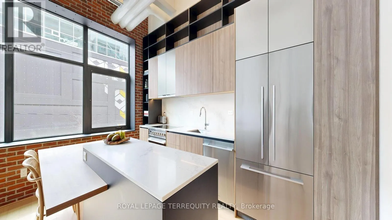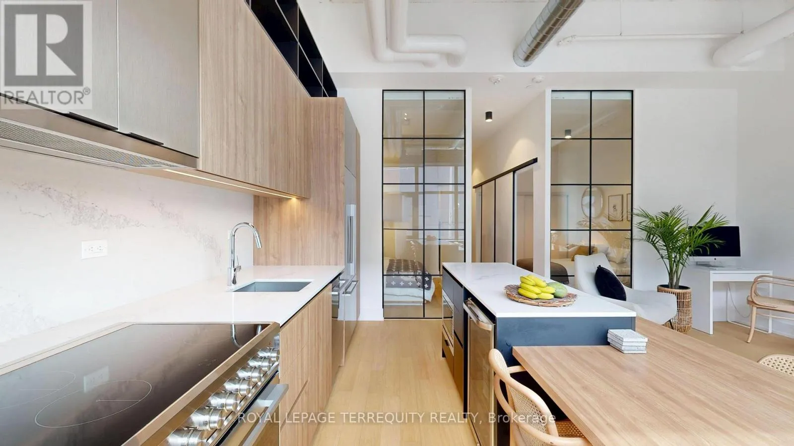 Cross Streets: Eastern/Logan. ** Directions: Eastern/Queen St. to Logan Ave. Welcome to Unit 204 at 150 Logan Avenue-a rare hard loft that blends authentic character with everyday livability, perfectly positioned at Wonder Condos in the heart of Leslieville.Situated within the original heritage portion of the former bread factory, this loft showcases true industrial character with exposed brick, steel beams, ductwork, and soaring 13-ft ceilings. Spanning 910 sq ft, the open-concept layout features engineered hardwood flooring throughout and a thoughtfully designed modern kitchen with quartz countertops, an integrated dining table, and full-size Fisher & Paykel appliances.Two well-proportioned bedrooms offer floor-to-ceiling windows and ample storage. The primary suite includes a sleek 3-piece ensuite.Enjoy premium amenities including a rooftop terrace with BBQs, modern fitness centre, co-working hub, family room-ideal for young families-and a convenient dog-washing station. Steps to top restaurants, cafés, breweries, and minutes to downtown, with future access to the Ontario Line enhancing connectivity and long-term value-offering the perfect blend of character, convenience, and modern urban living. (id:27476)