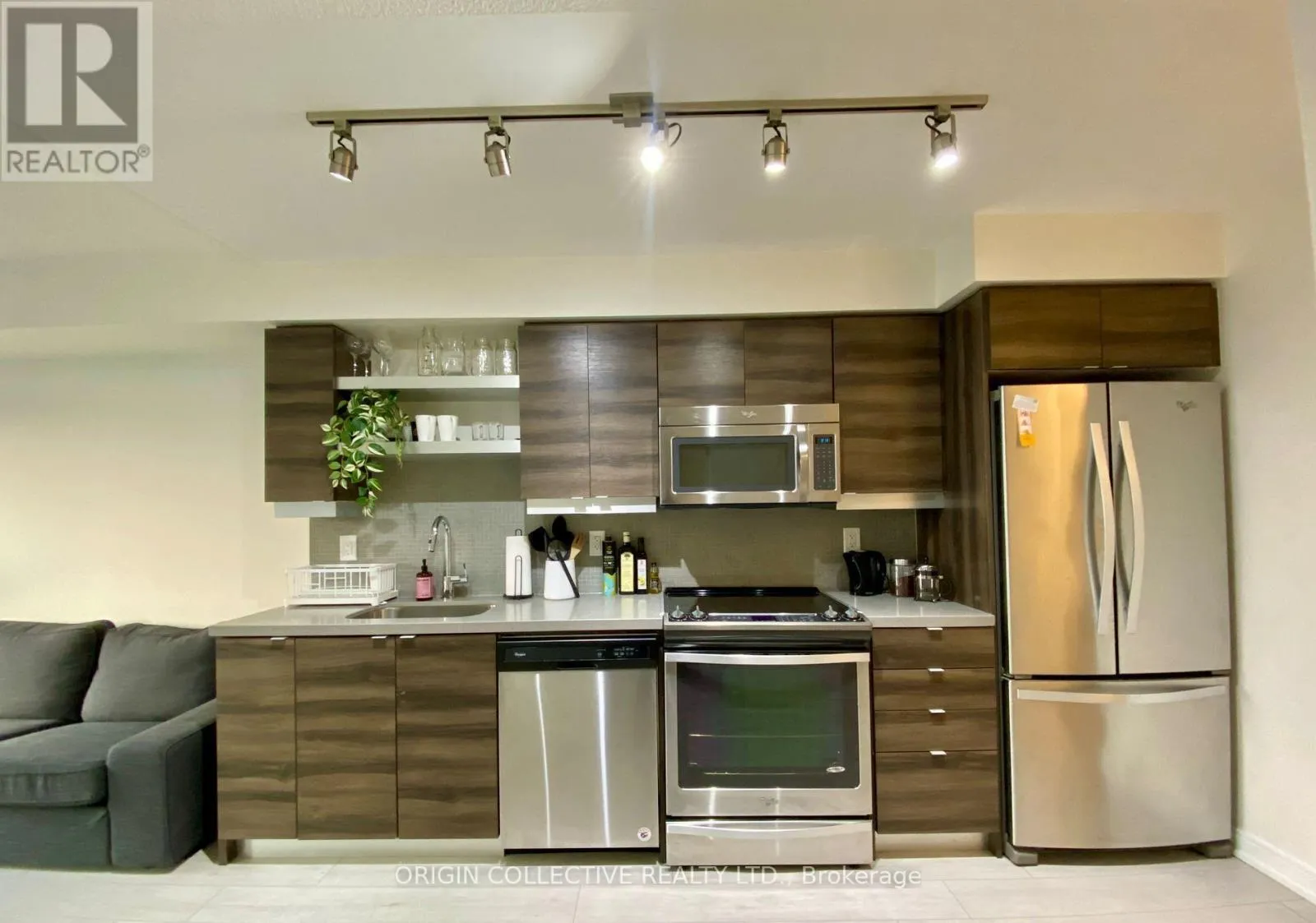 Bathurst And Adelaide St W Rare corner suite at Musée - two exposures, exceptional natural light, and one of the most sought-after layouts in the building. This 1-bedroom + den, 2-bathroom condo spans 721 sq ft with floor-to-ceiling windows, wide-plank hardwood floors, and 9-ft ceilings throughout. The open den works perfectly as a home office or guest nook. The kitchen features dark walnut cabinetry, floating shelves, stone countertops, and a full suite of stainless steel appliances. The primary bedroom includes a private ensuite. Step out from the living room onto your private balcony. Two full bathrooms - a genuine rarity at this price point. One locker included.Resort-style amenities include an outdoor pool, hot tub, rooftop deck with BBQs, fully equipped gym, party room, theatre, and guest suites - with 24-hr concierge. Tucked in the heart of King West, steps to the city's best dining, cafés, and nightlife, with TTC at your door.Available partially furnished - inquire for details. (id:27476)