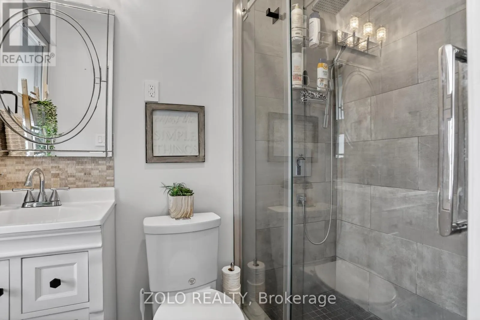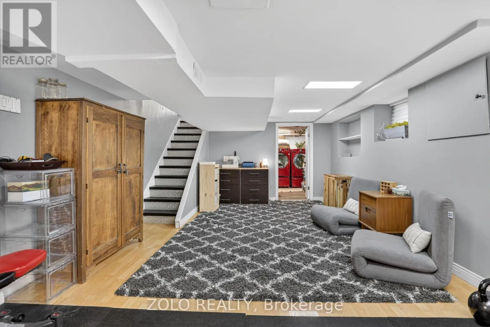 Cross Streets: PAPE & DANFORTH. ** Directions: E OF PAPE, SOUTH OF DANFORTH. This stunning beauty delivers 3 bedrooms, 3 bathrooms, and a spacious rec area in the basement with it's own bathroom. Approximately 1,300 square feet above grade. The main floor is an entertainer's dream, featuring an opened concept layout boasting a lovely kitchen with a party sized breakfast bar, gas stove, granite counters, stainless steel appliances, pot light lighting, and the coveted combination of a main-floor full washroom, (perfect for multi-gen families) and double front hall closet. Upstairs, the king-size primary bedroom boasts a built-in closet, while the second bedroom impresses with a built-in closet plus the convenience of a large hallway closet. The main floor office nook, perfect for family downtime or working from home. Rec room in the basement can function as another bedroom or in-law suite. Outside, enjoy a fenced backyard, large deck, and private parking. Upgrades include Hardwood floors on main & 2nd, Updated Stairs & Railings. Porch & Deck upgraded to composite. Added Landscaping, Vinyl siding with insulation on side and back of house. New front door + new Front & Dining room windows. Upgraded all light fixtures. Zebra blinds throughout. Many USB plugs and screw less light covers throughout. Upgraded Eavestrough with gutter guards, soffits & Fascia. Situated in the sought-after Frankland school district and just steps to the subway, shops, and restaurants, this home blends luxury, lifestyle, and unbeatable convenience in the heart of Pape/Danforth. Note: clever garbage bin storage under the porch. (id:27476)