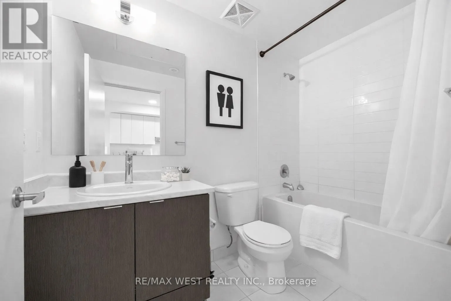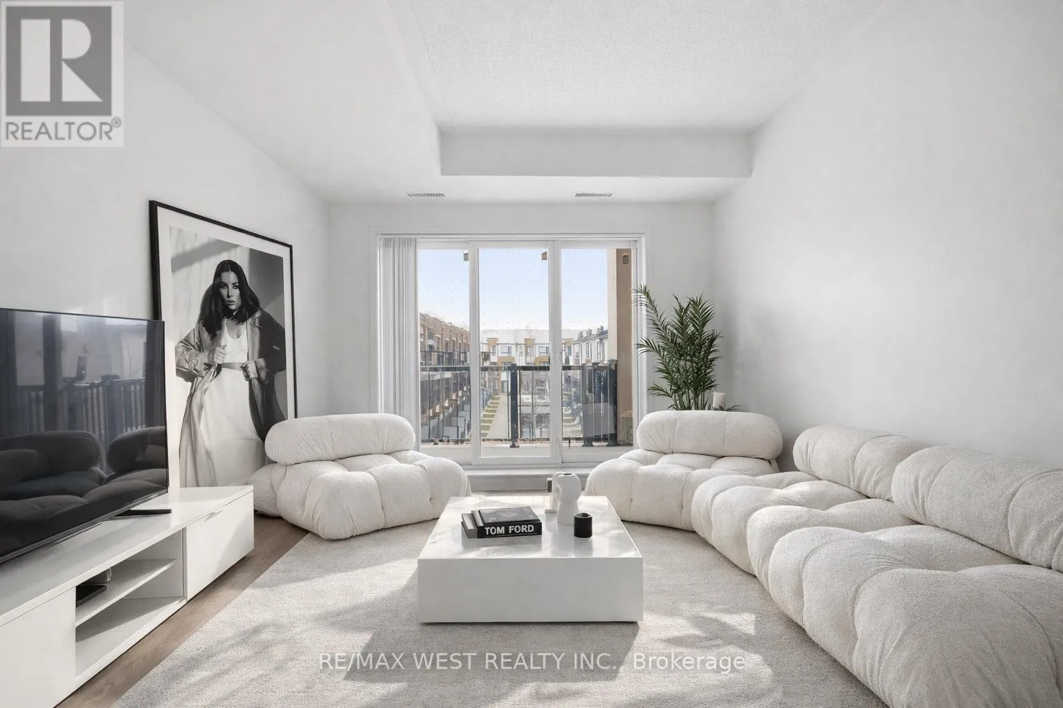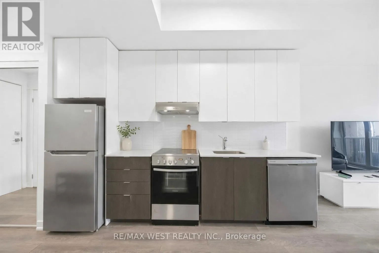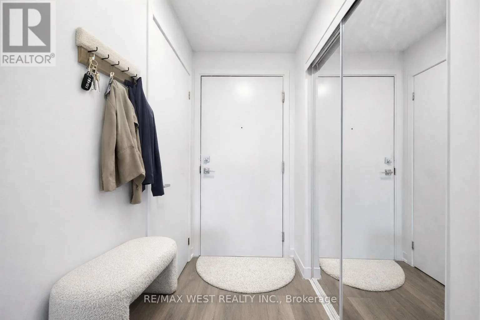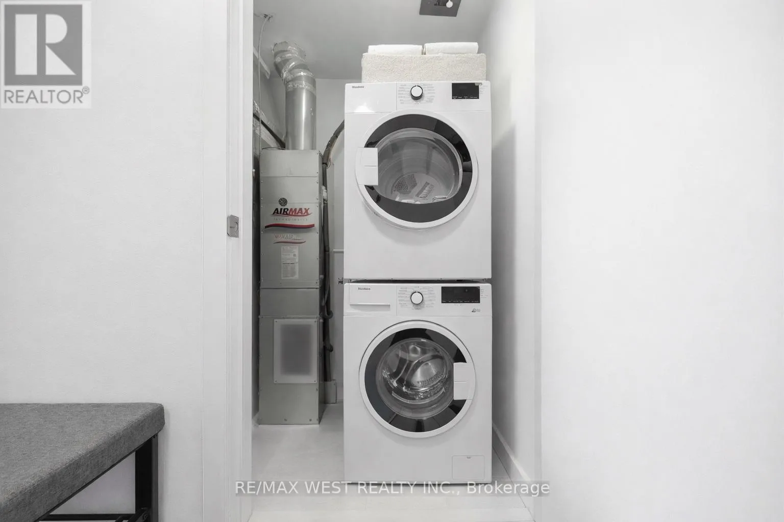 Keele St & Eglinton West Beautiful newer-built (2022) 1-bedroom condo offering 583 sq ft of interior space plus a 71 sq ft balcony, complete with parking & locker! This stunning condo offers a bright open-concept layout, complete with hardwood flooring and soaring ceilings. Designed for both comfort and functionality, the unit features convenient ensuite laundry with a stacked washer and dryer. Located in the sought-after Daniels Keelesdale community, residents enjoy a full range of premium amenities, including a dedicated two-storey amenity building featuring a fitness centre, party room, co-working space, BBQ area, pet wash station, and beautifully maintained gardening plots. Perfectly positioned for convenience, you're just steps to the LRT and public transit, with quick access to the GO Train, Hwy 401, Yorkdale Mall, Pearson Airport, parks, cycling trails, and fitness facilities. (id:27476)