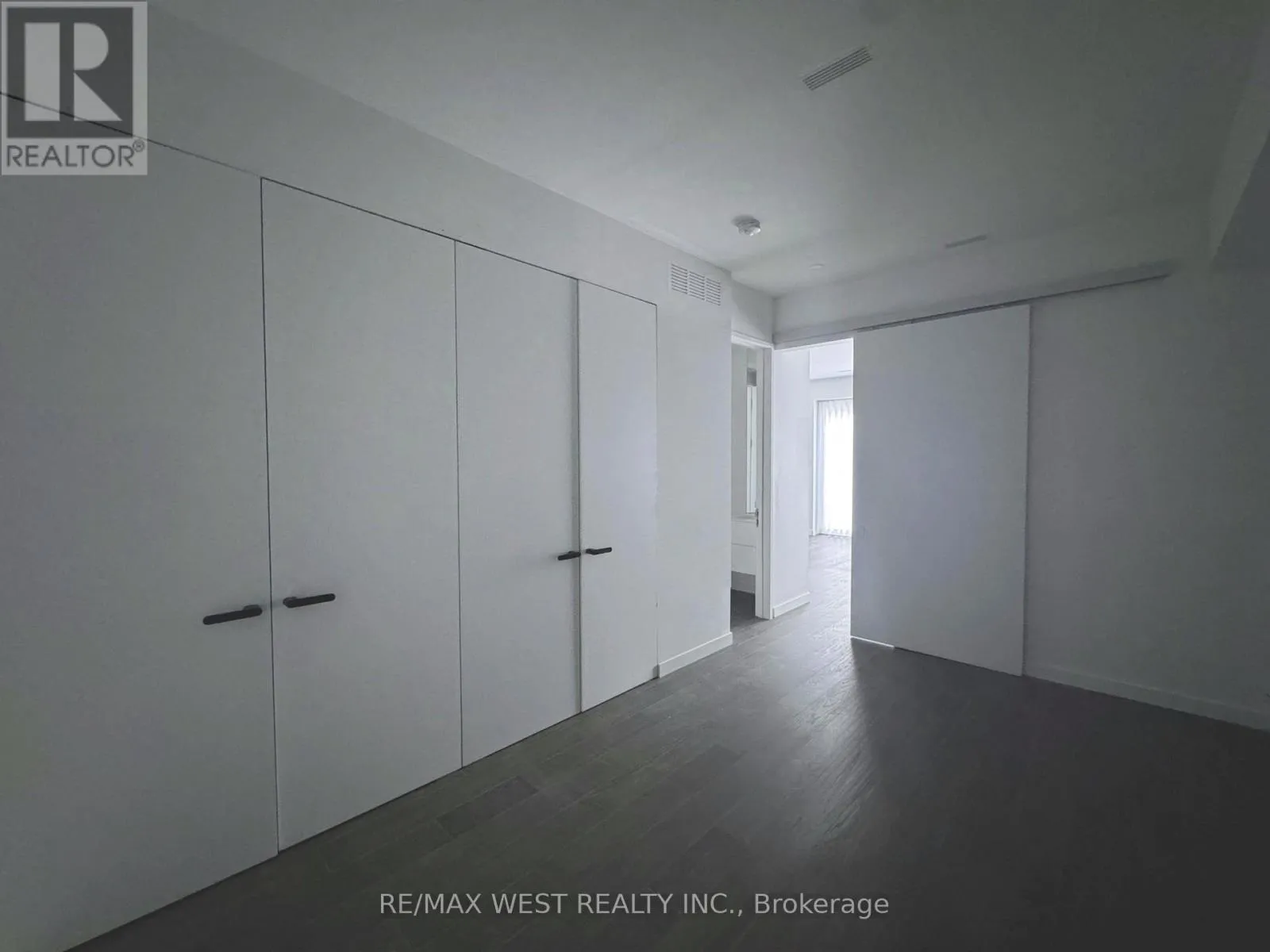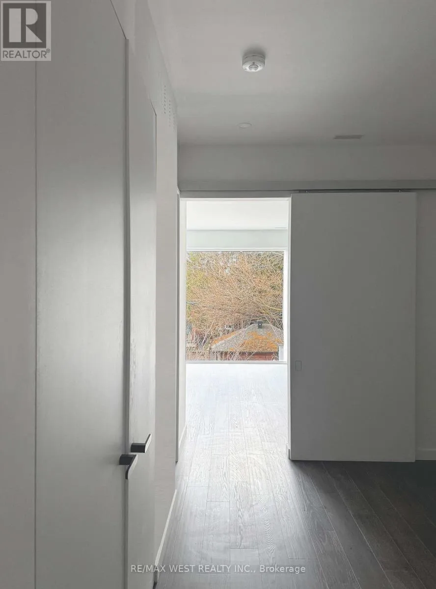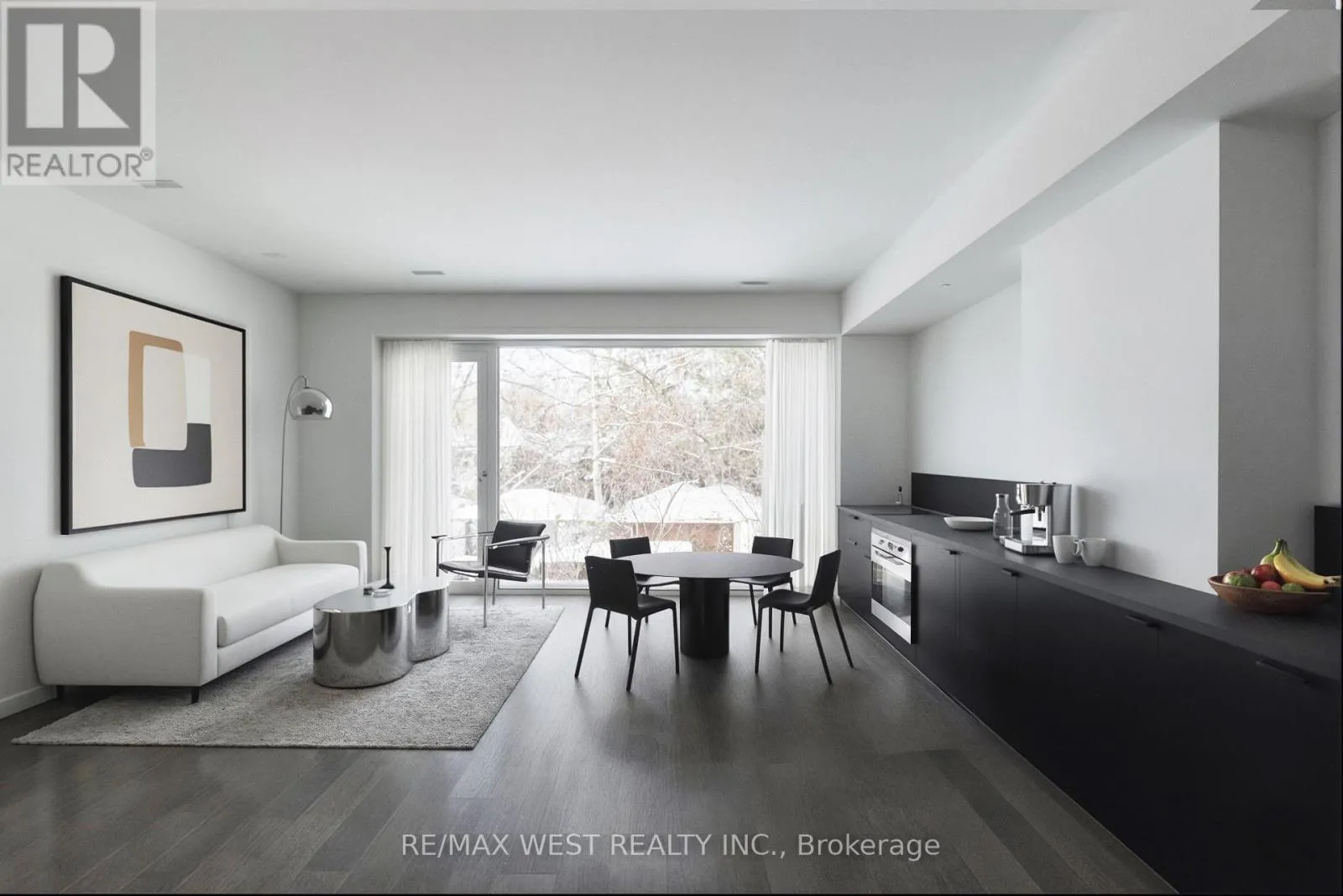 South of Harbord On Markham Rare opportunity in the heart of Palmerston-Little Italy. This never-occupied one-bedroom suite occupies the second floor of a distinguished Victorian red-brick, delivering a striking juxtaposition of heritage architecture and precision-designed contemporary interior. Soaring ceilings and floor-to-ceiling windows flood the open-concept living space with natural light, framing a leafy, tree-lined outlook. Wide-plank hardwood throughout. The kitchen is a seamless wall of matte black cabinetry and honed stone, flush-mounted induction cooktop, integrated oven, downdraft ventilation. The bedroom is generously proportioned with a full wall of custom built-in wardrobes. The bathroom features a floating vanity, floor-to-ceiling mirror, dark marble tile, and a glass-enclosed rainfall shower. In-unit laundry. Central air. First occupant. Steps to College Street, Ossington, and Bickford Park. (id:27476)