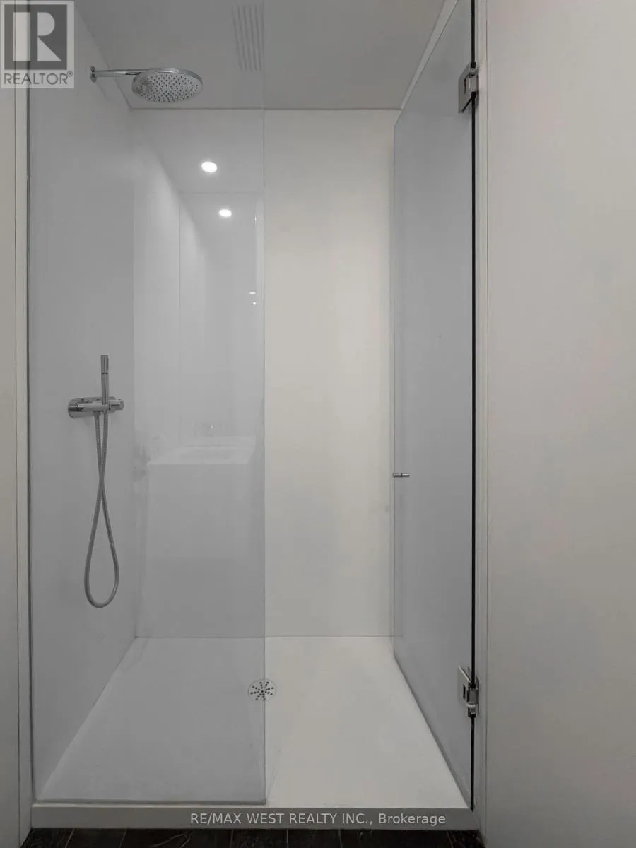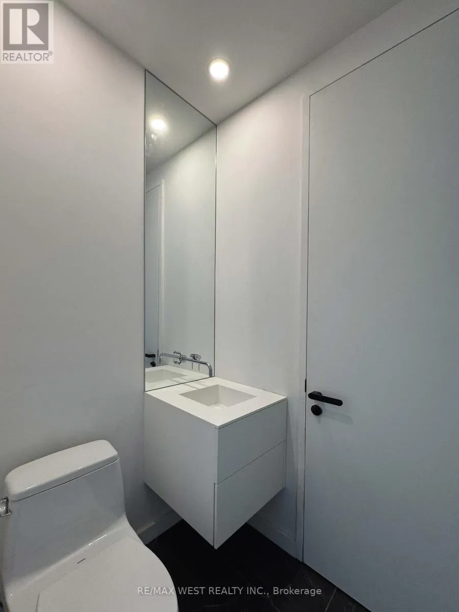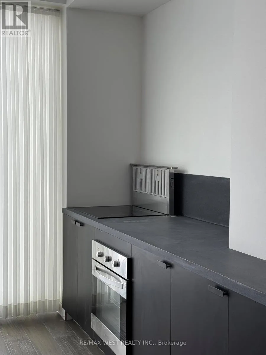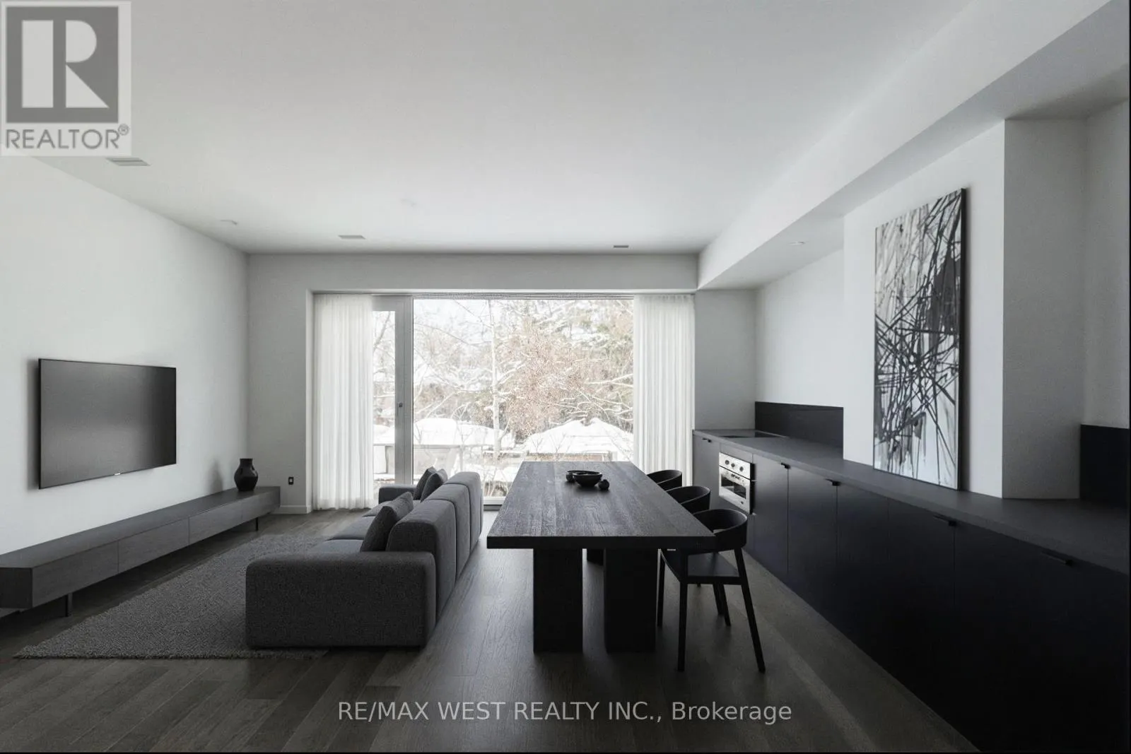 South of Harbord On Markham Rare opportunity in the heart of Palmerston-Little Italy. This never-occupied one-bedroom suite occupies the second floor of a distinguished Victorian red-brick, delivering a striking juxtaposition of heritage architecture and precision-designed contemporary interior. Soaring ceilings and floor-to-ceiling windows flood the open-concept living space with natural light, framing a leafy, tree-lined outlook. Wide-plank hardwood throughout. The kitchen is a seamless wall of matte black cabinetry and honed stone, flush-mounted induction cooktop, integrated oven, downdraft ventilation. The bedroom is generously proportioned with a full wall of custom built-in wardrobes. The bathroom features a floating vanity, floor-to-ceiling mirror, dark marble tile, and a glass-enclosed rainfall shower. In-unit laundry. Central air. First occupant. Steps to College Street, Ossington, and Bickford Park. (id:27476)