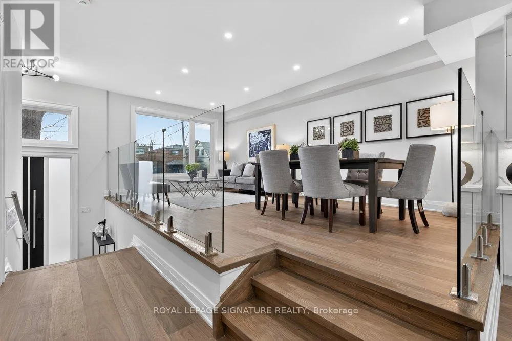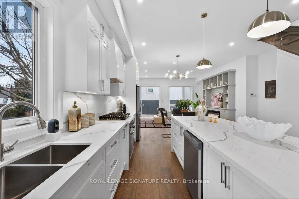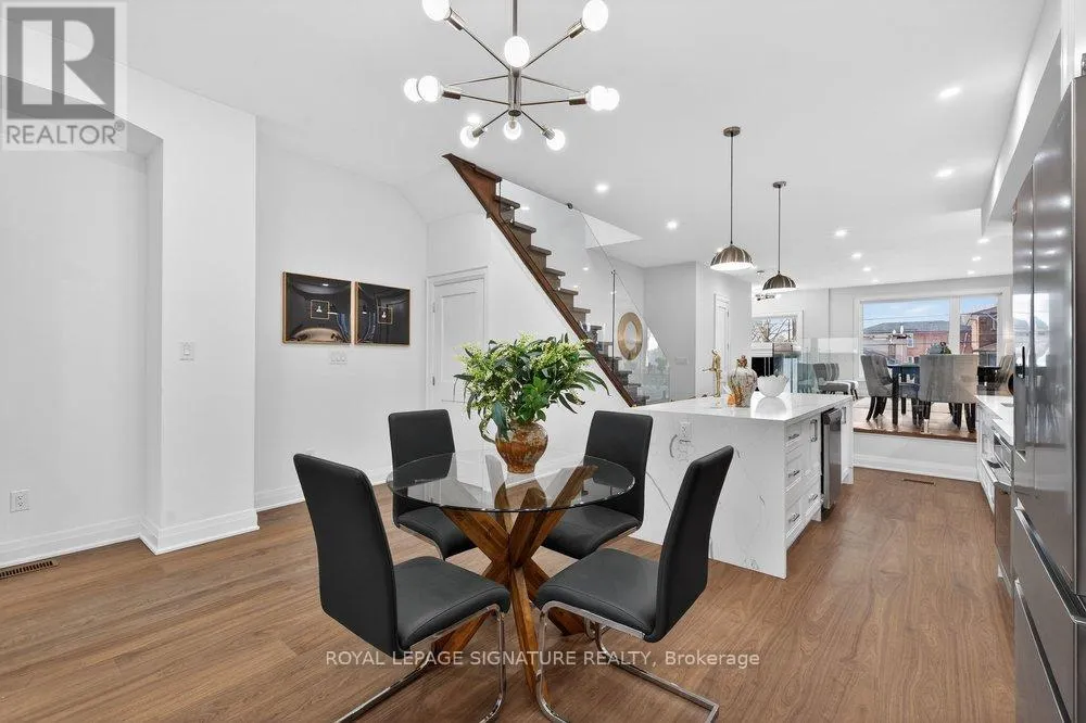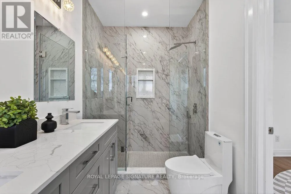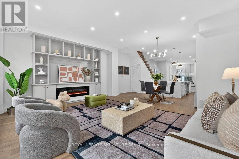 Warden Ave & Danforth Ave Welcome to an extraordinary custom-built residence in the heart of Oakridge. This stunning 4+1 bed, 5-bath home offers approx 2,400 sqft above grade, showcasing impeccable craftsmanship, premium finishes, and thoughtfully curated design throughout. Step inside to a sun-drenched open-concept main floor, the expansive living and dining areas are framed by oversized windows and adorned with rich hardwood flooring, creating a warm and inviting ambiance. At the heart of the home lies a chef-inspired kitchen, complete with a grand centre island with breakfast seating, sleek stainless steel appliances, and an abundance of custom cabinetry and storage. The family room reveals a striking focal point, a grand fireplace flanked by bespoke built-in shelving, while a charming Juliet balcony overlooks the private backyard. Ascend to the second level where the lavish primary suite serves as a true retreat, featuring a spacious walk-in closet and a spa-inspired 7-piece ensuite with an oversized glass shower, deep soaker tub, and an expansive double vanity designed for ultimate indulgence. Three additional generously sized bedrooms offer ample closet space and share access to beautifully appointed bathrooms. A convenient laundry room and stunning skylight enhance both functionality and natural light. The fully finished basement, boasting impressive ceiling height and a separate entrance, offers exceptional versatility, with a large recreation area, an additional bedroom and a modern 4-piece bath. Basement also includes a rough-in for a kitchen for rental potential! Completing this remarkable home is a built-in garage and a beautifully interlocked driveway. Just moments from Danforth Ave, this residence is within minutes if TTC, top-rated schools, shopping, parks, the GO Transit, and the breathtaking Scarborough Bluffs. (id:27476)