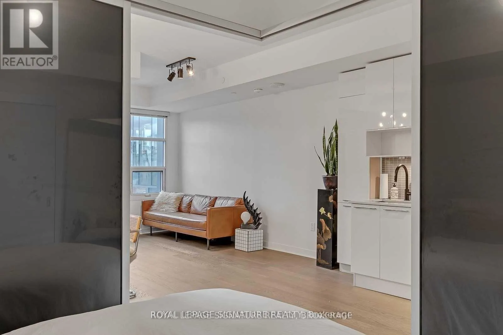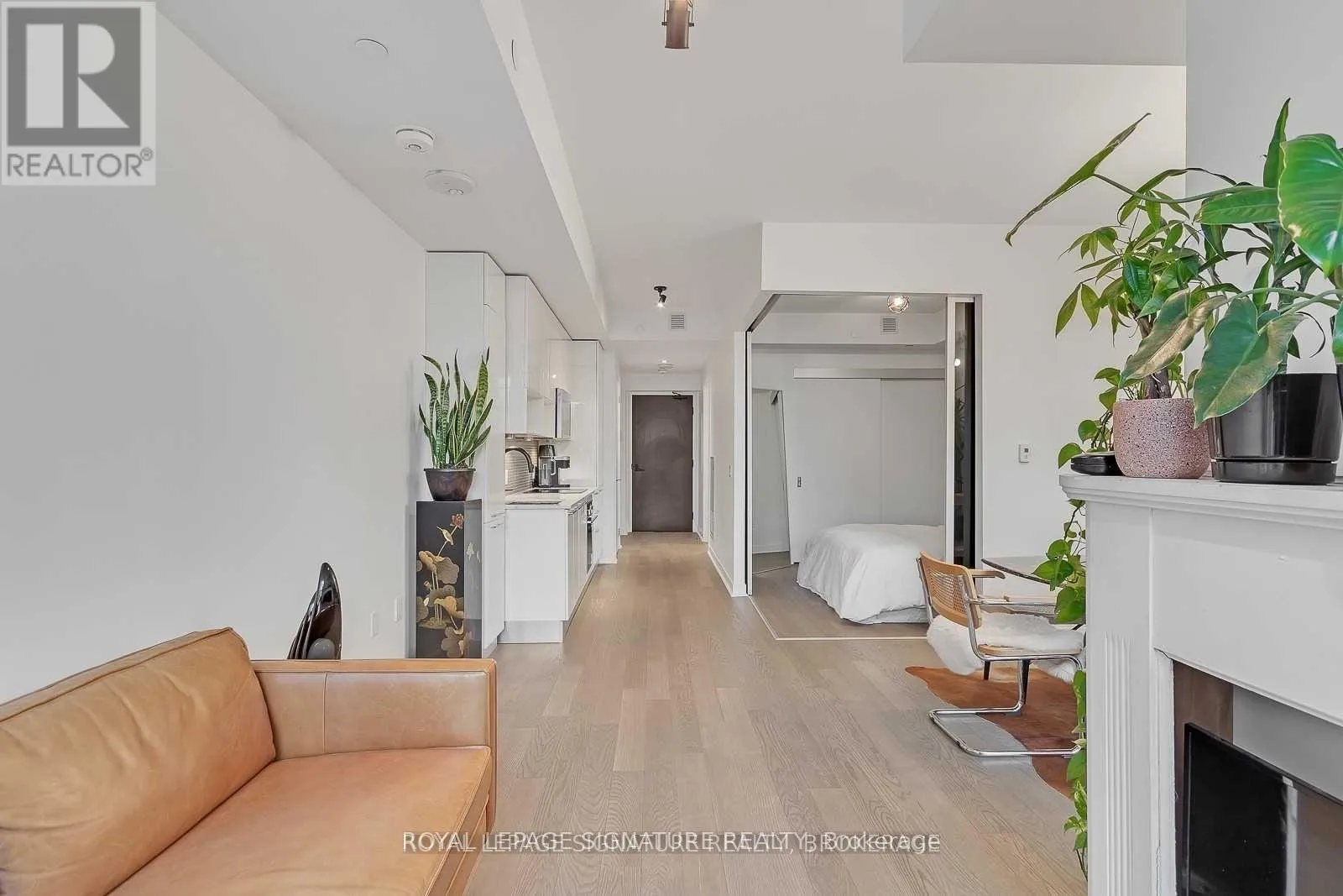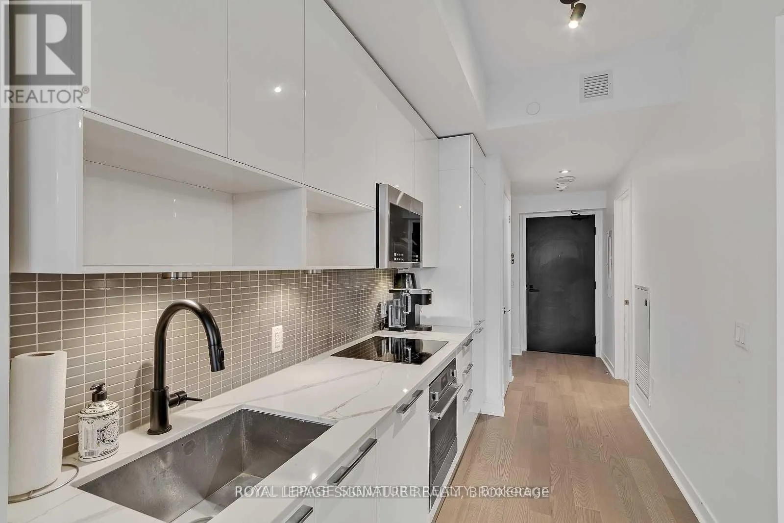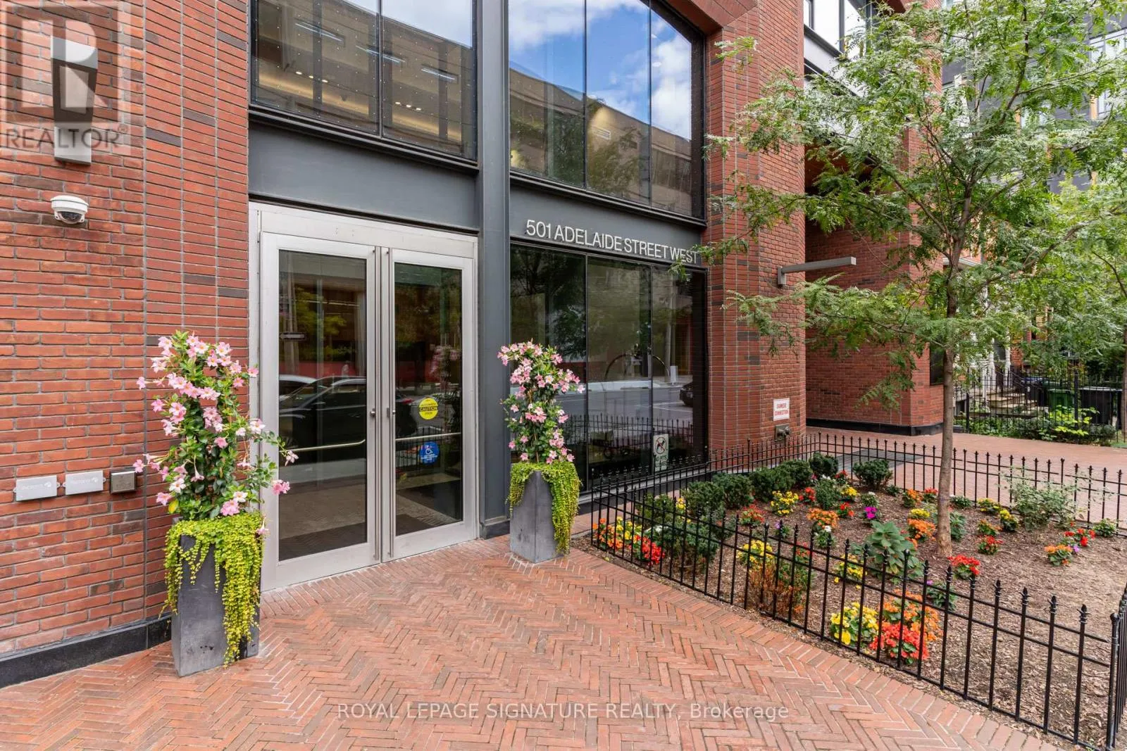 Cross Streets: Adelaide St W/Portland St. ** Directions: Adelaide / Portland. Experience the best of King West living at the highly coveted Kingly Condos at King & Portland. This exceptional 1-bedroom suite offers incredible value with thoughtful upgrades and a spacious open-concept layout designed for modern city living.The suite features expansive New York-style warehouse windows, 9-ft smooth ceilings, and wide plank flooring throughout, creating a bright and stylish atmosphere. The custom Scavolini kitchen is a standout, complete with full-sized integrated/panelled stainless steel appliances, natural stone counters, subway tile backsplash, and an additional custom pantry for extra storage.The lengthy open-concept living and dining area is perfect for entertaining, enhanced by floor-to-ceiling windows that bring in abundant natural light and offer versatile layout options. The primary bedroom is smartly enclosed with frosted glass sliding doors and features a double closet. Relax in the spa-inspired 4-piece bathroom finished with modern tile, a stone vanity, mirrored medicine cabinet, extra shelving, and a luxury 2-in-1 shower/tub. Step out onto your private balcony to enjoy sensational sunrise views, and take advantage of the included locker for added convenience.Residents enjoy state-of-the-art amenities, including a fitness centre and gym, rooftop deck, party and meeting rooms, and 24-hour concierge. Located just steps from Toronto's hottest restaurants, cafes, nightlife, and shopping, this is King West living at its finest. Live like royalty at The Kingly. (id:27476)