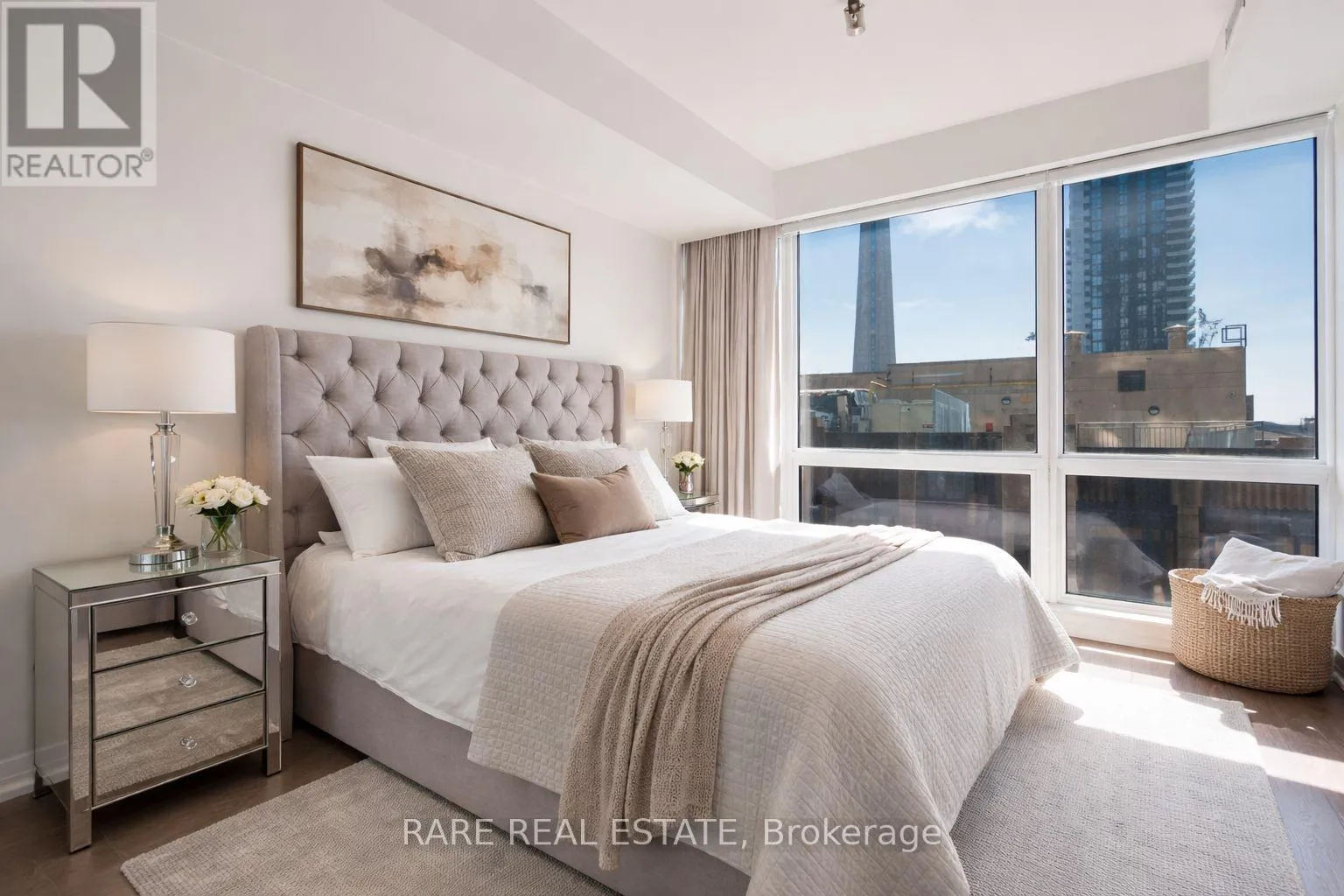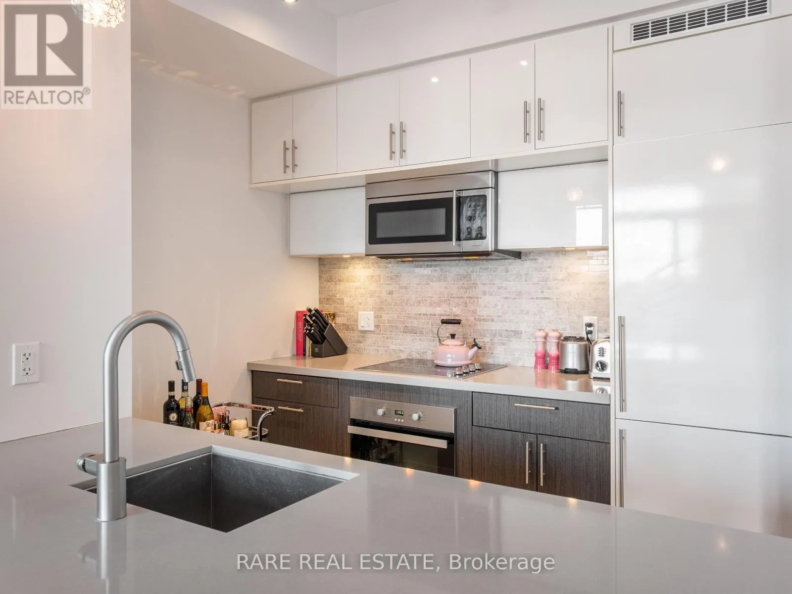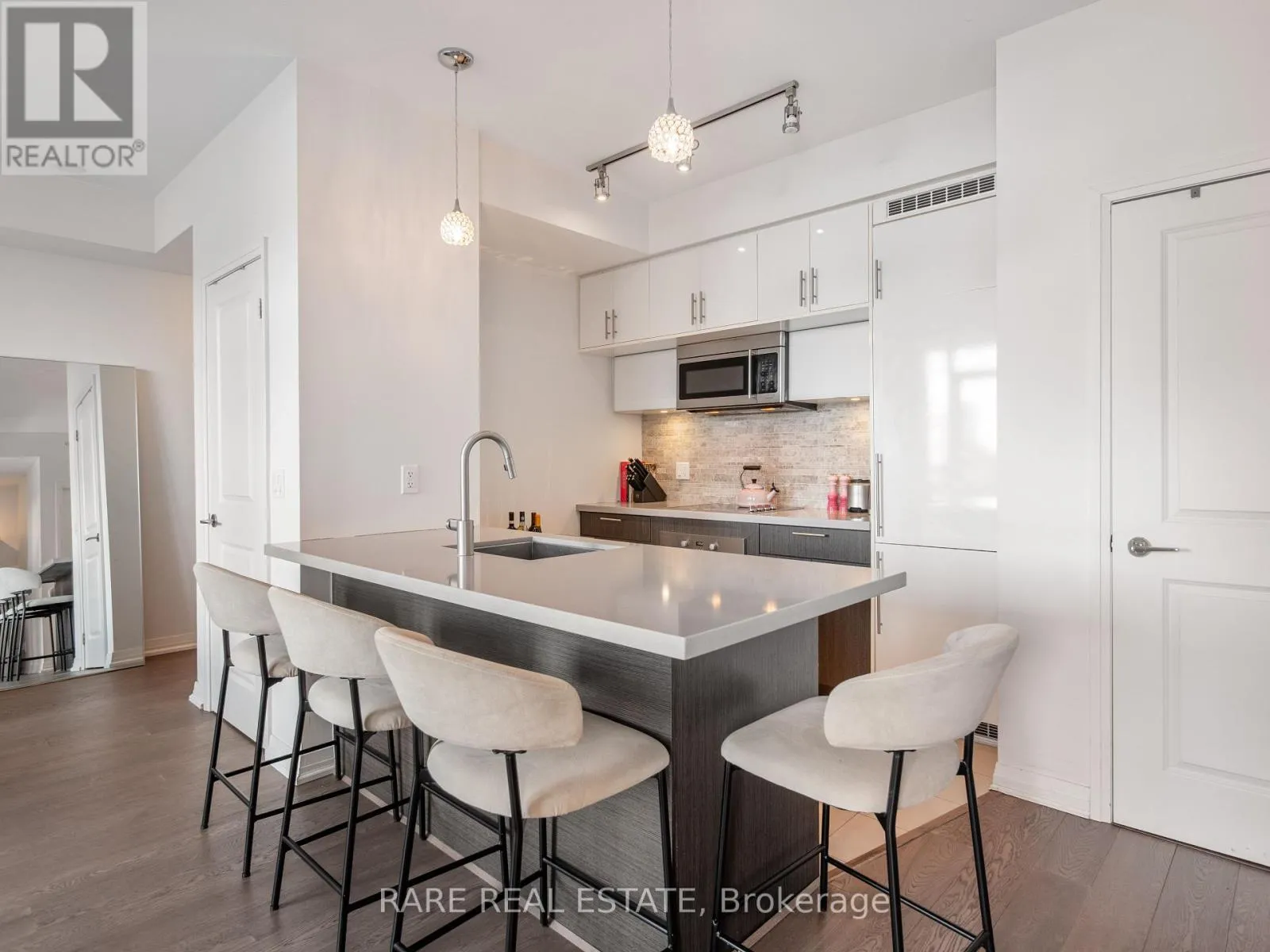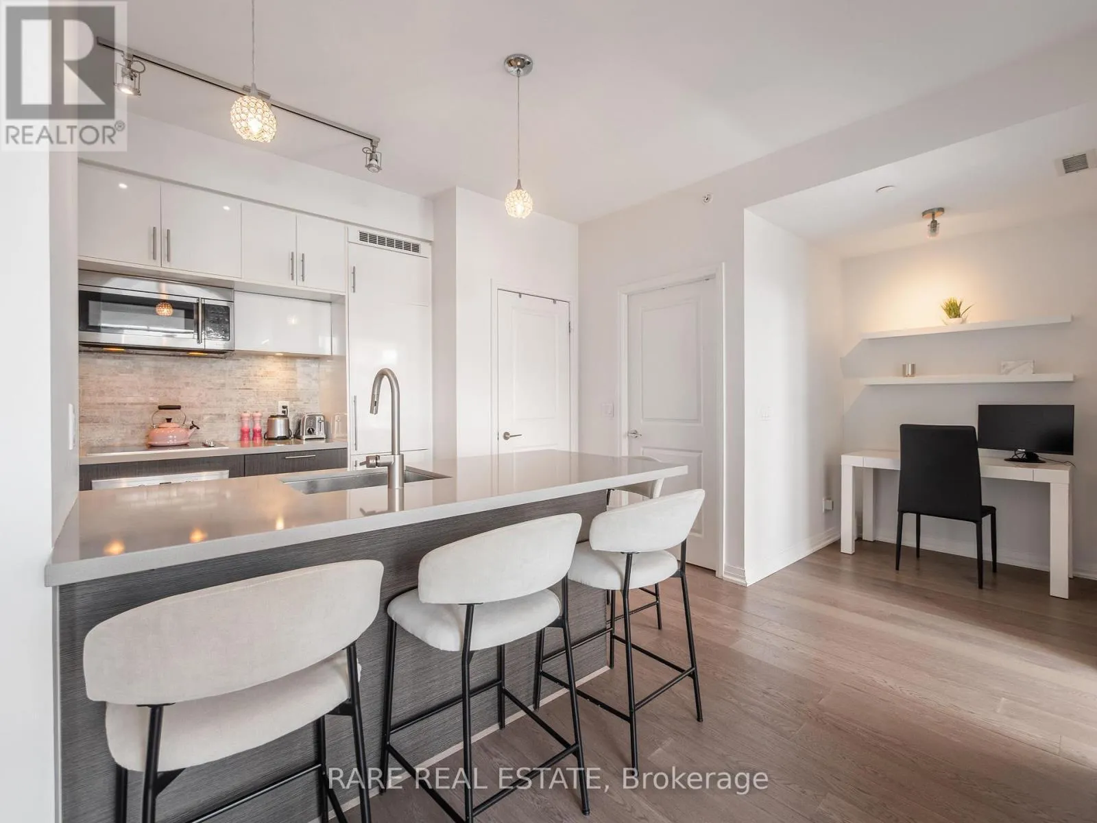 King/John St. Welcome to The Mercer at 8 Mercer Street, perfectly situated in the heart of downtown Toronto's vibrant Entertainment District. This beautifully upgraded 1 bedroom plus den suite offers stylish, functional living just steps from everything the city has to offer.Featuring designer kitchen cabinetry, stainless steel appliances, stone countertops, and an extended eat-in layout, the kitchen is truly the heart of the home. A large centre island with breakfast bar, neutral quartz countertops and backsplash, upgraded lighting, and a separate laundry room add both comfort and convenience. The open concept living and dining areas flow effortlessly to a generous yet private balcony, ideal for enjoying your morning coffee or unwinding at the end of the day. Floor-to-ceiling windows fill the space with natural light, complemented by upgraded engineered flooring throughout.The spacious primary bedroom offers excellent storage, while the versatile den is large enough to function as a dining area or home office. Includes 1 underground parking space and locker.Enjoy unbeatable walkability with a Walk Score of 98, Transit Score of 100, and Bike Score of 90. Steps to the PATH, King Street West, top restaurants, theatres, lounges, Rogers Centre, Scotiabank Arena, and the Financial and Entertainment Districts.Residents of The Mercer enjoy premium amenities including 24-hour concierge, visitor parking, fitness centre, hot tub, sauna, media room, outdoor terrace, and party room.A fantastic opportunity to live in one of Toronto's most dynamic neighbourhoods. (id:27476)