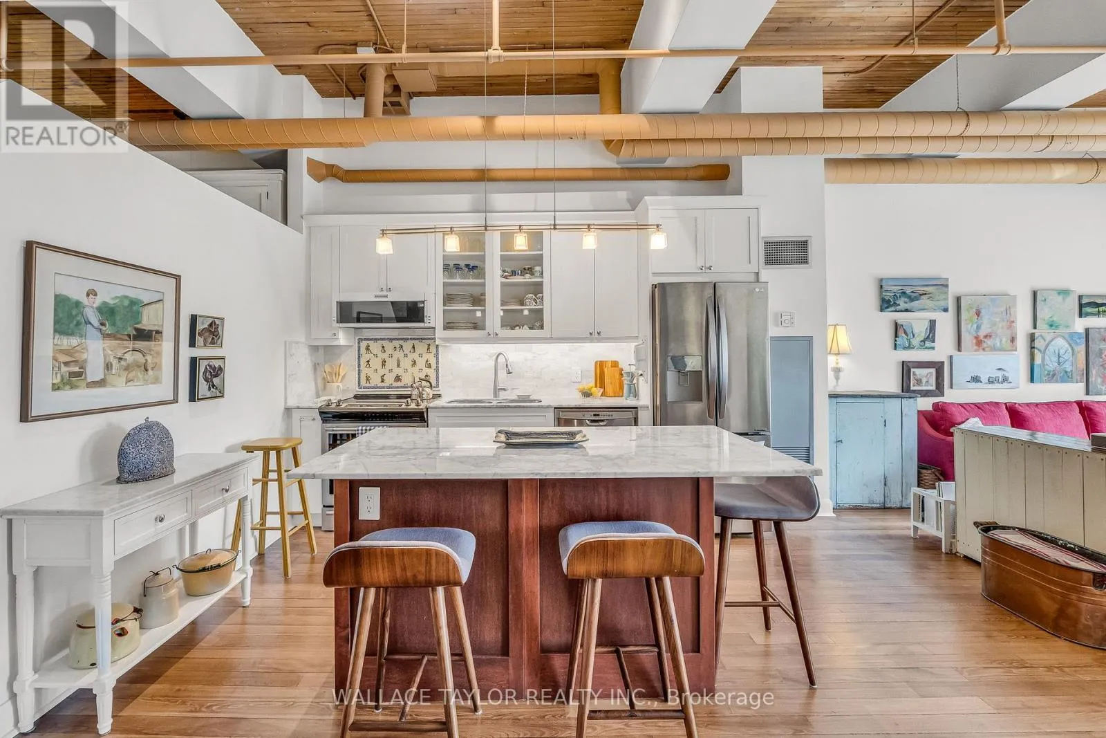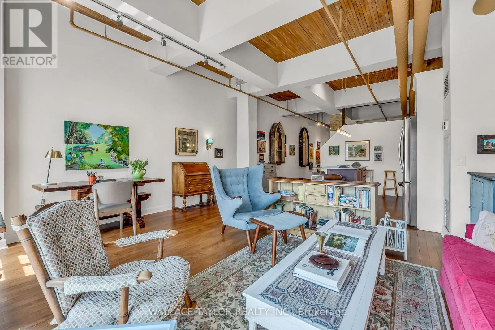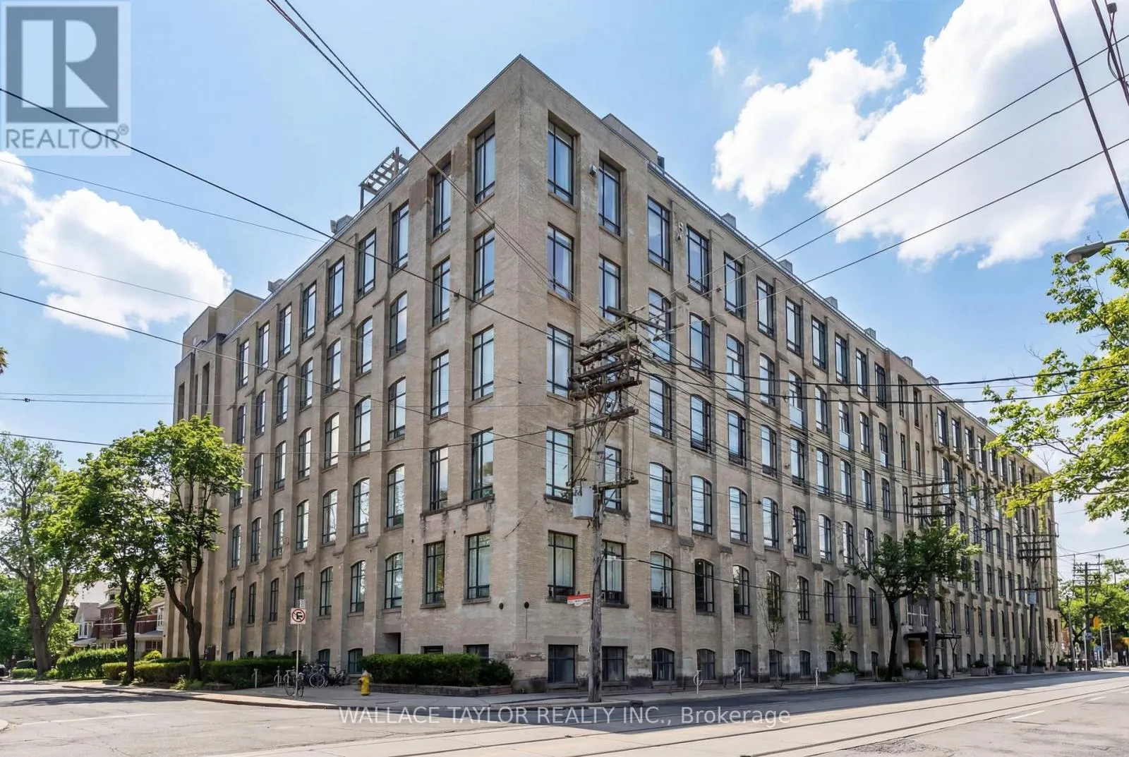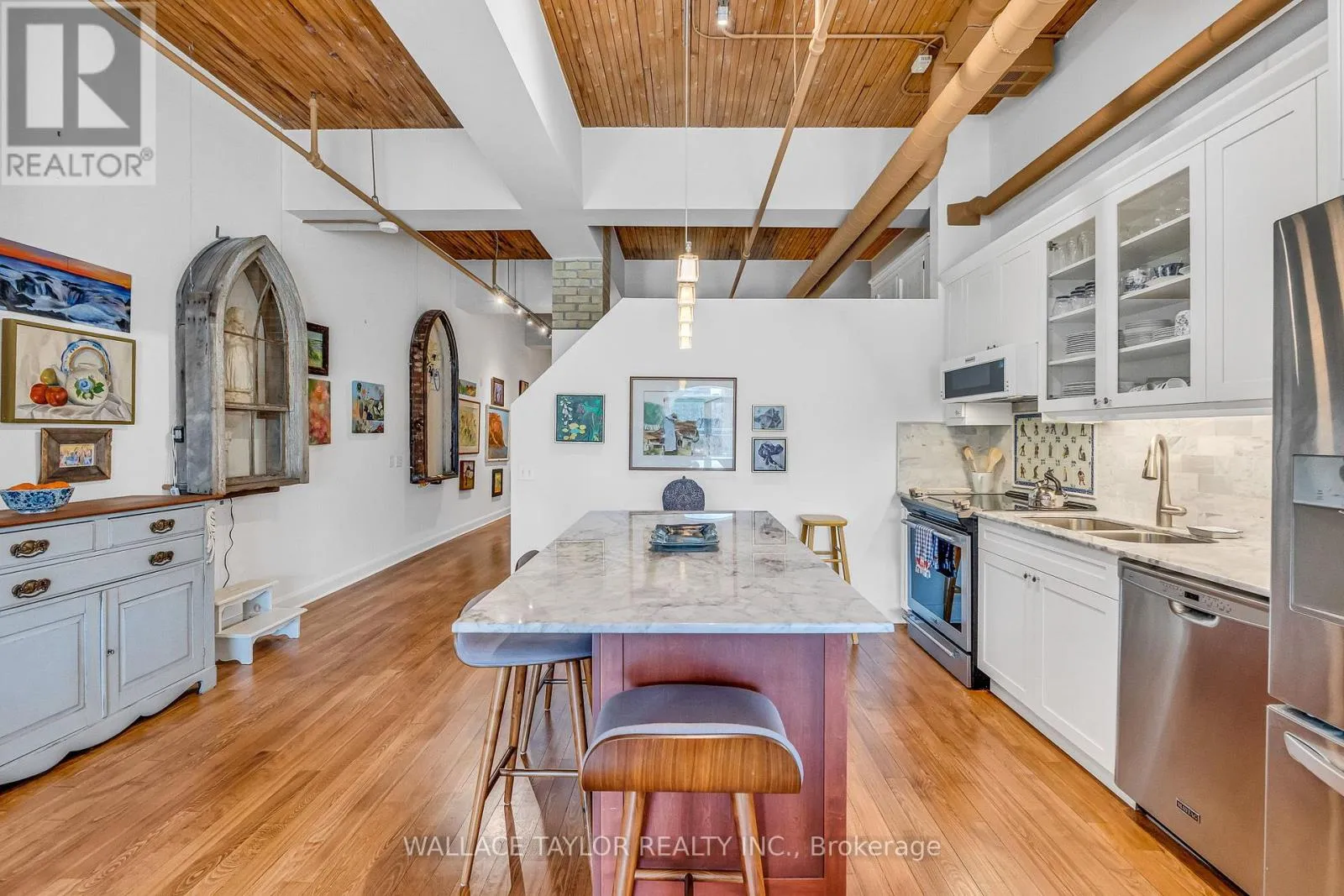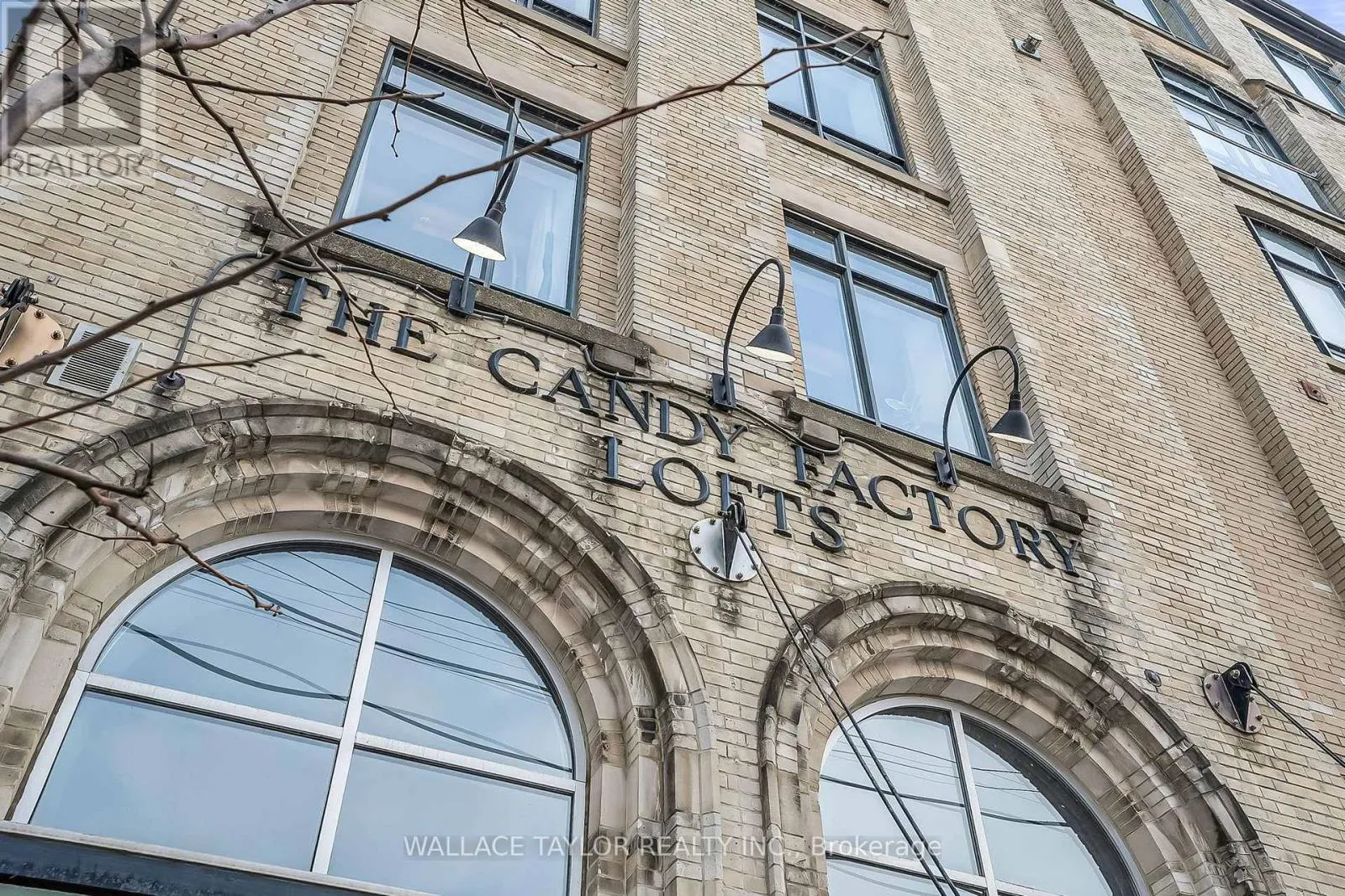 Queen St & Shaw St Parks, patios, and pure Queen West energy await. This building is the nucleus of the best Toronto has to offer. Hurry before it sells... as this one has parking! This Candy Factory hard loft on Queen West has a bright 1-bed, 1-bath that combines soaring ceilings with warm timber, exposed brick, ductwork, and expansive factory windows with a Juliet-style walkout framing city views. An elegant kitchen with marble counters, custom cabinetry, and a statement tile backsplash anchors the open living/dining area-perfect for entertaining or studio work. The serene bedroom comfortably fits a king, and the crisp 4-piece bath completes the space, with clever storage throughout. Steps to Trinity Bellwoods Park, cafes, galleries, boutiques, and the 501 streetcar, the suite includes coveted underground parking-authentic hard loft character in Toronto's most coveted creative corridor with a guest suite on the penthouse level! (id:27476)
