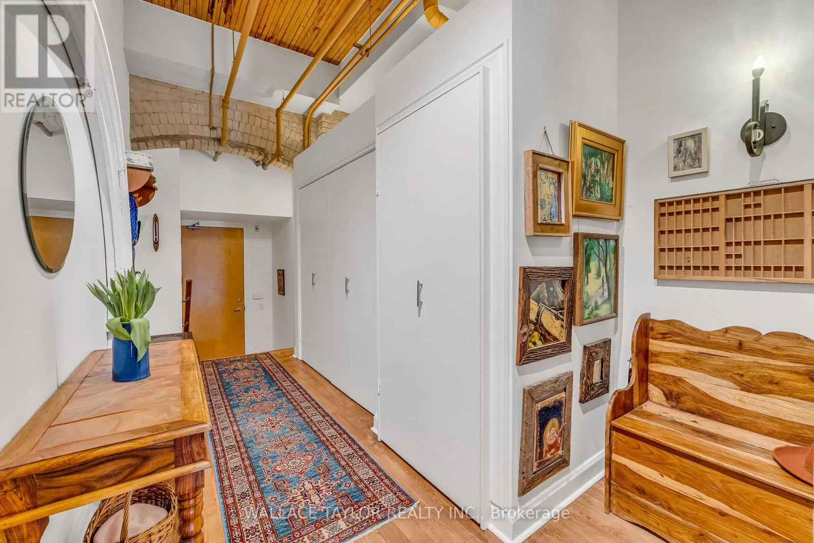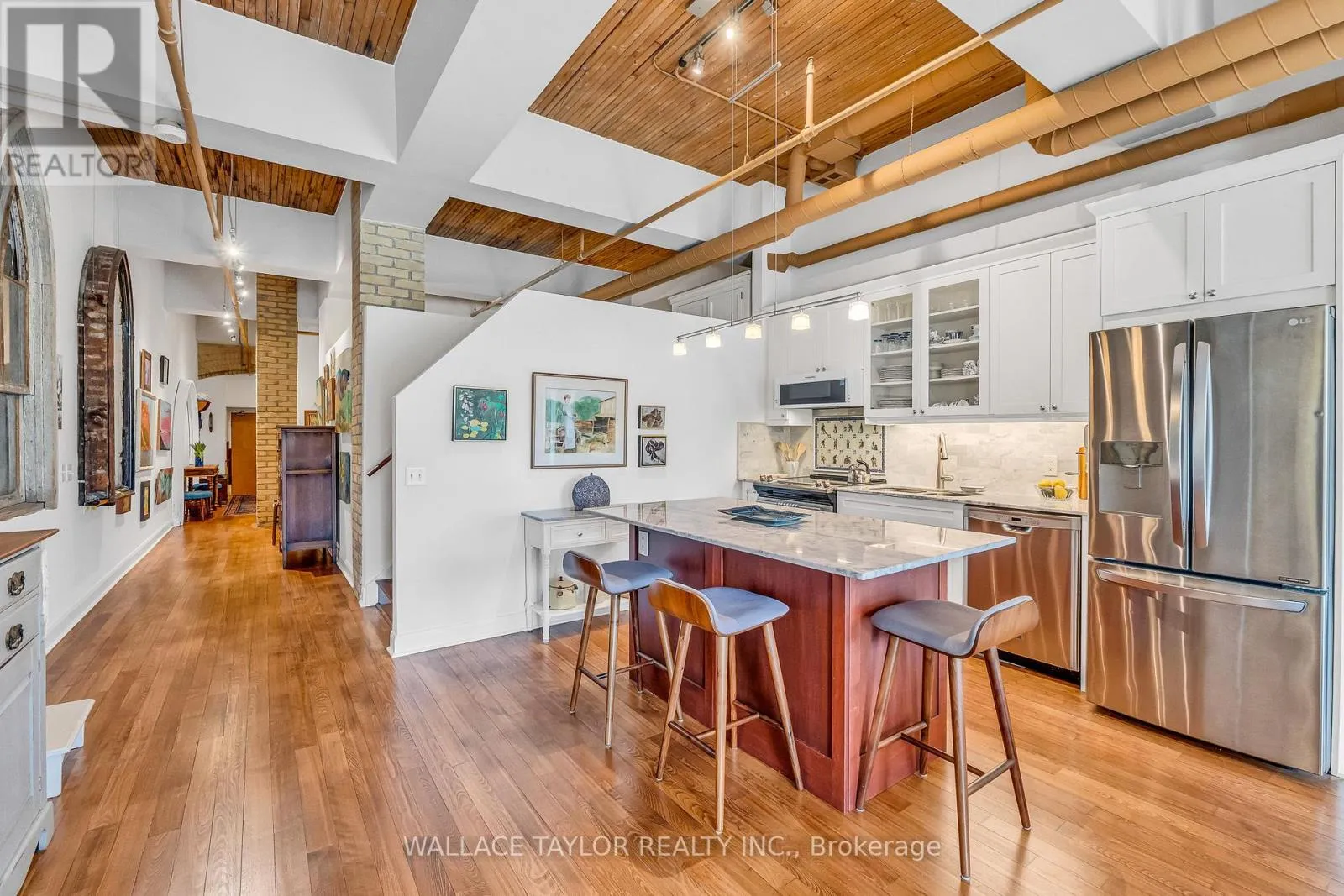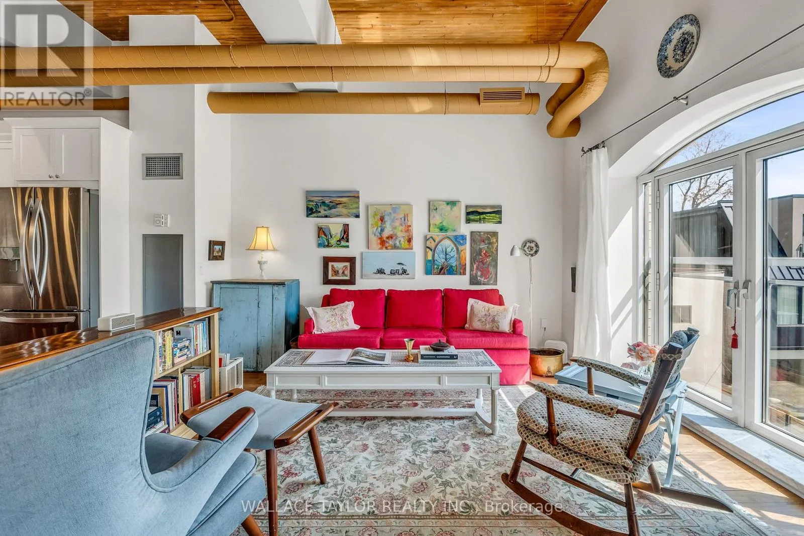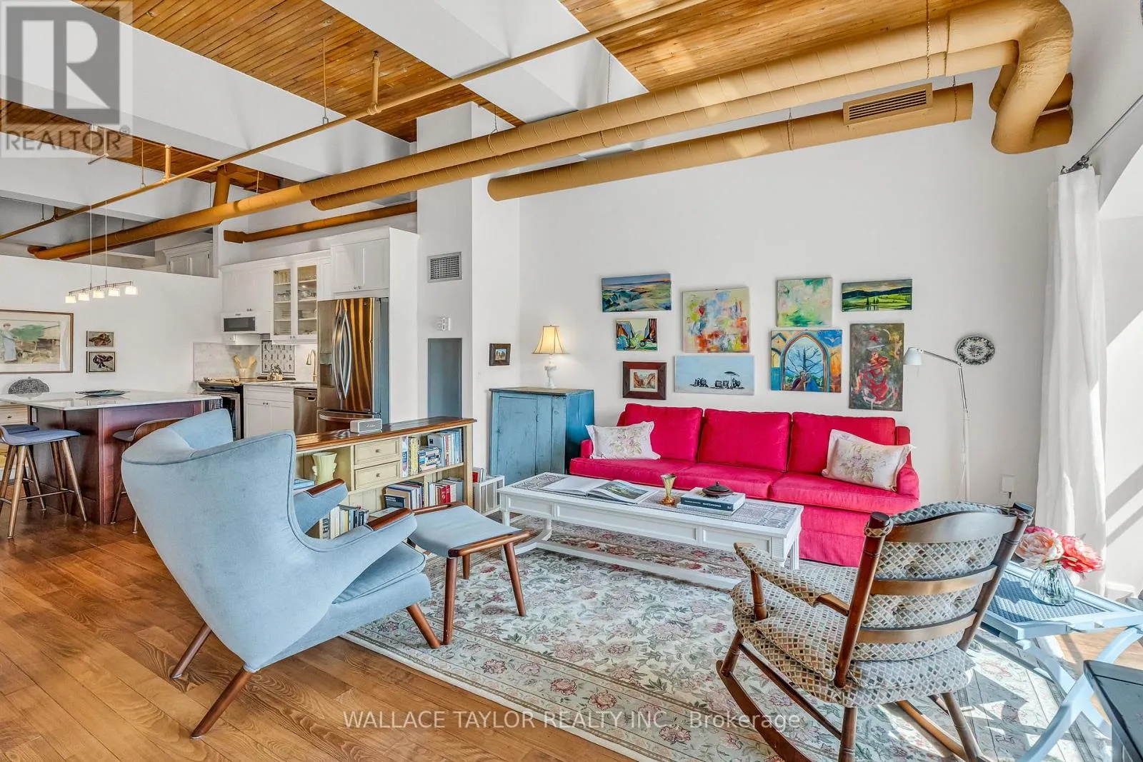 Queen St & Shaw St Parks, patios, and pure Queen West energy await. This building is the nucleus of the best Toronto has to offer. Hurry before it sells... as this one has parking! This Candy Factory hard loft on Queen West has a bright 1-bed, 1-bath that combines soaring ceilings with warm timber, exposed brick, ductwork, and expansive factory windows with a Juliet-style walkout framing city views. An elegant kitchen with marble counters, custom cabinetry, and a statement tile backsplash anchors the open living/dining area-perfect for entertaining or studio work. The serene bedroom comfortably fits a king, and the crisp 4-piece bath completes the space, with clever storage throughout. Steps to Trinity Bellwoods Park, cafes, galleries, boutiques, and the 501 streetcar, the suite includes coveted underground parking-authentic hard loft character in Toronto's most coveted creative corridor with a guest suite on the penthouse level! (id:27476)
