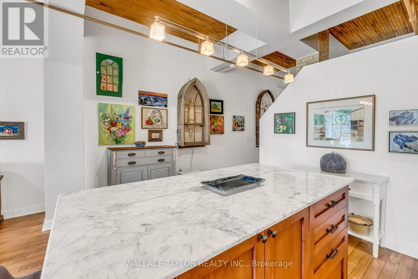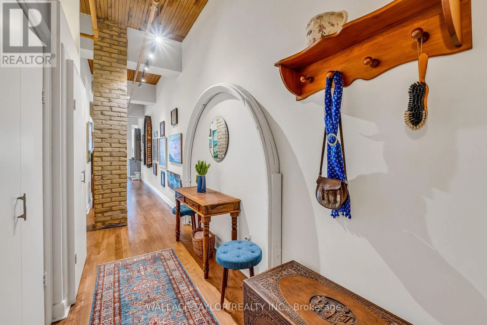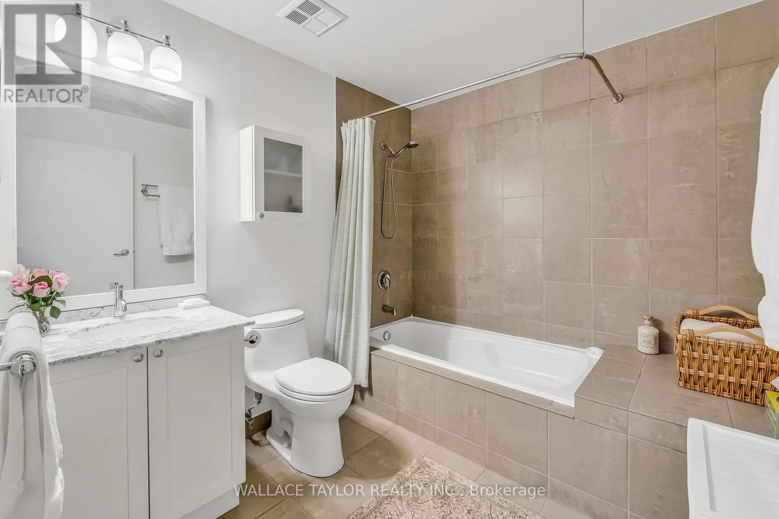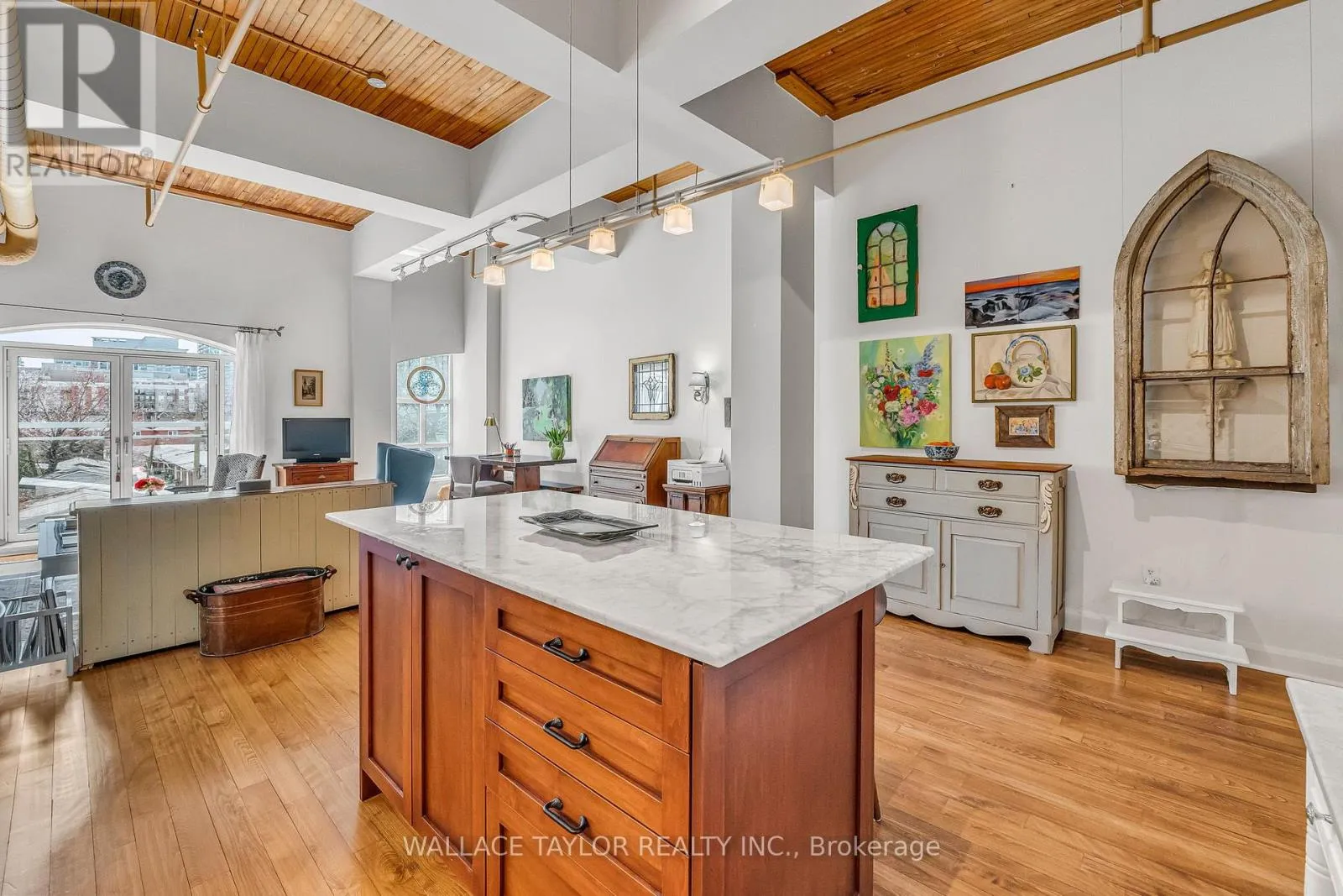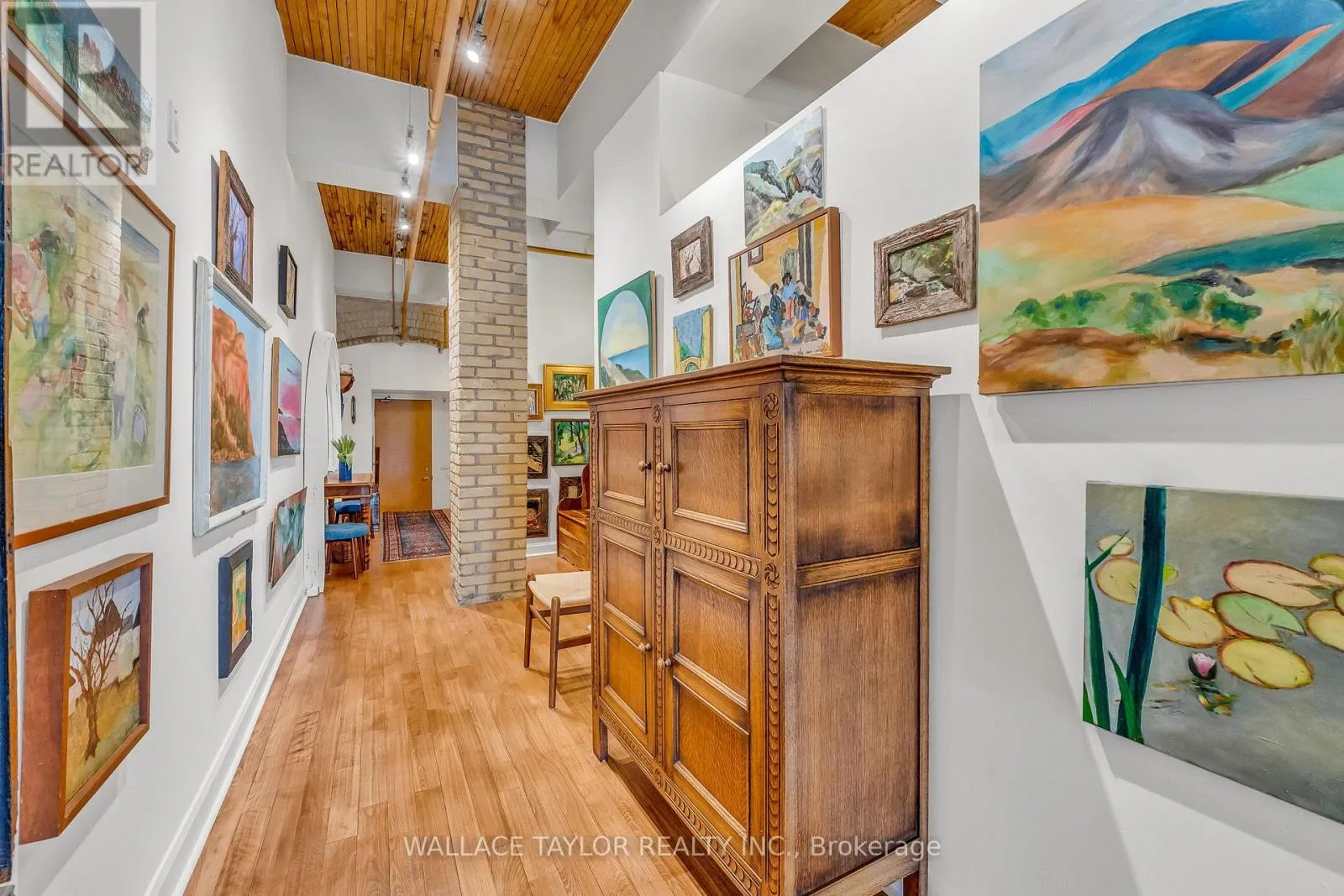Queen St & Shaw St Parks, patios, and pure Queen West energy await. This building is the nucleus of the best Toronto has to offer. Hurry before it sells... as this one has parking! This Candy Factory hard loft on Queen West has a bright 1-bed, 1-bath that combines soaring ceilings with warm timber, exposed brick, ductwork, and expansive factory windows with a Juliet-style walkout framing city views. An elegant kitchen with marble counters, custom cabinetry, and a statement tile backsplash anchors the open living/dining area-perfect for entertaining or studio work. The serene bedroom comfortably fits a king, and the crisp 4-piece bath completes the space, with clever storage throughout. Steps to Trinity Bellwoods Park, cafes, galleries, boutiques, and the 501 streetcar, the suite includes coveted underground parking-authentic hard loft character in Toronto's most coveted creative corridor with a guest suite on the penthouse level! (id:27476)