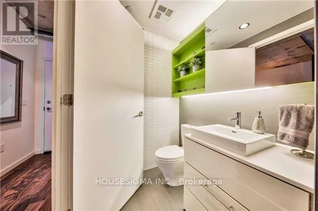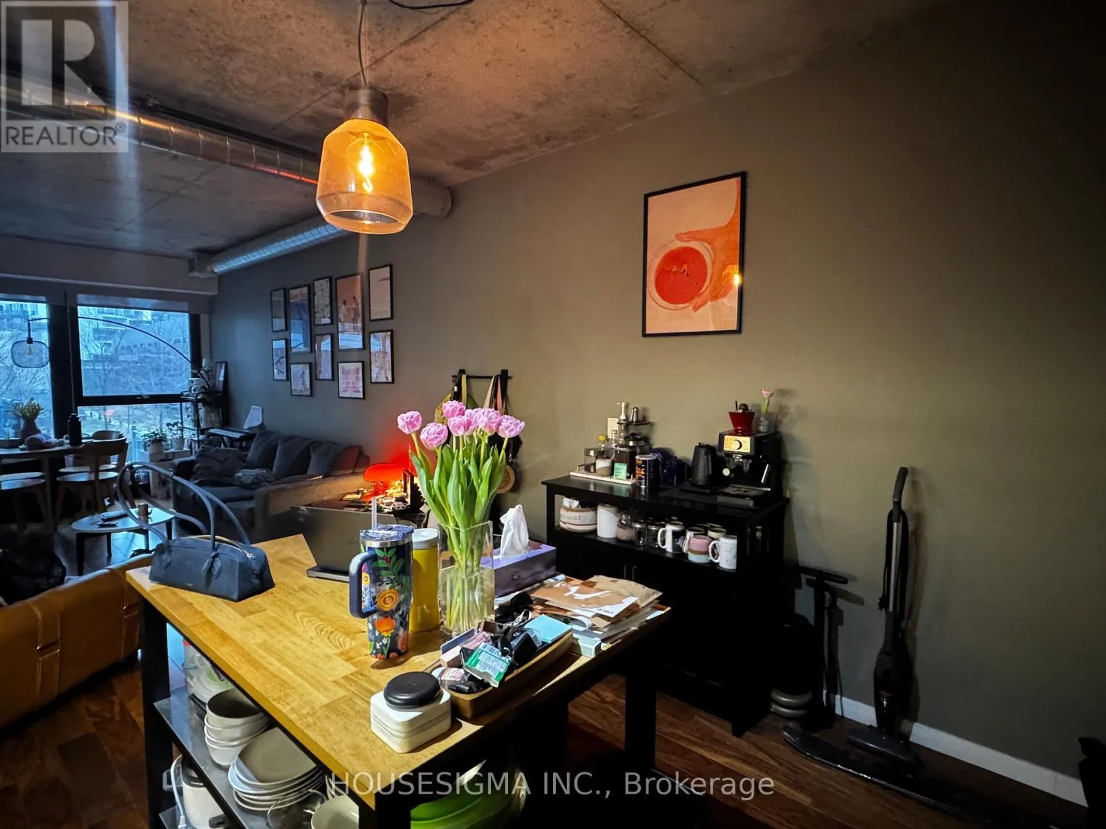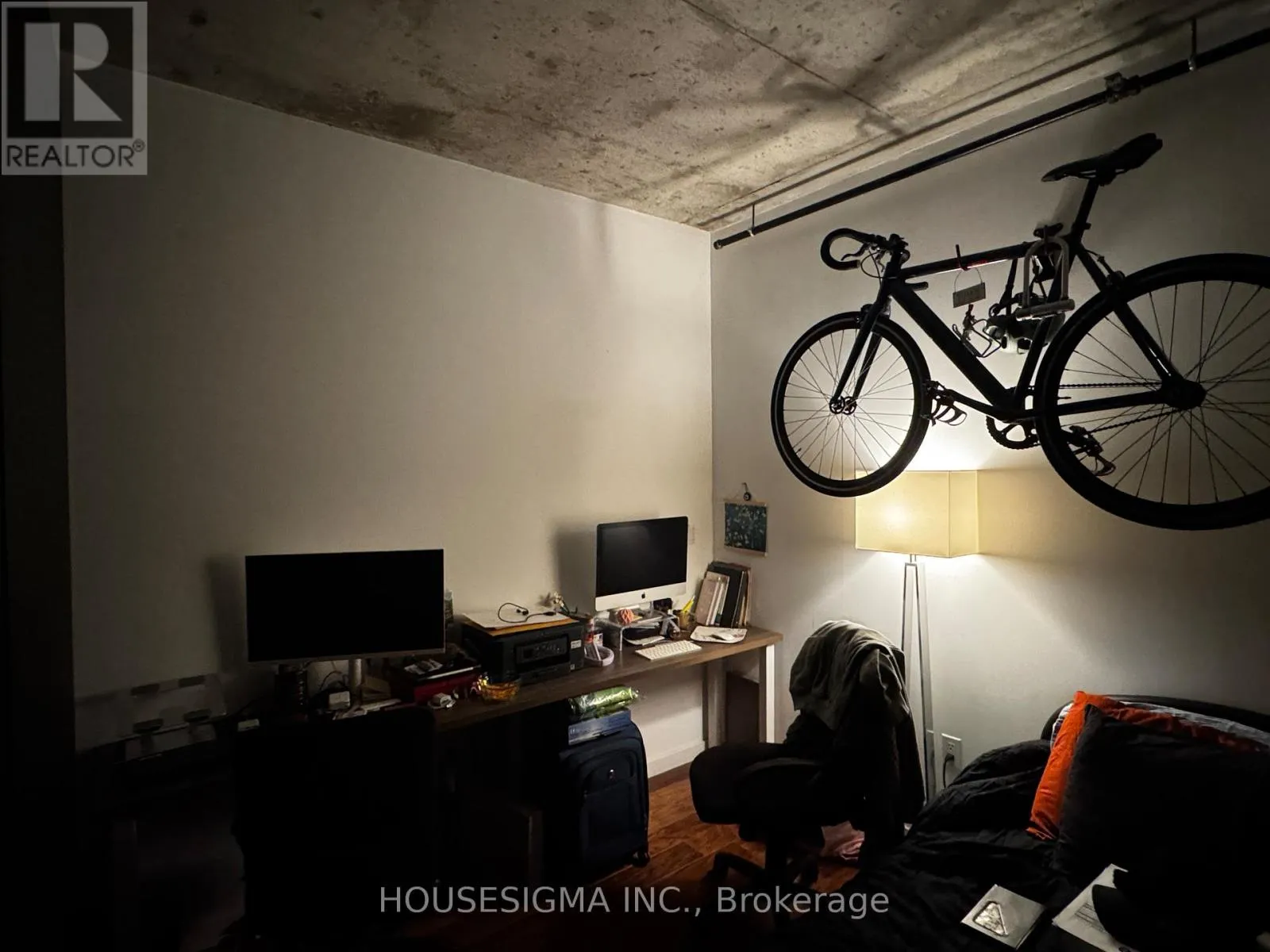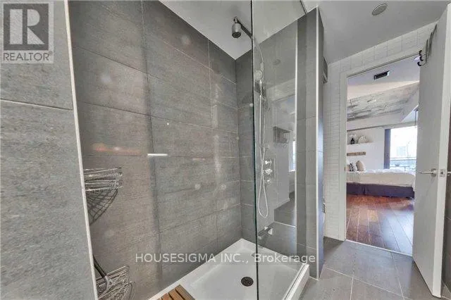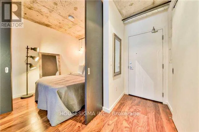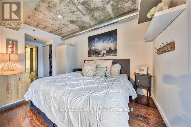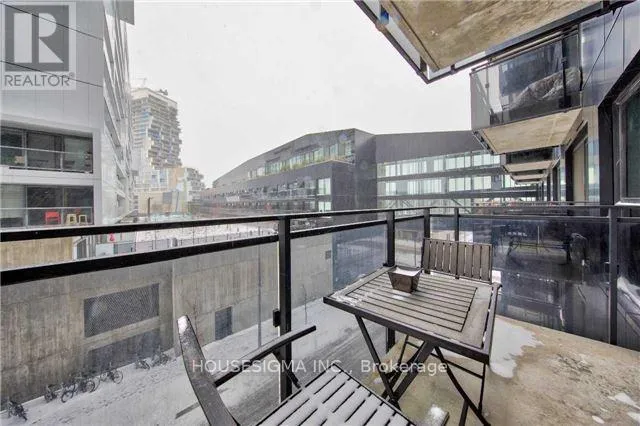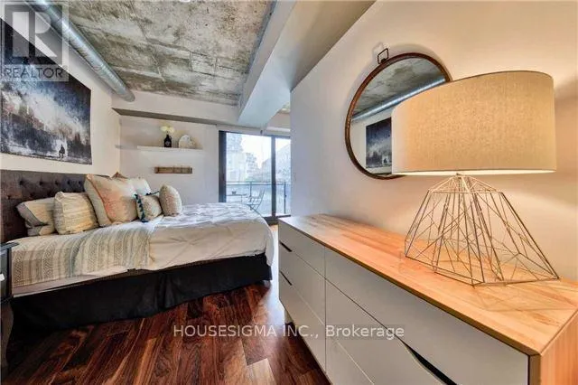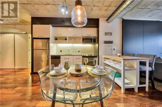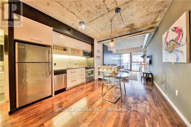 Cross Streets: Trolley Cres/Lower River Street. ** Directions: King and Lower River. Rarely offered, spacious 1+den condo with one underground parking spot ideal for couples or individuals that work from home! This beautifully designed suite offers 784 sq ft of functional interior space plus a 54 sq ft private balcony. The open-concept layout is anchored by 9' exposed concrete ceilings, creating a modern, industrial-chic feel with an abundance of natural light. The oversized den adds incredible flexibility, easily functioning as a private second bedroom, dedicated home office, or creative studio. Enjoy access to premium building amenities such as gym and rooftop pool, and just steps to transit with seamless access to the DVP. (id:27476)
