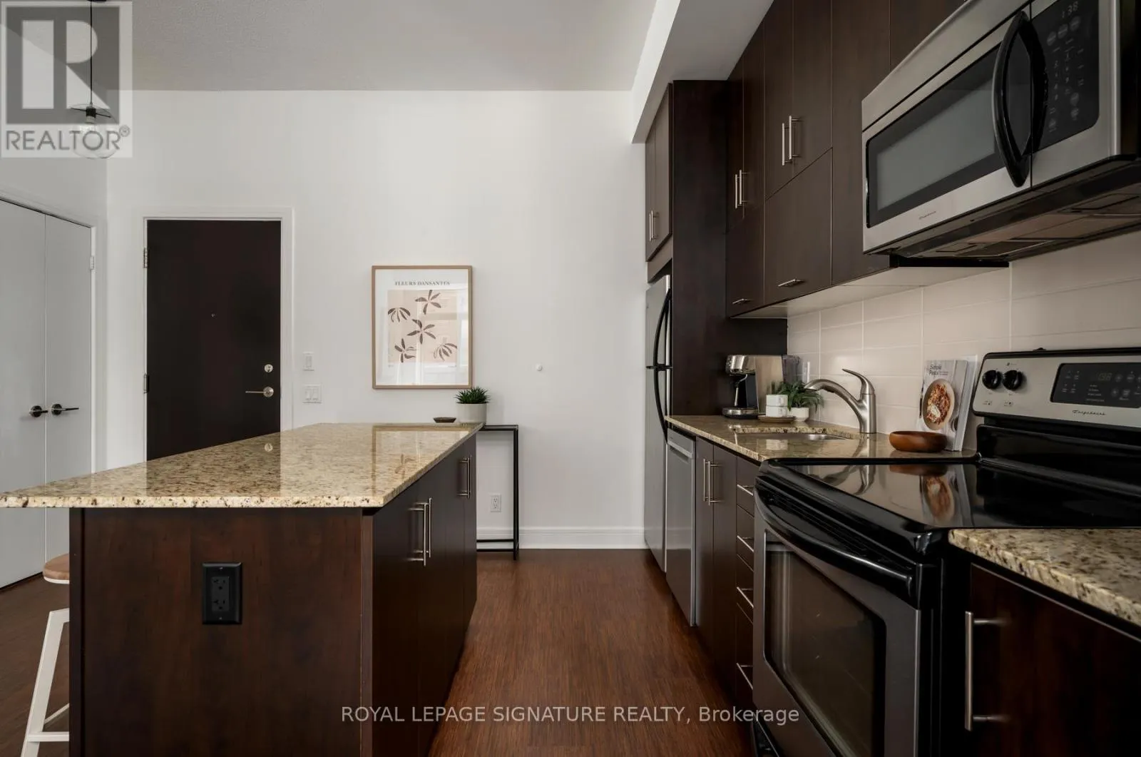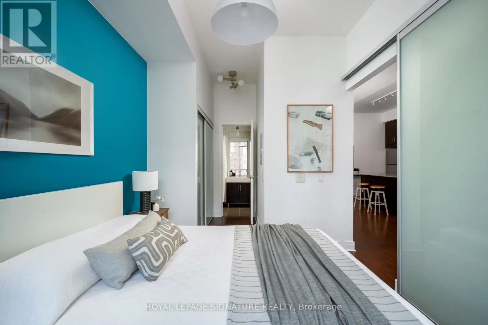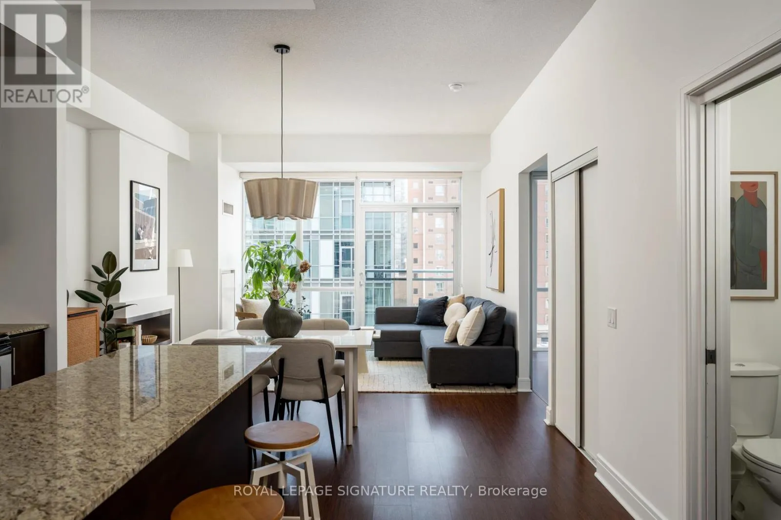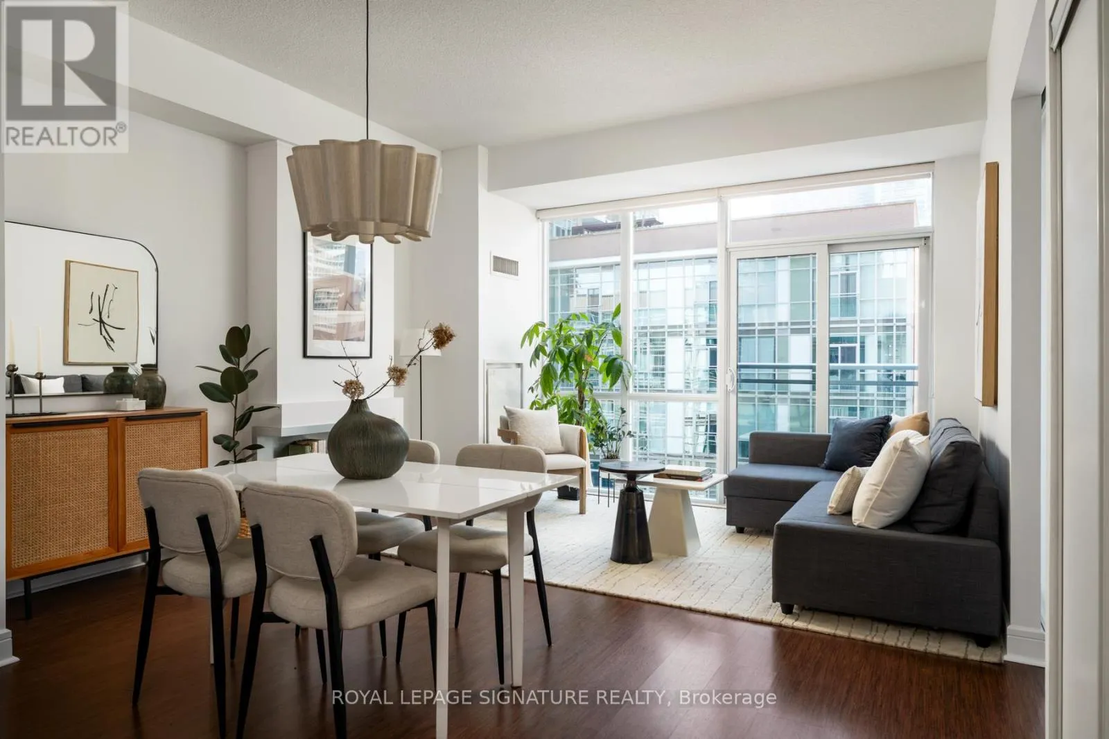 Adelaide & Jarvis Now this is a one bedroom done right! When was the last time you saw a nearly 700 sq ft one bedroom condo with 10ft ceilings, walls of windows, and a truly oversized living space that comfortably fits both living and dining? This condo delivers, and then some. A generous kitchen with island and stainless full-sized appliances flows seamlessly into the open-concept living and dining area, complete with a modern decorative fireplace that adds warmth and character. Enjoy a wall of west-facing windows and a juliet balcony overlooking the quiet courtyard and the charming Parisian style building next door - city views without the noise! The primary bedroom is a spacious retreat with a semi-ensuite bathroom featuring double sinks and a clever pocket door that converts it into a guest-friendly powder room. Plus, enjoy stylish new lighting throughout. Top-tier amenities include 24-hour concierge, two gyms, rooftop patio, guest suite, two party rooms, and visitor parking. Step outside and you're moments to St. Lawrence Market, St. James Park, the waterfront, great dining, cafes, groceries, and transit. Spacious, stylish, and full of potential. This is one bedroom living with room to grow. Parking included! (id:27476)