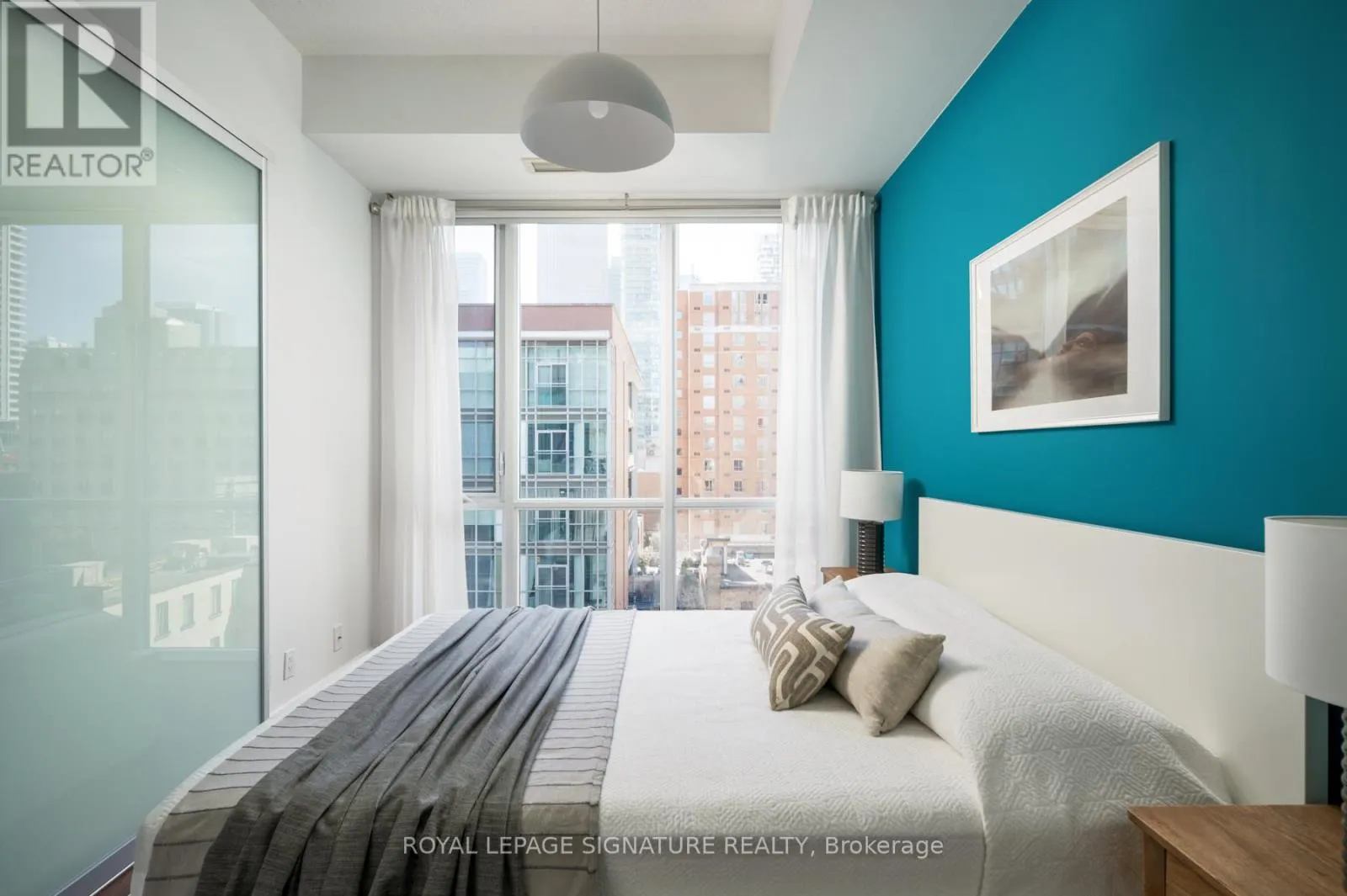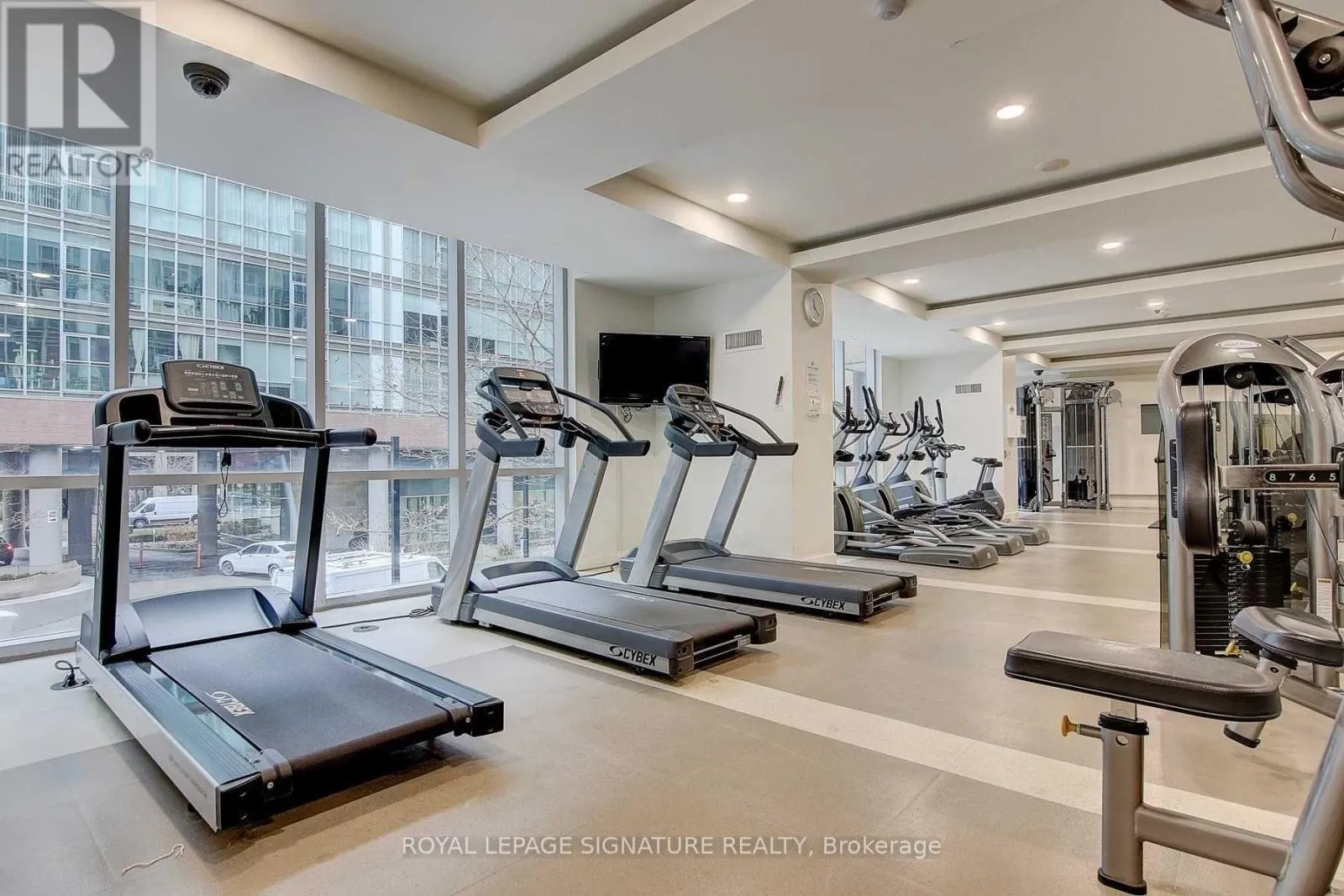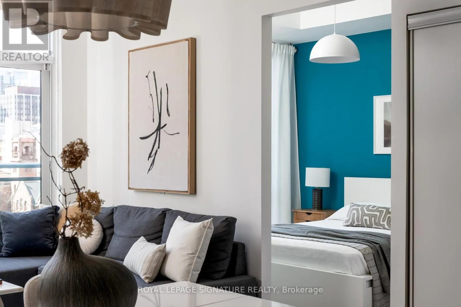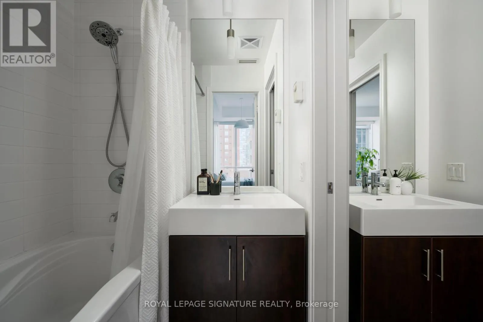 Adelaide & Jarvis Now this is a one bedroom done right! When was the last time you saw a nearly 700 sq ft one bedroom condo with 10ft ceilings, walls of windows, and a truly oversized living space that comfortably fits both living and dining? This condo delivers, and then some. A generous kitchen with island and stainless full-sized appliances flows seamlessly into the open-concept living and dining area, complete with a modern decorative fireplace that adds warmth and character. Enjoy a wall of west-facing windows and a juliet balcony overlooking the quiet courtyard and the charming Parisian style building next door - city views without the noise! The primary bedroom is a spacious retreat with a semi-ensuite bathroom featuring double sinks and a clever pocket door that converts it into a guest-friendly powder room. Plus, enjoy stylish new lighting throughout. Top-tier amenities include 24-hour concierge, two gyms, rooftop patio, guest suite, two party rooms, and visitor parking. Step outside and you're moments to St. Lawrence Market, St. James Park, the waterfront, great dining, cafes, groceries, and transit. Spacious, stylish, and full of potential. This is one bedroom living with room to grow. Parking included! (id:27476)