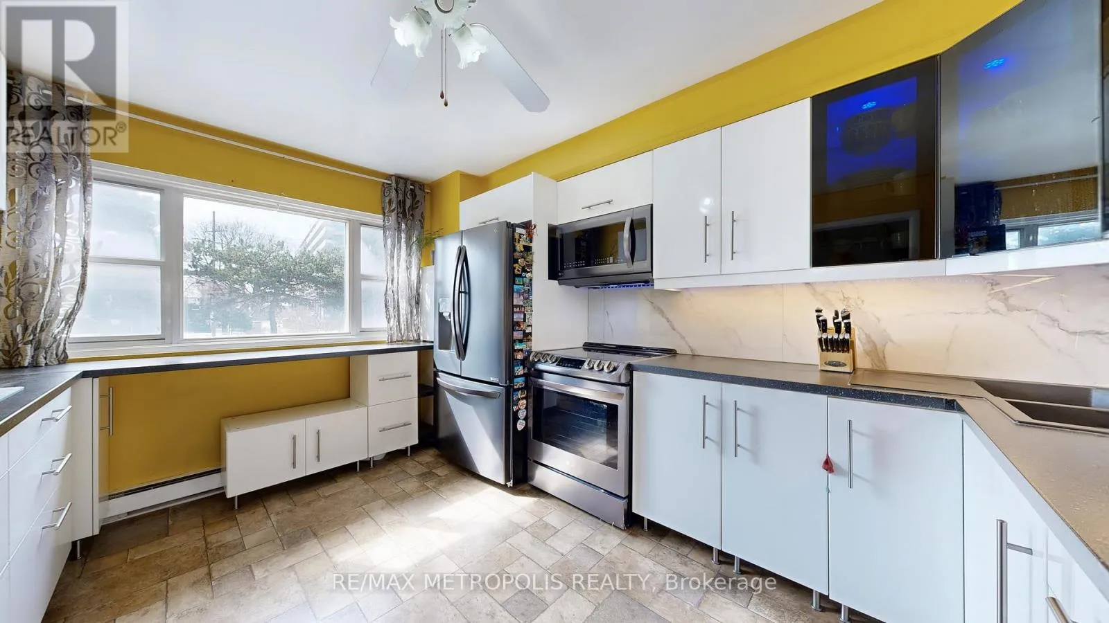 Bathurst/Steeles Fully upgraded 2-storey townhouse with finished basement in a prime North York location. Features a bright, open-concept living/dining area with large new windows, an electric fireplace, premium wallpaper, and high-quality laminate flooring throughout. Renovated kitchen with new appliances, touch-activated faucet, custom cabinetry with workspace/bar area, and LED lighting. The upper level offers 3 bedrooms, including a spacious primary bedroom with a private powder room and a dedicated split AC. Finished basement includes bedroom, full bath, living area, and new laundry. Includes garage + driveway parking, 3 split AC units, and a private backyard. Conveniently located at 13 Candy Courtway with easy access to transit, shopping, and amenities. (id:27476)