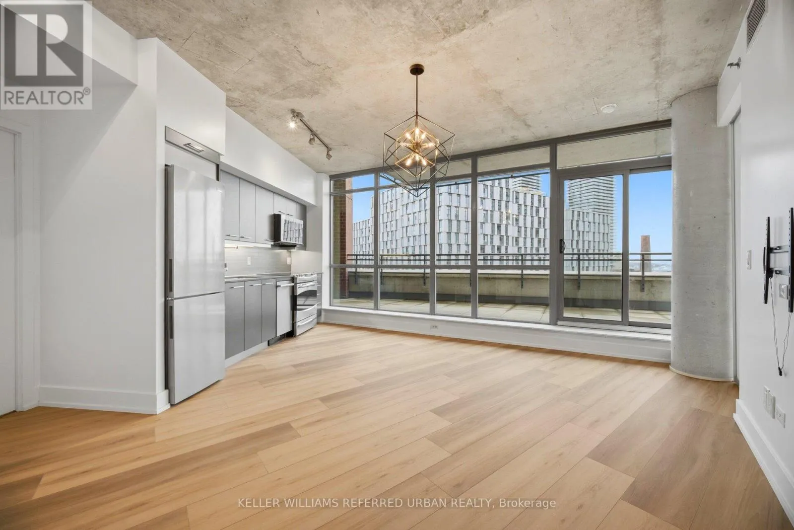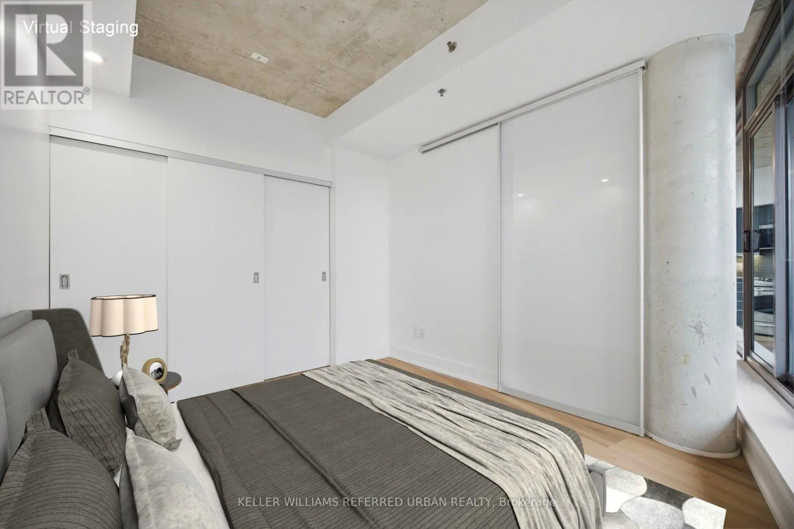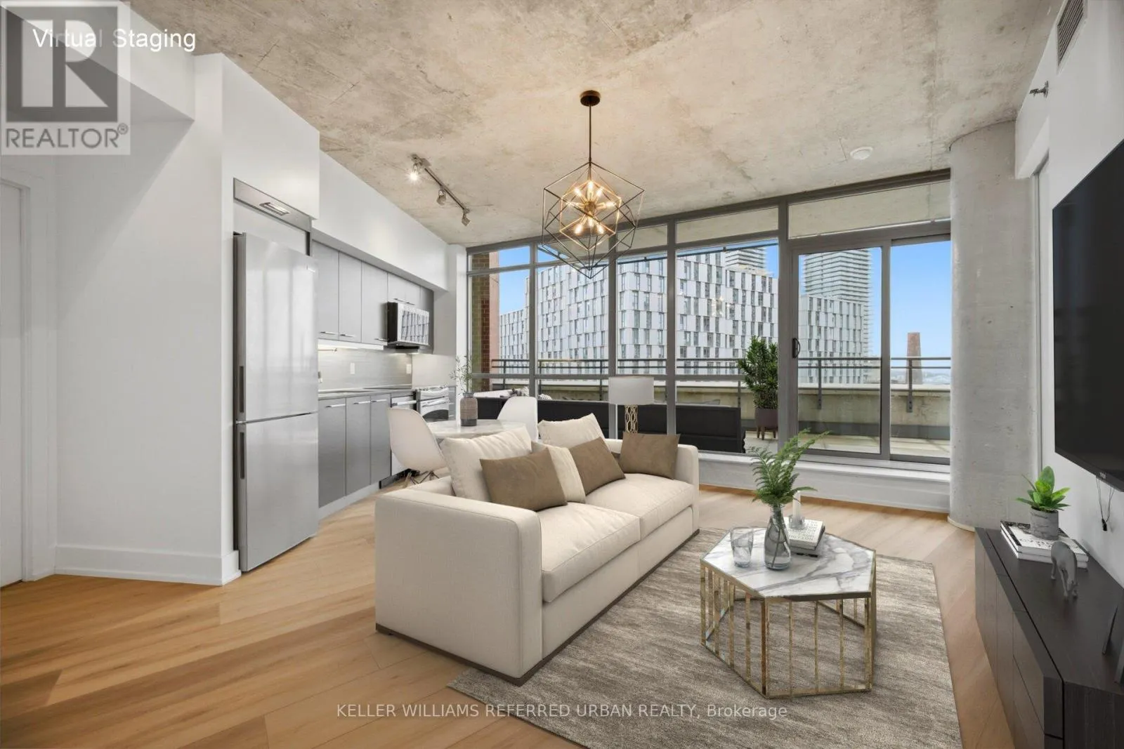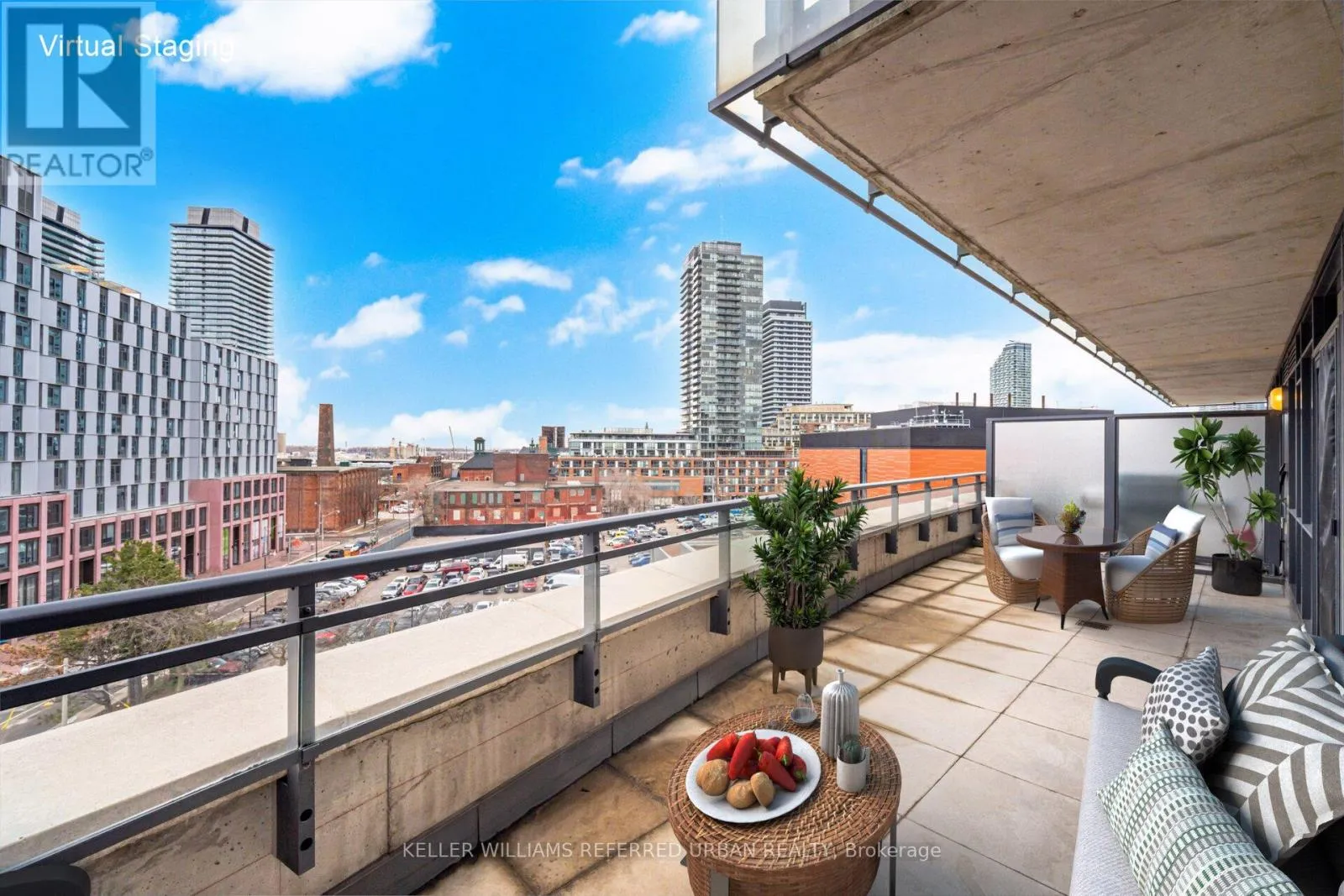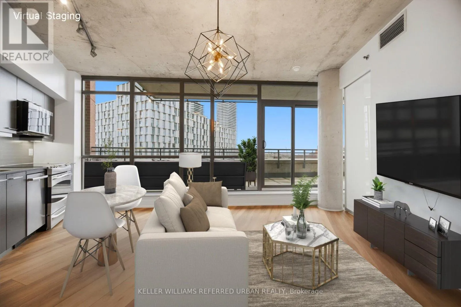 Cross Streets: Eastern/Parliament. ** Directions: Front And Parliament. Experience refined urban living at Trinity Lofts, a boutique residence in Toronto's vibrant King East Design District. This beautifully updated one-bedroom suite offers a fresh, modern aesthetic complemented by 9-foot concrete ceilings that deliver an authentic loft feel. The open-concept layout is thoughtfully designed for both comfort and functionality, extending seamlessly to an expansive south-facing terrace-perfect for outdoor lounging, entertaining, BBQ'ing or soaking in all-day sunlight. Enjoy the convenience of an ensuite laundry and a sleek 4-piece renovated bath, all within a well-managed building that also features a stunning rooftop terrace with BBQ facilities and panoramic city views. Set in a dynamic and walkable neighbourhood, you're just moments from the iconic Distillery District and the renowned St. Lawrence Market. Daily essentials are easily accessible with nearby options like No Frills, Rabba, Aisle 24, and Marche. For outdoor enthusiasts, enjoy quick access to the Don Valley trail system and a scenic ride to Cherry Beach. With excellent transit options and convenient connections to the Gardiner Expressway and DVP, commuting throughout the city. (id:27476)