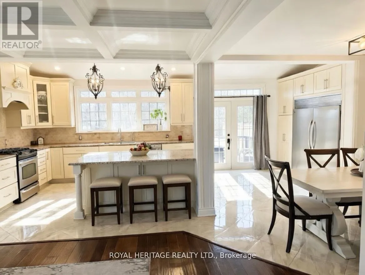 Cross Streets: Lawrence Ave. E/ Centennial Road. ** Directions: Lawrence Ave. E / Centennial Rd. Experience refined living in one of Toronto's most prestigious waterfront communities. This exceptional, custom-built residence offers approximately 2,800 sq. ft. of impeccably designed living space, seamlessly blending elegance, comfort, and functionality.The open-concept main level is adorned with sophisticated coffered ceilings and anchored by a stunning chef-inspired kitchen, thoughtfully designed for both everyday living and upscale entertaining. A private main floor office and an expansive laundry room add convenience without compromising style.The show-stopping family room is a true architectural centerpiece, featuring a wood-burning fireplace, soaring vaulted ceilings, skylights, a picturesque bay window, and a charming Juliette balcony. Bathed in natural light, this space offers an inviting yet luxurious setting for both intimate moments and grand gatherings.A separate side entrance off the oversized driveway presents a rare opportunity for a seamless lower-level conversion-ideal for multigenerational living or income-generating potential. The fully finished lower level extends the home's versatility, offering two additional bedrooms, a spacious family room, and an oversized cold storage area.Step outside from the kitchen onto a private deck overlooking a tranquil, tree-lined backdrop, creating a serene outdoor retreat. The second level unveils a covered terrace-an uncommon and highly desirable feature that elevates the home's indoor-outdoor living experience.Perfectly situated, this residence offers effortless access to scenic parks, ravine trails, and the waterfront, along with TTC and GO Transit, Highway 401, top-tier schools, the Pan Am Sports Centre, Rouge National Urban Park, the Toronto Zoo, and a swift commute to downtown Toronto. Approx. $300K spent in upgrades. Some of which include: the roof, skylights, soffits, insulation (2015), windows (2016), A/C (2021), ensuite ( 2024),and insulated garage doors(2025). OPEN HOUSE SUN Apr. 19th 2-4pm (id:27476)