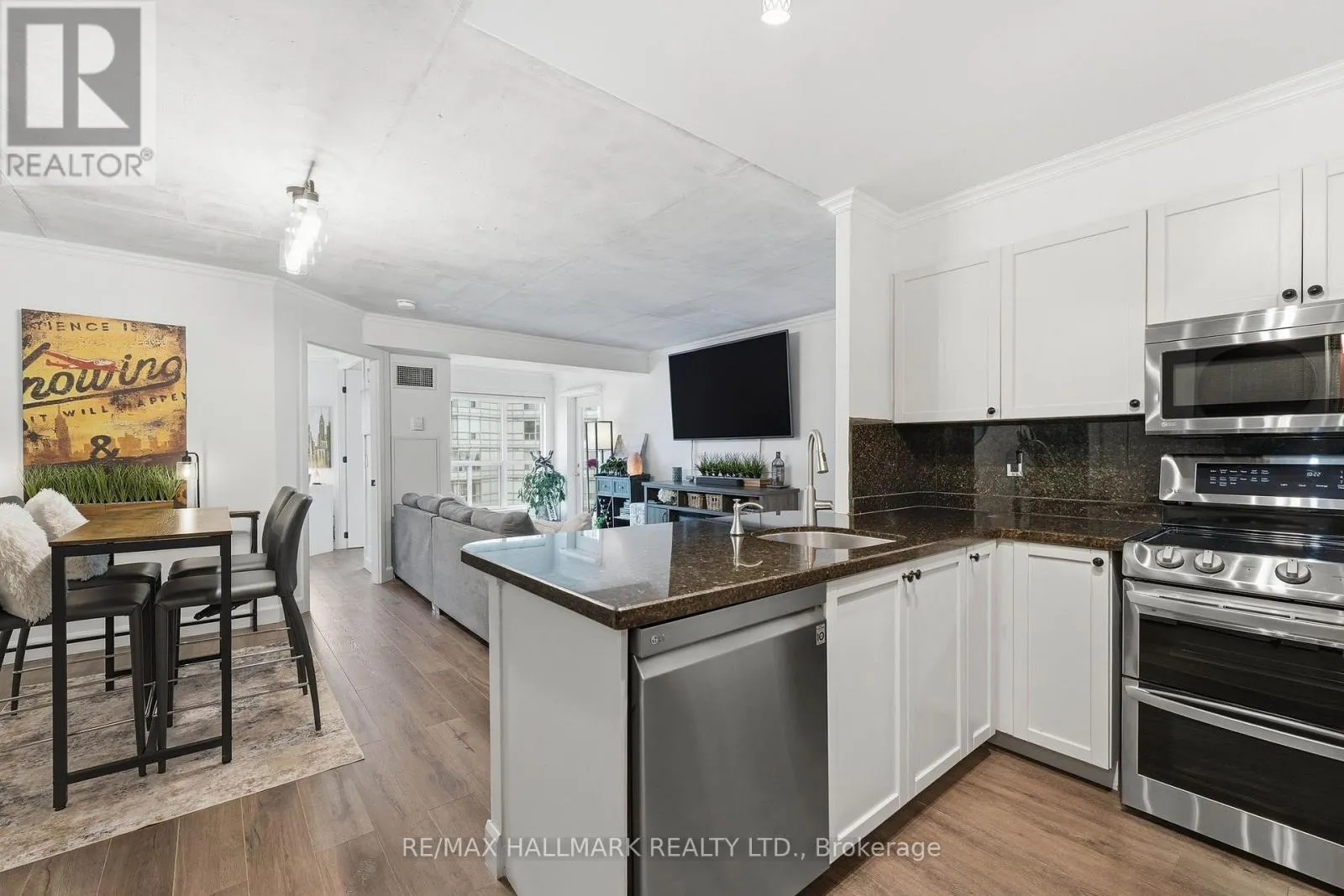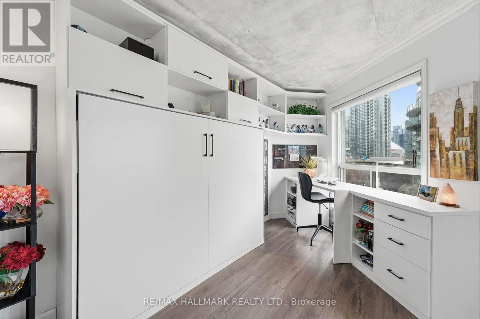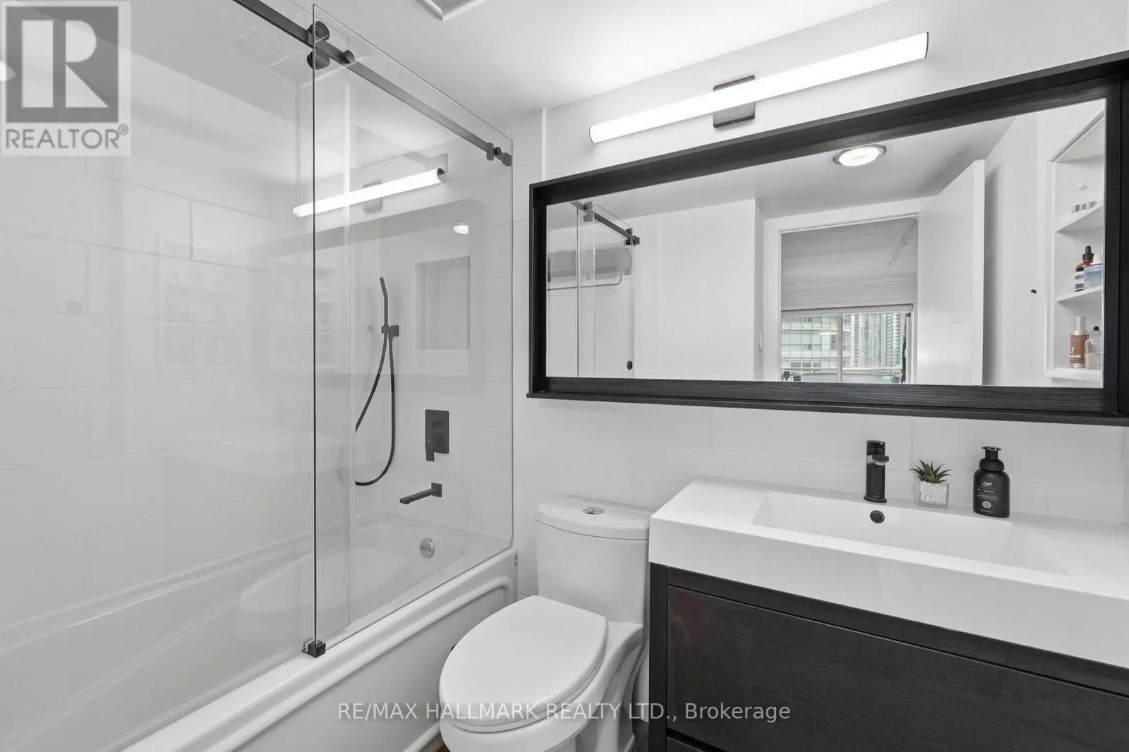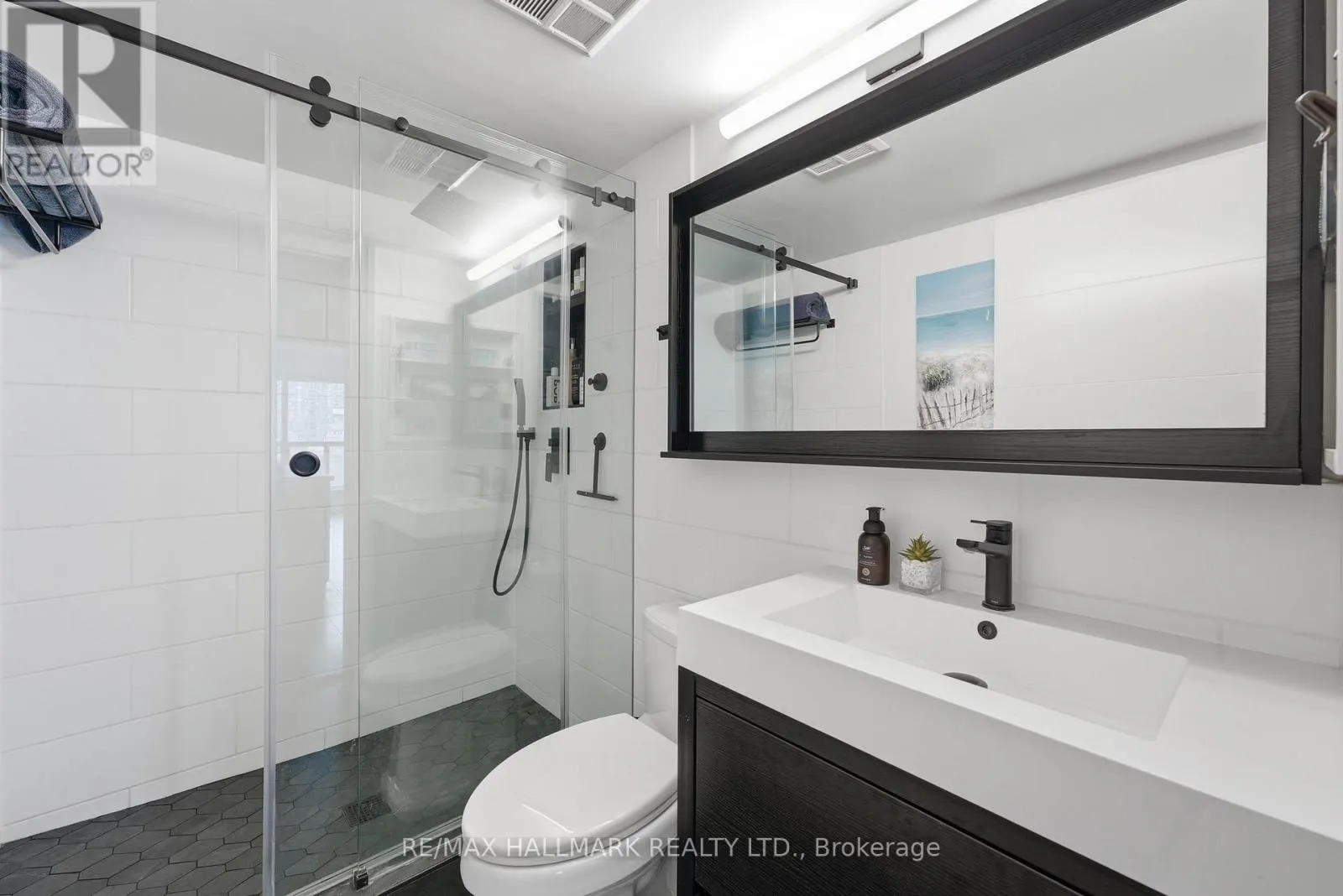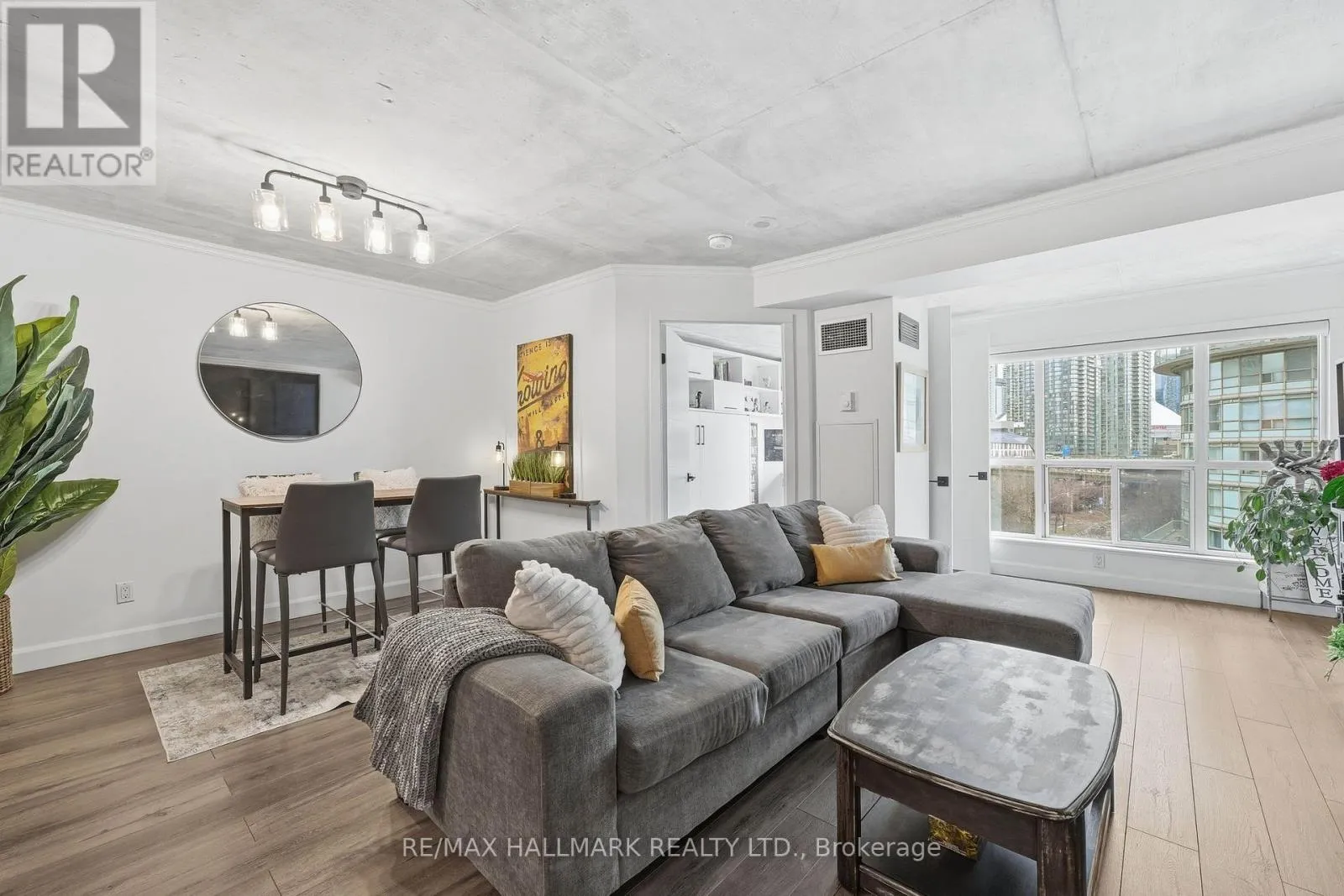 Cross Streets: Queens Quay West & Dan Leckie Way. ** Directions: South on Dan Leckie Way, West on Queens Quay West. This Queens Harbour 2 bed suite, tucked along Toronto's downtown waterfront, blends nearly $95K in modern upgrades, custom finishings, and exposed concrete ceilings for a subtle loft-like feel. The layout is thoughtfully designed, with defined living spaces, separated bedrooms, a fully renovated shared 4pc bath, and two walk-outs to a southeast-facing balcony with lake and city views. The kitchen anchors the open concept living and dining space with a custom granite peninsula, breakfast bar, matching backsplash, and LG stainless steel appliances. The primary bedroom comfortably fits a king-size setup, features a custom walk-in closet, and a clean, modern 5pc ensuite. The second bedroom, enclosed with double doors, shifts easily between a dedicated bedroom, guest room, office, or an open extension of the living space depending on the day. Daily errands are simple, with Loblaws, Farm Boy, LCBO, Shoppers Drug Mart, and more just a short 4 minute walk away, while evenings and weekends can take you to Blue Jays or Maple Leafs games, headliner concerts, or vibrant King West restaurants all within 20 minutes on foot. TTC streetcar service runs right outside the building with a direct 15-20 minute connection to Union Station transit lines. Well-managed building with all utilities included in maintenance fees - water, heat, central A/C, hydro, common elements, building insurance, one parking space and a good-sized locker. (id:27476)