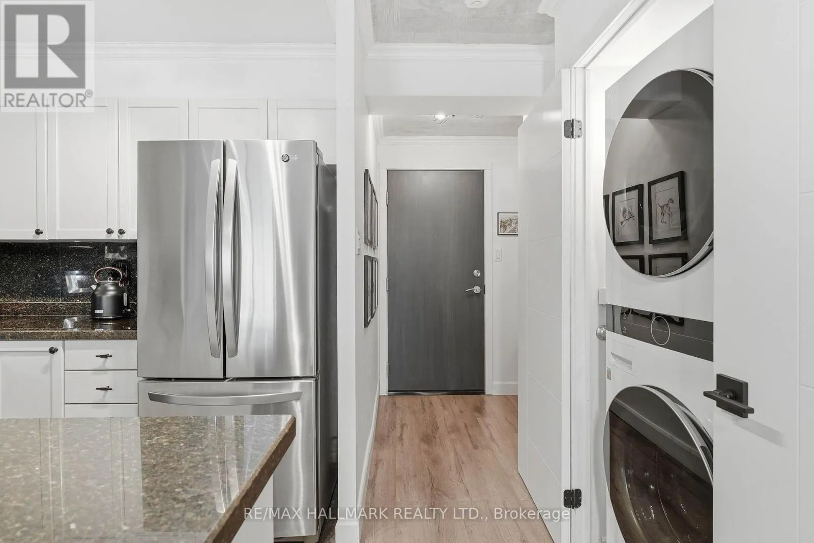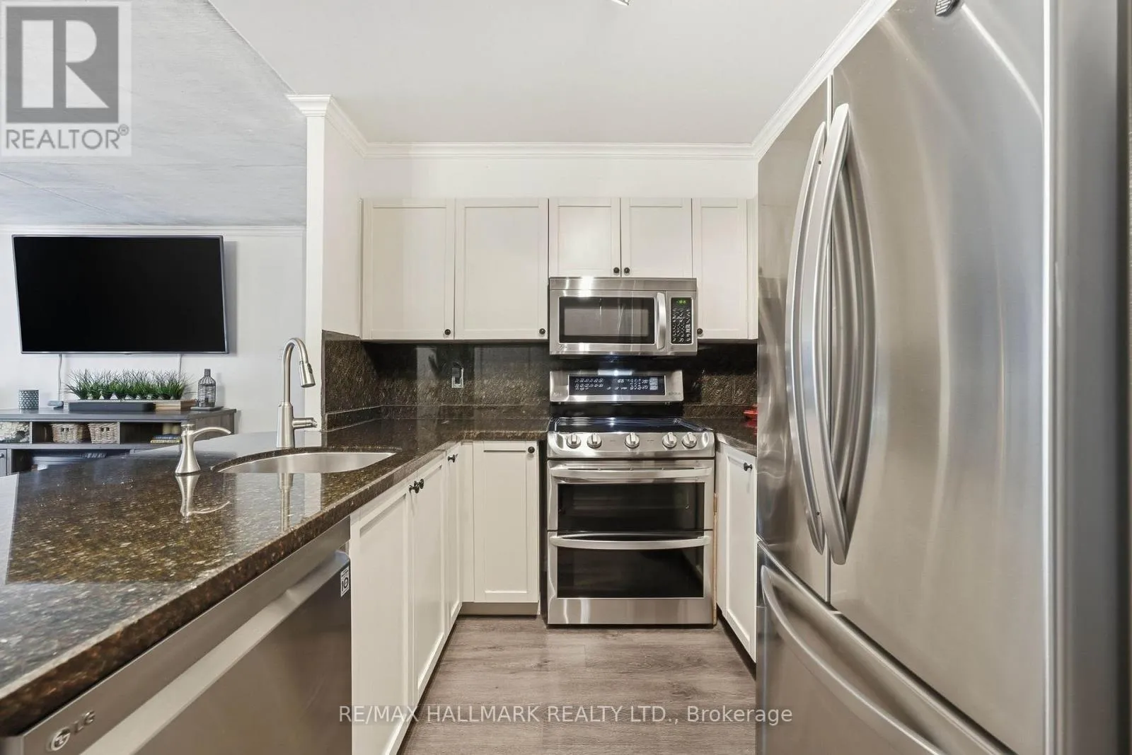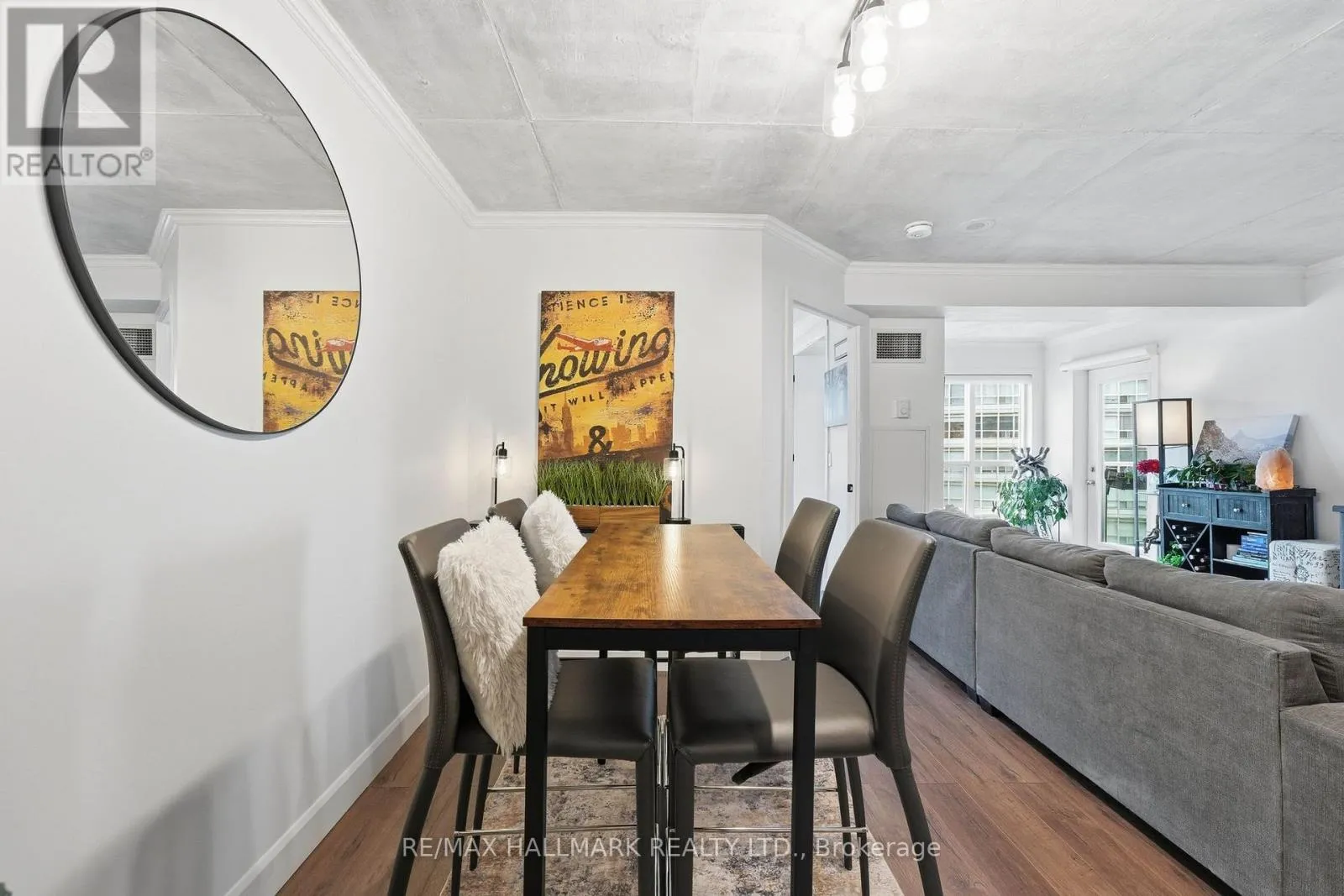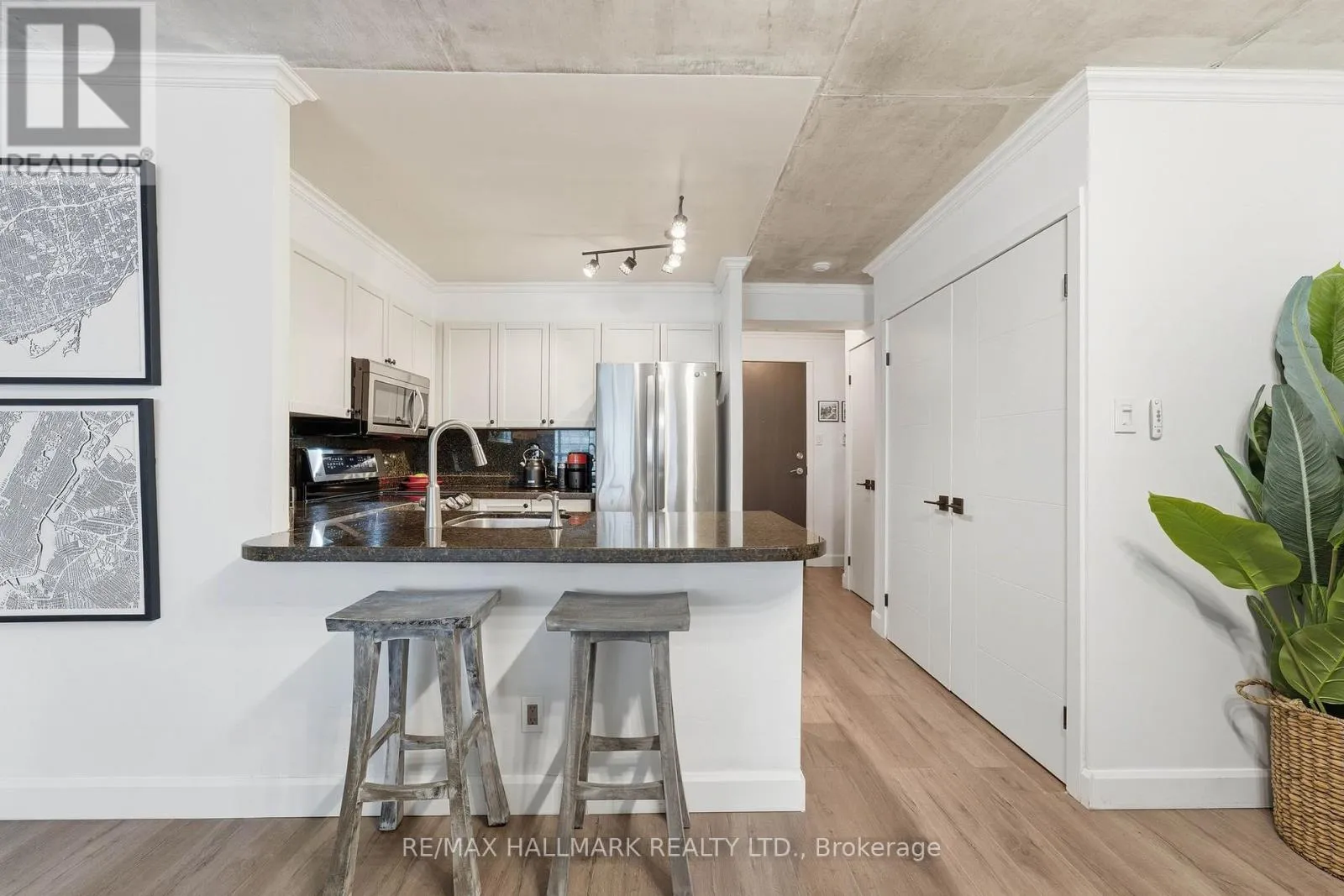 Cross Streets: Queens Quay West & Dan Leckie Way. ** Directions: South on Dan Leckie Way, West on Queens Quay West. This Queens Harbour 2 bed suite, tucked along Toronto's downtown waterfront, blends nearly $95K in modern upgrades, custom finishings, and exposed concrete ceilings for a subtle loft-like feel. The layout is thoughtfully designed, with defined living spaces, separated bedrooms, a fully renovated shared 4pc bath, and two walk-outs to a southeast-facing balcony with lake and city views. The kitchen anchors the open concept living and dining space with a custom granite peninsula, breakfast bar, matching backsplash, and LG stainless steel appliances. The primary bedroom comfortably fits a king-size setup, features a custom walk-in closet, and a clean, modern 5pc ensuite. The second bedroom, enclosed with double doors, shifts easily between a dedicated bedroom, guest room, office, or an open extension of the living space depending on the day. Daily errands are simple, with Loblaws, Farm Boy, LCBO, Shoppers Drug Mart, and more just a short 4 minute walk away, while evenings and weekends can take you to Blue Jays or Maple Leafs games, headliner concerts, or vibrant King West restaurants all within 20 minutes on foot. TTC streetcar service runs right outside the building with a direct 15-20 minute connection to Union Station transit lines. Well-managed building with all utilities included in maintenance fees - water, heat, central A/C, hydro, common elements, building insurance, one parking space and a good-sized locker. (id:27476)