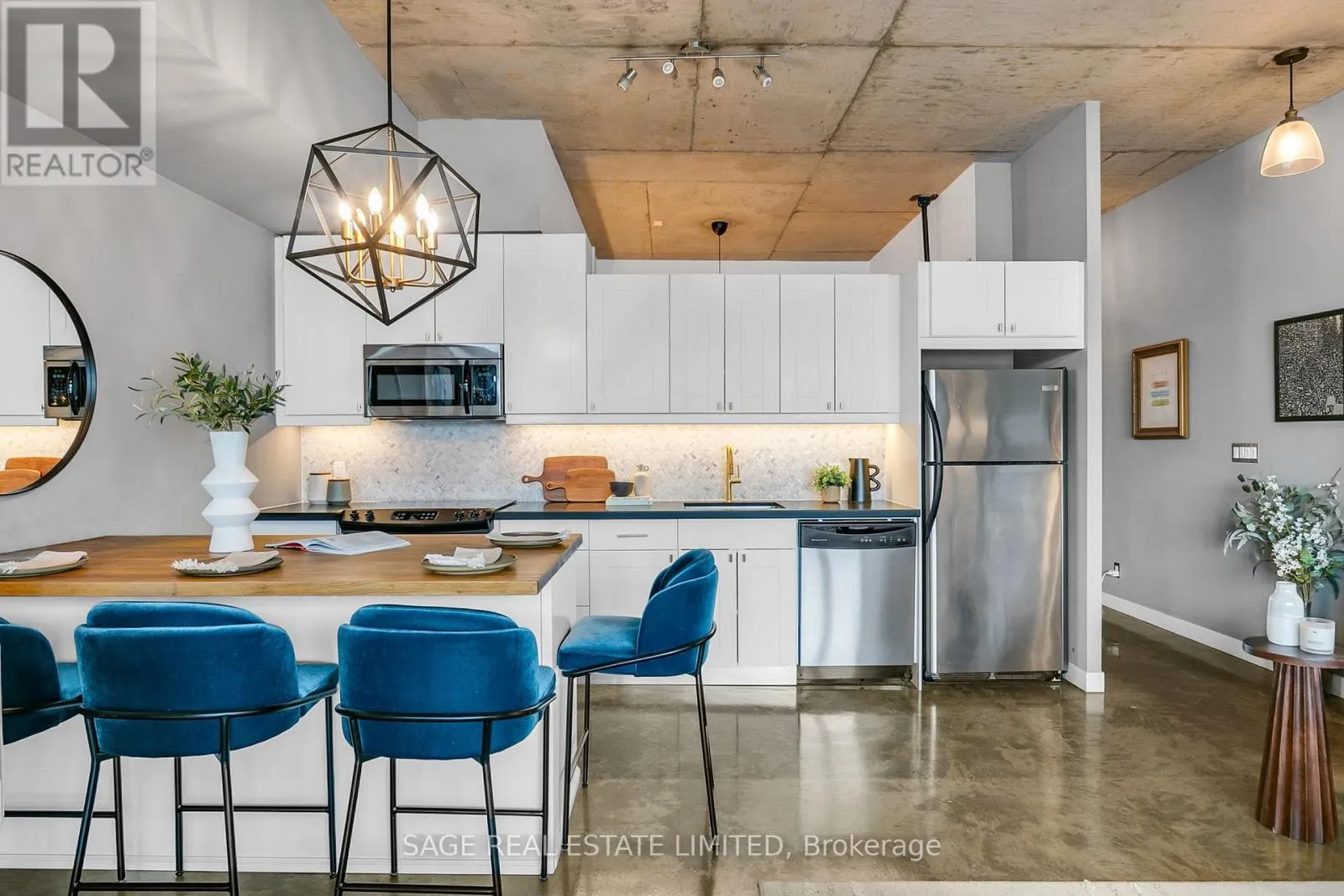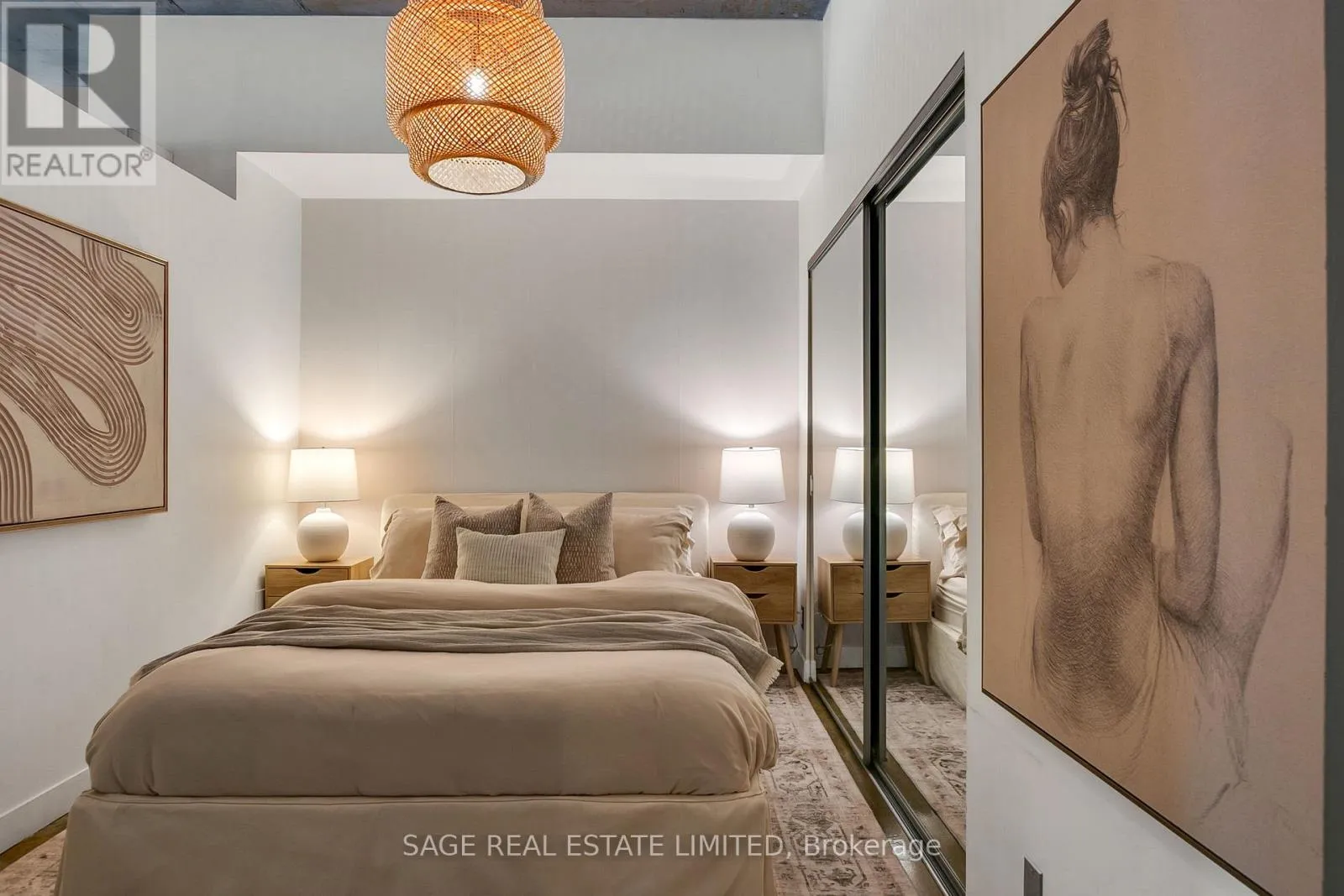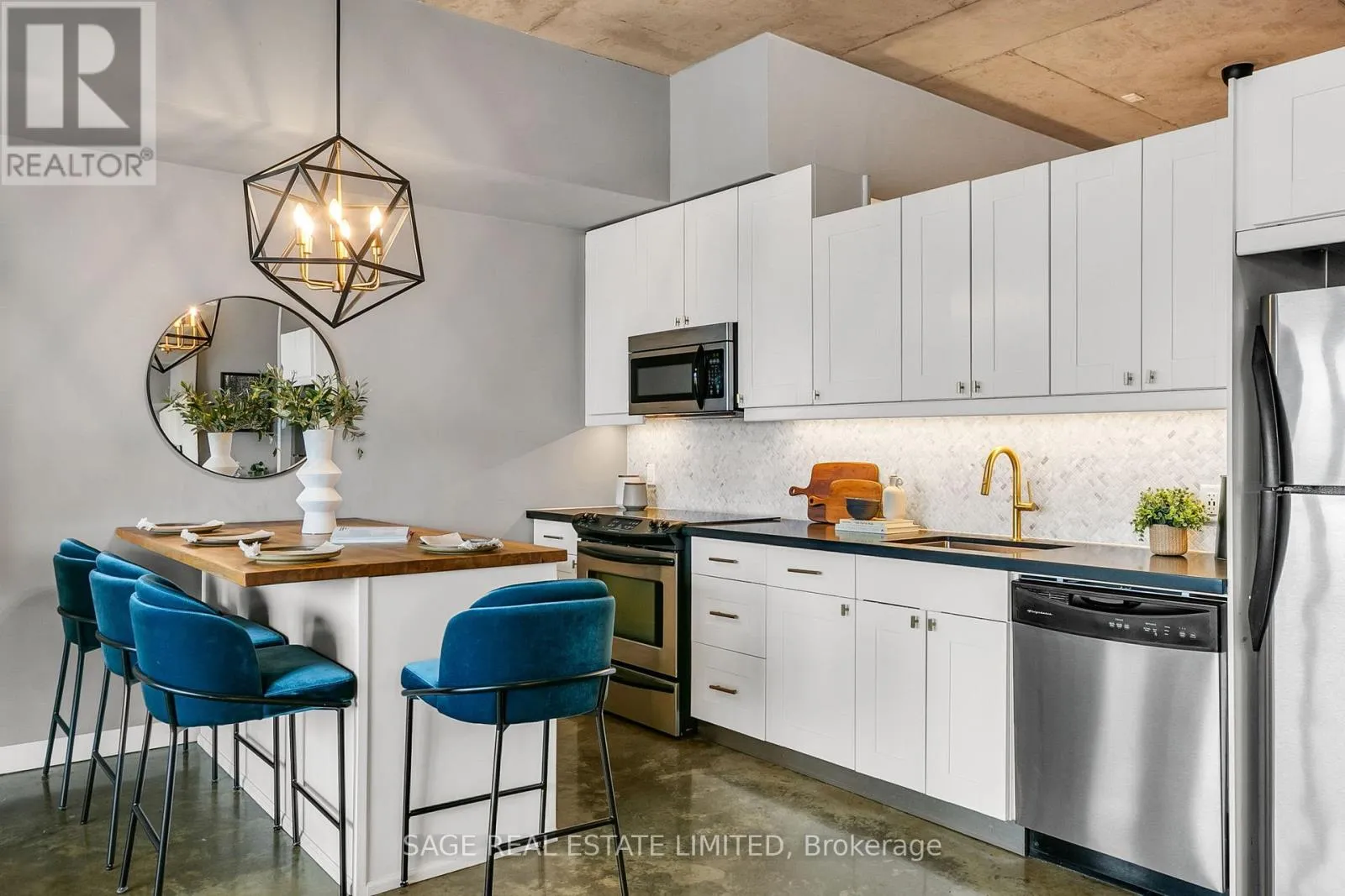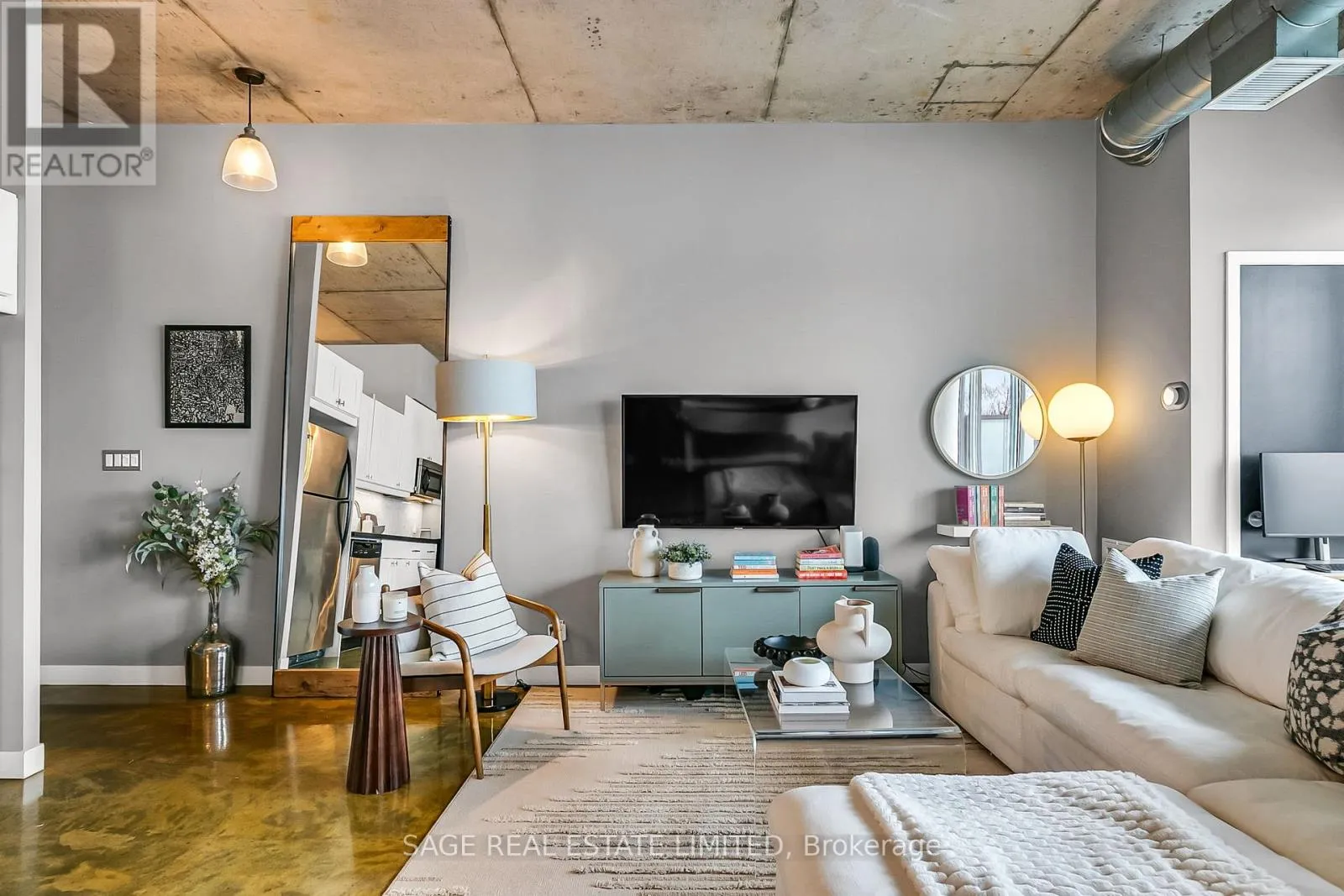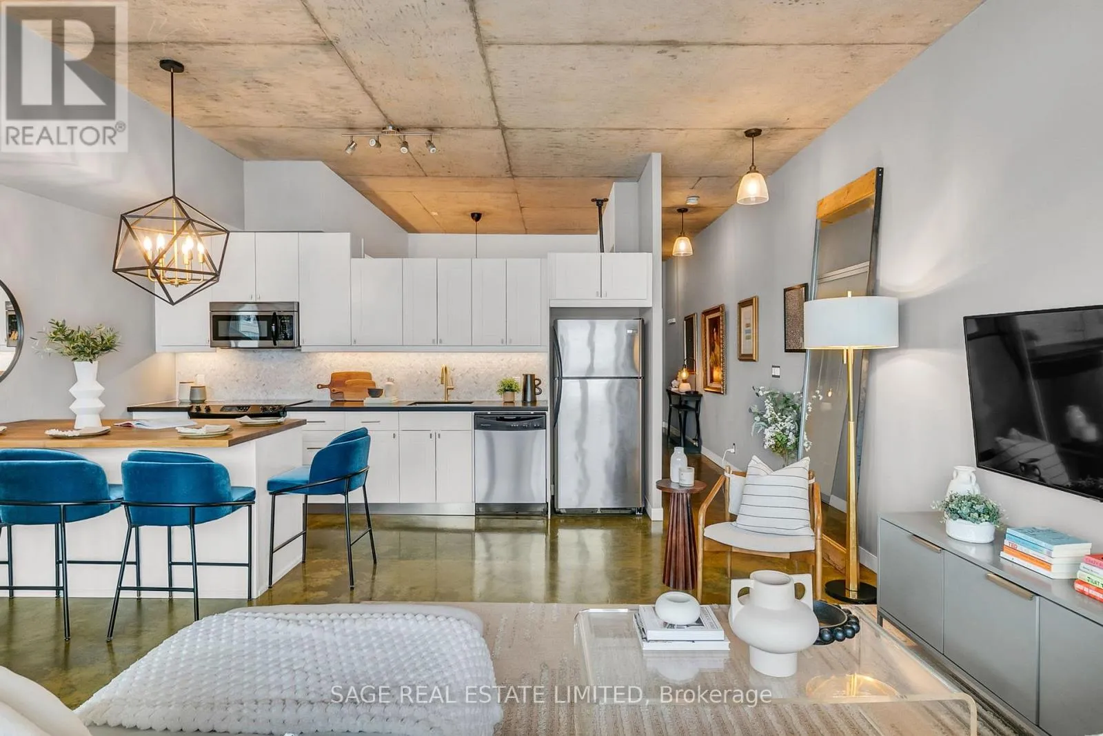 Cross Streets: Queen St E & Carlaw Ave. ** Directions: From Queen St E: north on Carlaw Ave, east on Dundas St E, south on Boston Ave (park on Boston). Welcome to The Printing Factory Lofts in the heart of Leslieville, Toronto's east-end neighbourhood known for its independent spirit, vibrant Queen Street corridor, and authentic hard loft conversions. This south-facing 1 bedroom, 1 bathroom residence offers over 700 square feet of thoughtfully designed living space in one of the area's most coveted industrial buildings. Inside, original green stained concrete floors ground the space in true hard loft character. A soaring heritage pillar is revealed as you move through the unit, intentionally positioned to let the layout unfold with subtle architectural drama. The updated kitchen and modernized bathroom feature clean, contemporary finishes that contrast beautifully with the building's industrial roots. Nothing to renovate. Nothing to rethink. Just move in. Living here means stepping directly into the rhythm of Leslieville. Morning runs to Woodbine Beach. Winter skating at nearby neighbourhood parks. Swim at local community pools. Patio evenings along Queen Street East. A two-minute walk to Crow's Theatre. Quick streetcar access downtown and easy routes out of the city via the DVP and Lakeshore. Ideal for young professionals seeking a stylish Toronto hard loft with downtown access, or for end users who value authentic architecture, community energy, and lifestyle over cookie-cutter condo living. This is for buyers who understand that location is not just proximity. It is immersion. This is where Leslieville actually happens. (id:27476)