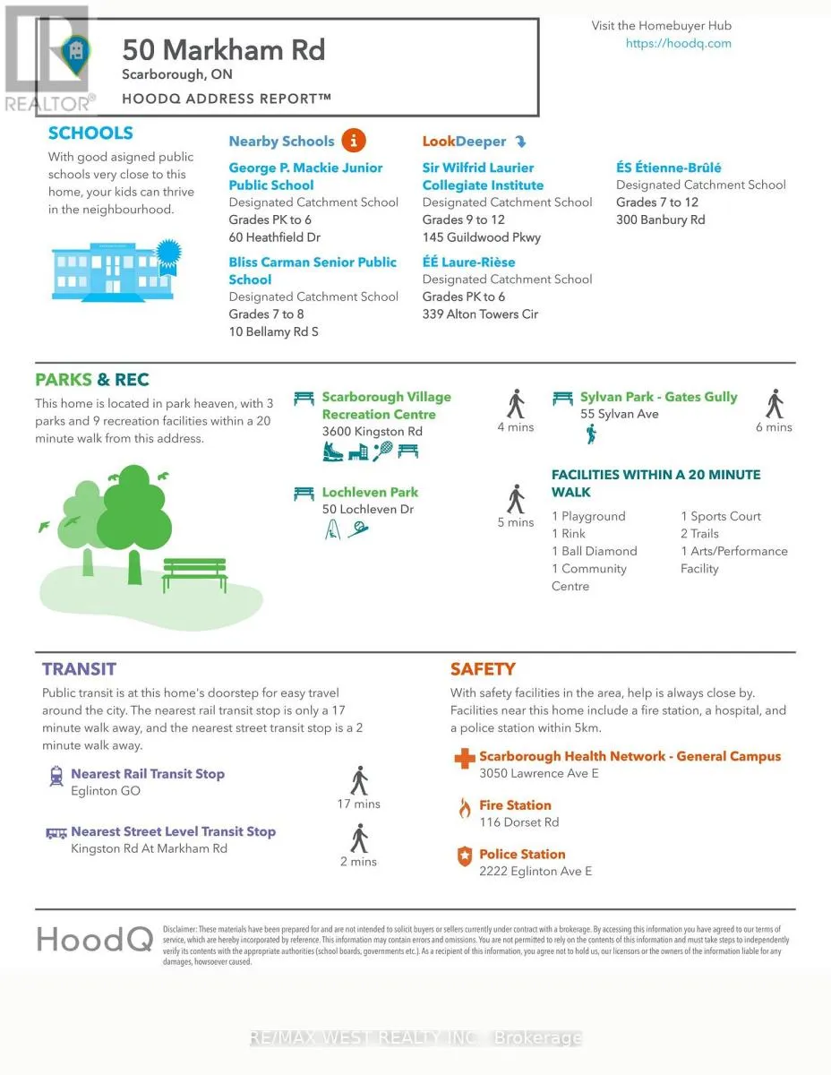 Cross Streets: Markham Rd south of Kingston Rd. ** Directions: South of Kingston Rd. Welcome to 50 Markham Rd #2 - a rare gem tucked away in an exclusive enclave of just 18 townhomes! Enjoy the benefits of townhouse living without the typical high-rise condo compromises. This quiet, safe, and well-maintained community offers low maintenance fees while placing you just minutes from everything you need. Step inside to find a spacious and functional layout featuring 3 generously sized bedrooms and a finished basement-perfect as an additional bedroom, home office, or recreation space. The primary bedroom has double closets, and a large walk out balcony. Great for morning coffee, or relaxing in the evening looking out at the stars. The home also boasts a private 1 car garage parking space and driveway with additional parking space. The large outdoor back deck, ideal for entertaining or relaxing with family. The updated kitchen includes a new countertop, stainless steel sink, and a built-in dishwasher, offering both style and convenience. Tons of natural light flows just as you walk in. Location is unbeatable-close to GO Station, public transportation, schools, recreation centre, shopping, places of worship, Scarborough Golf Club, and the stunning Scarborough Bluffs. Nature lovers will also appreciate nearby walking trails and green spaces around Guildwood Park. Perfect for first-time home buyers or those looking to downsize without leaving the city, this home offers comfort, convenience, and exceptional value. Why settle for a condo when you can enjoy more space, privacy, low maintenance fees and a true sense of community? (id:27476)
