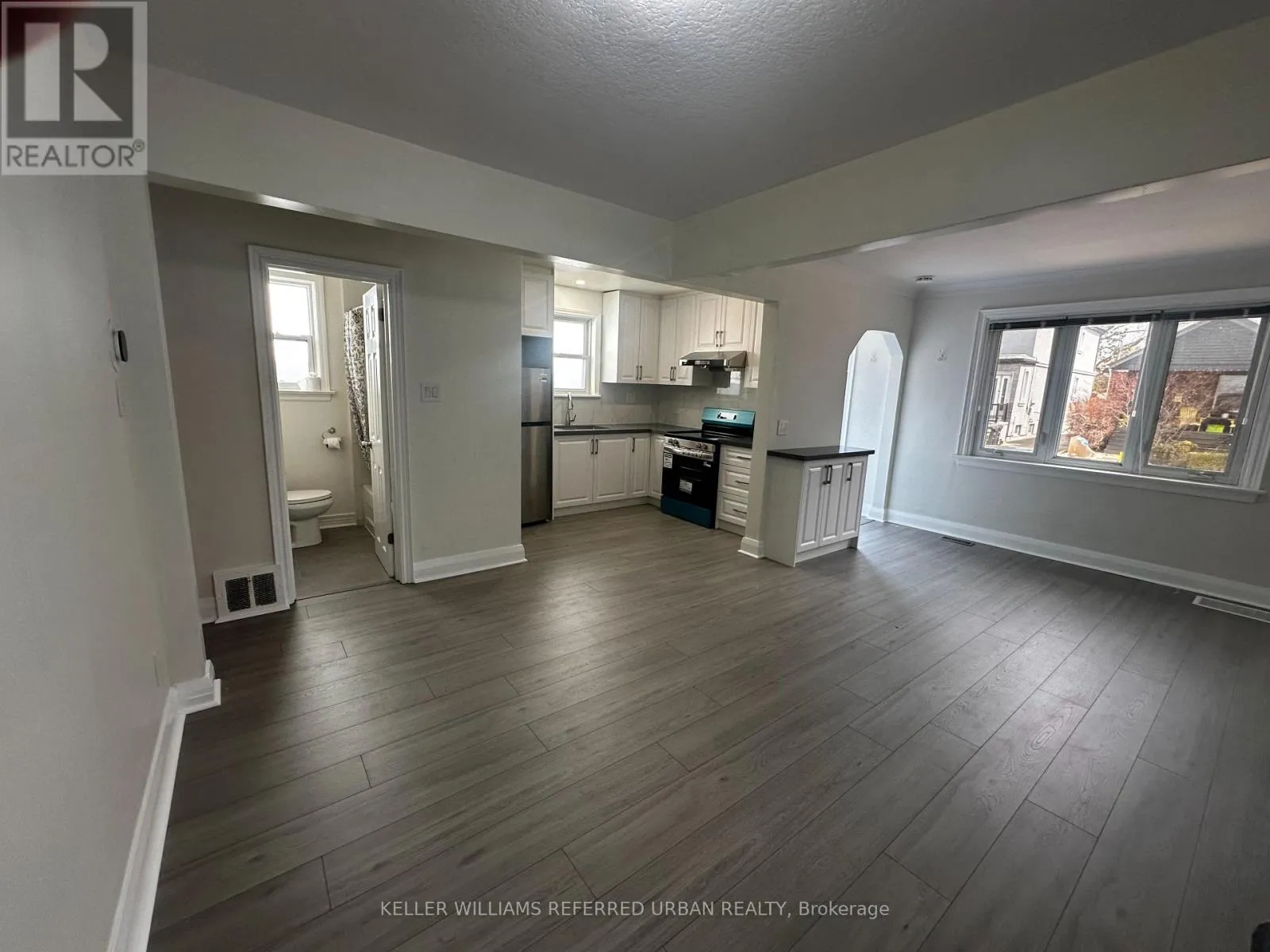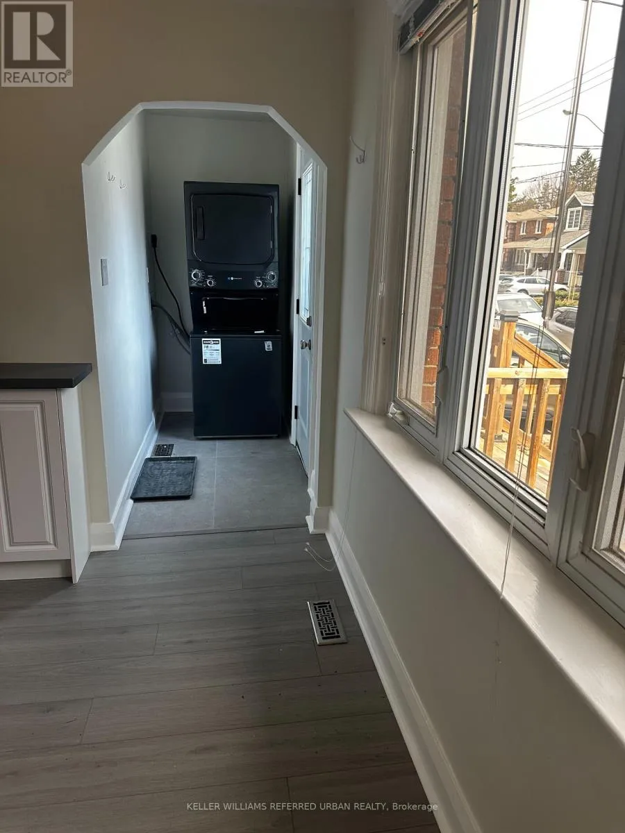 Cross Streets: Woodbine Danforth. ** Directions: Woodbine Danforth NE. Newly renovated Open concept 2 bedroom main floor of a bungalow located on quiet street (Cedarvale Avenue). Open concept living/dining room/ kitchen. New roof. New kitchen, stove, fridge and fan. New stacked ensuite washer and dryer. New flooring throughout. Freshly painted walls. Central A/C. Exclusive use of backyard on 25 X 100 ft. lot. Legal parking pad for 1 car.Easy access to DVP. Three minute walk (or 400 metres) to Woodbine subway station and to Valu-mart grocery store and Danforth Ave. (id:27476)