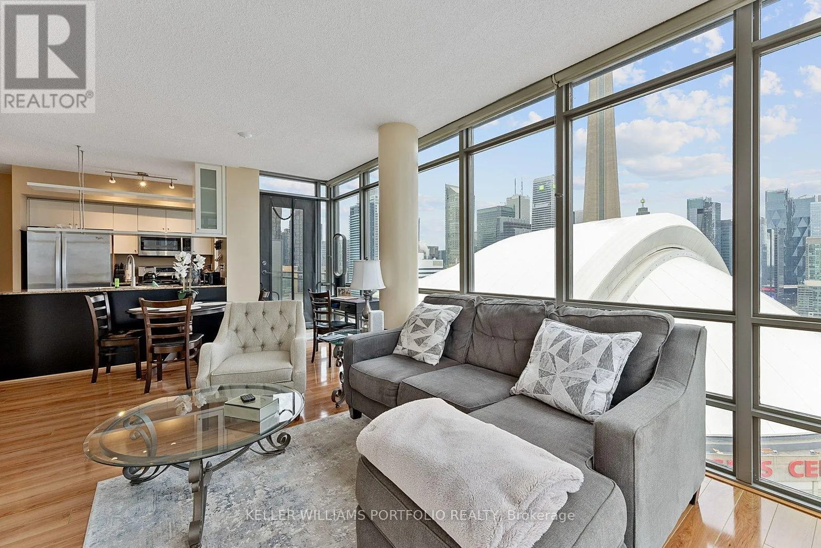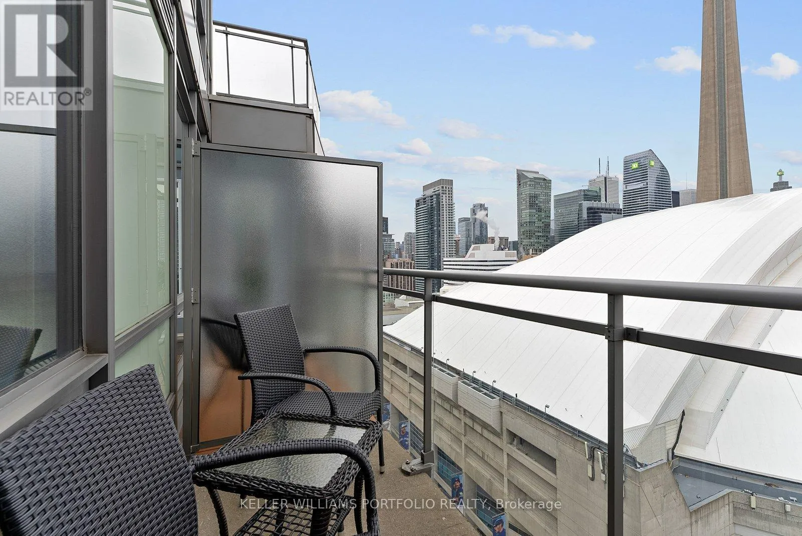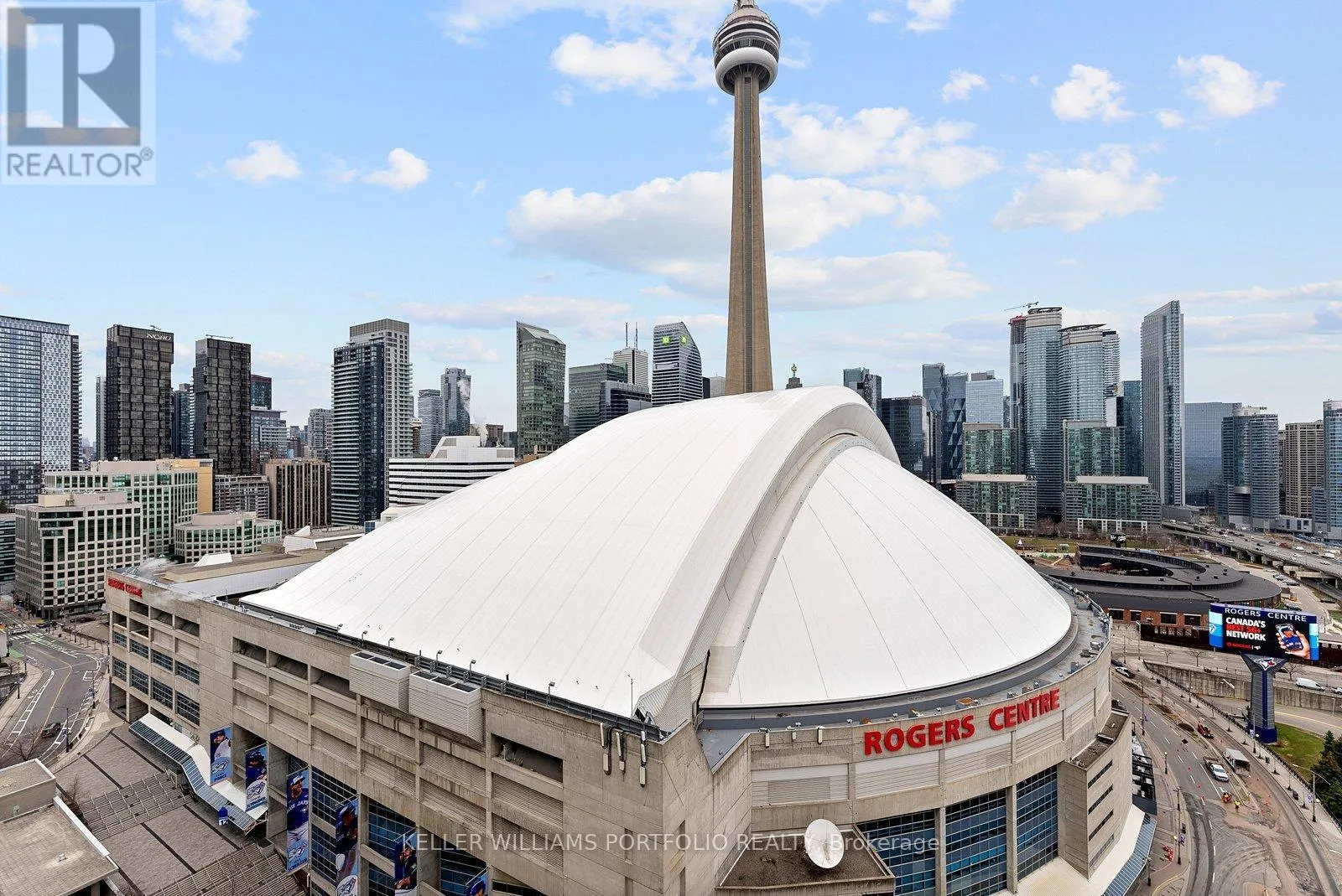 Spadina Ave / Bremner Blvd Must-see listing for a stunning 1+1 bedroom corner unit. This property features an open-concept floor plan with floor-to-ceiling windows and spectacular southeast views of the city, the lake, and the Rogers Centre-you can even enjoy baseball games directly from your balcony.Residents have access to the 30,000 sq. ft. Super Club, which includes an indoor pool, a large gym, a spinning studio, and basketball, squash, and tennis courts. Additional amenities include a media room, bowling alley, and an outdoor terrace with BBQ facilities. (id:27476)