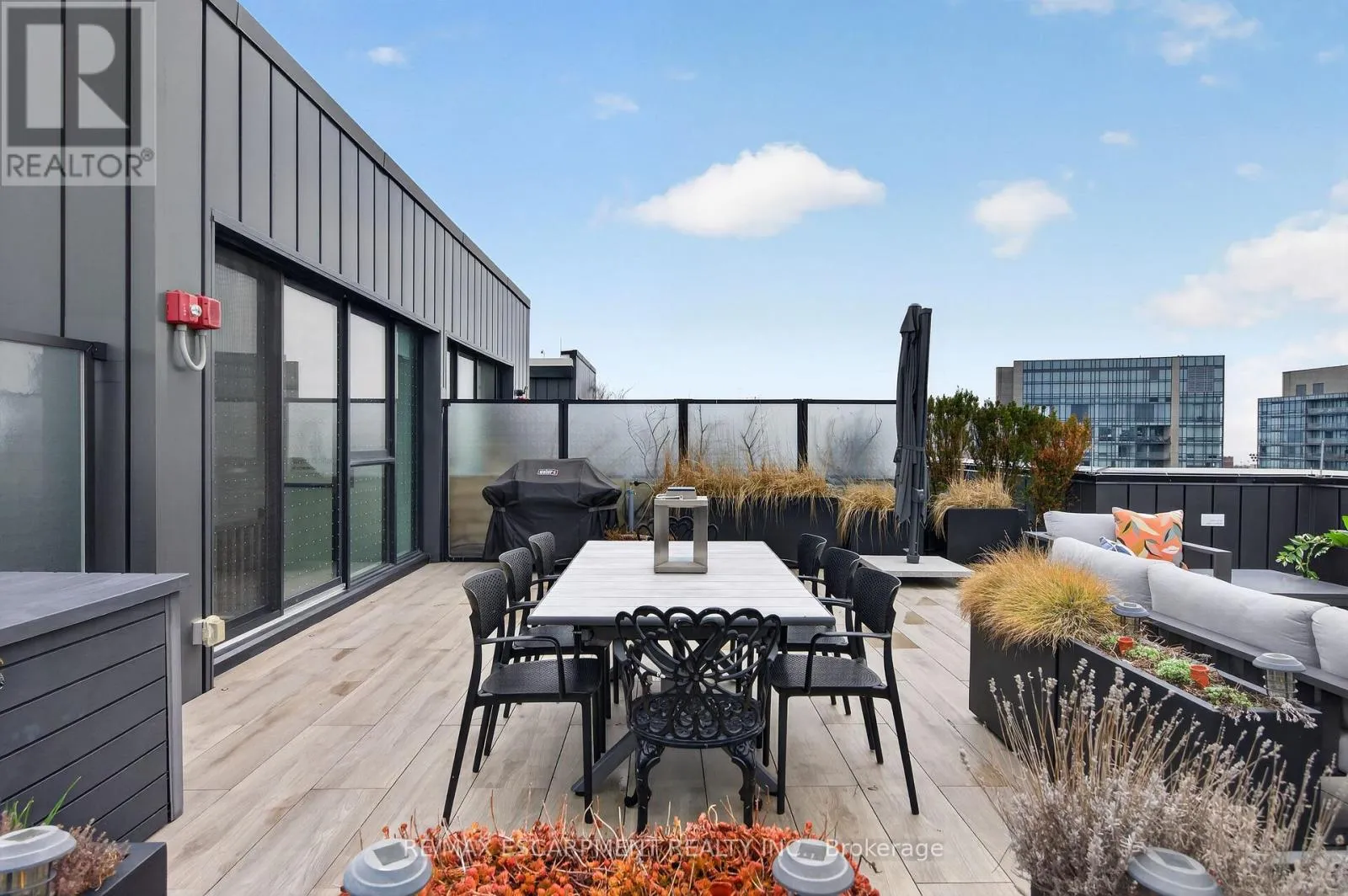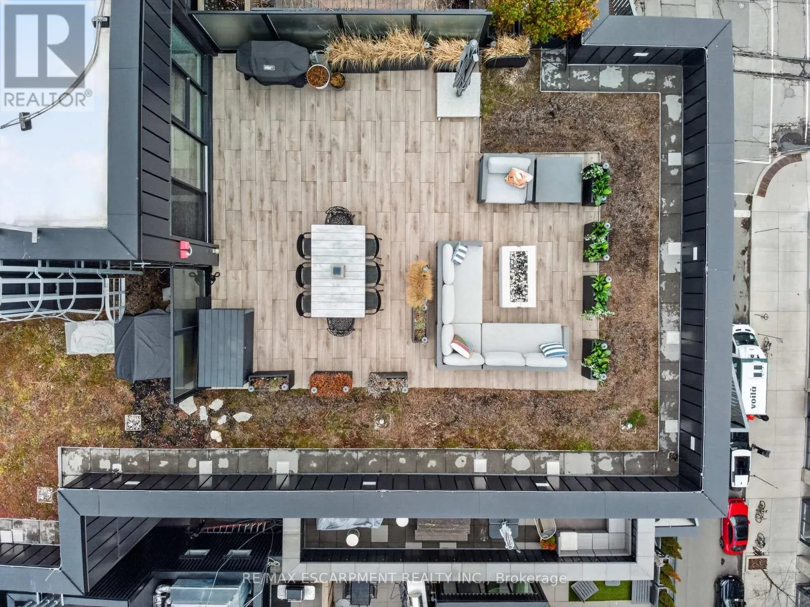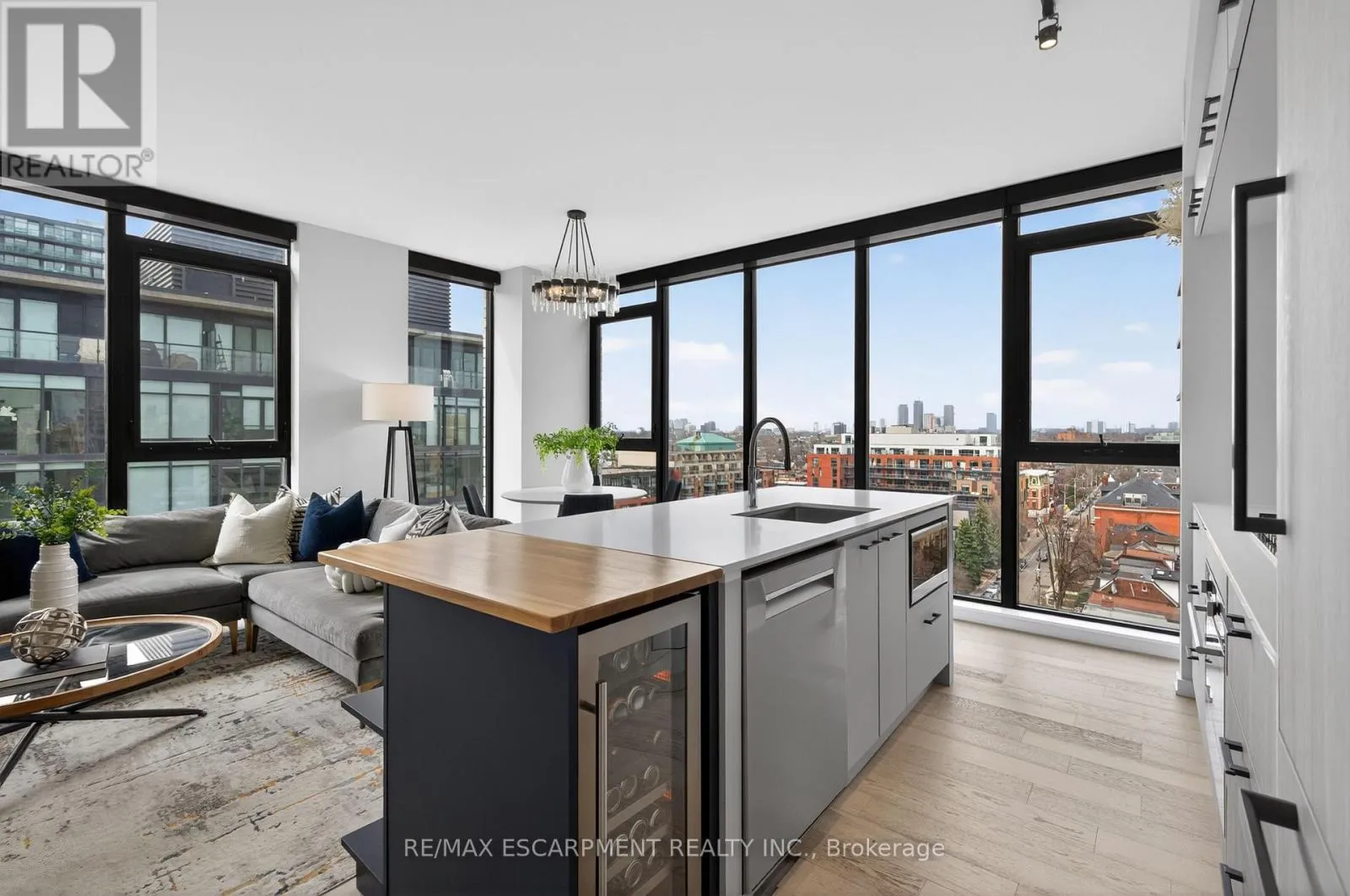 Cross Streets: Queen St. ** Directions: Queen St to Dovercourt Rd. This luxurious penthouse corner suite offers the epitome of urban living with a stunning oversized rooftop terrace, located in one of Queen West's most sought-after boutique residences, The Plant. The unique 1,335 sq. ft. 3-bedroom, 2 full bathroom suite is wrapped in floor to ceiling windows, flooding the open-concept living area and bedrooms with natural light. The suite provides incredible west and south views (including views of Lake Ontario and BMO field for World Cup fans) and unobstructed north-west views that catch stunning spring, summer and fall sunsets over the Toronto horizon. The suite boasts top of the line finishes and custom designs throughout. The gourmet Chefs kitchen features a butcher block island extension with wine fridge, custom shelving and high-end appliances including gas range cooktop. The primary bedroom features a spa-like ensuite with his & her sinks, a custom-built oversized walk-in closet and combination blackout/semi-blackout blinds. Additional automated semi-blackout blinds are located in the living area. Custom-built walk-in storage area and oversized drawers are located under the stairs for maximum storage. The pièce de resistance of this incredible penthouse suite is the rare and private rooftop terrace. A true outdoor sanctuary finished with custom porcelain pavers with B/I lighting, gas hook-up and hose bib - all encircled by meticulously maintained sedum green roof. This outdoor oasis is one-of-a-kind, perfect for entertaining or quiet relaxation while you enjoy the breathtaking views. Don't miss this rare opportunity to own one of the limited penthouse suites in this award winning environmentally conscious building (equipped with geothermal heating/cooling systems), just steps from an upcoming new GO station. Suite comes complete with ONE underground parking (with EV charger) and TWO lockers. Recent upgrades include washer/dryer (2025), dishwasher (2025), heat pump compressor (2022) and heat pump motherboard controls (2026). (id:27476)