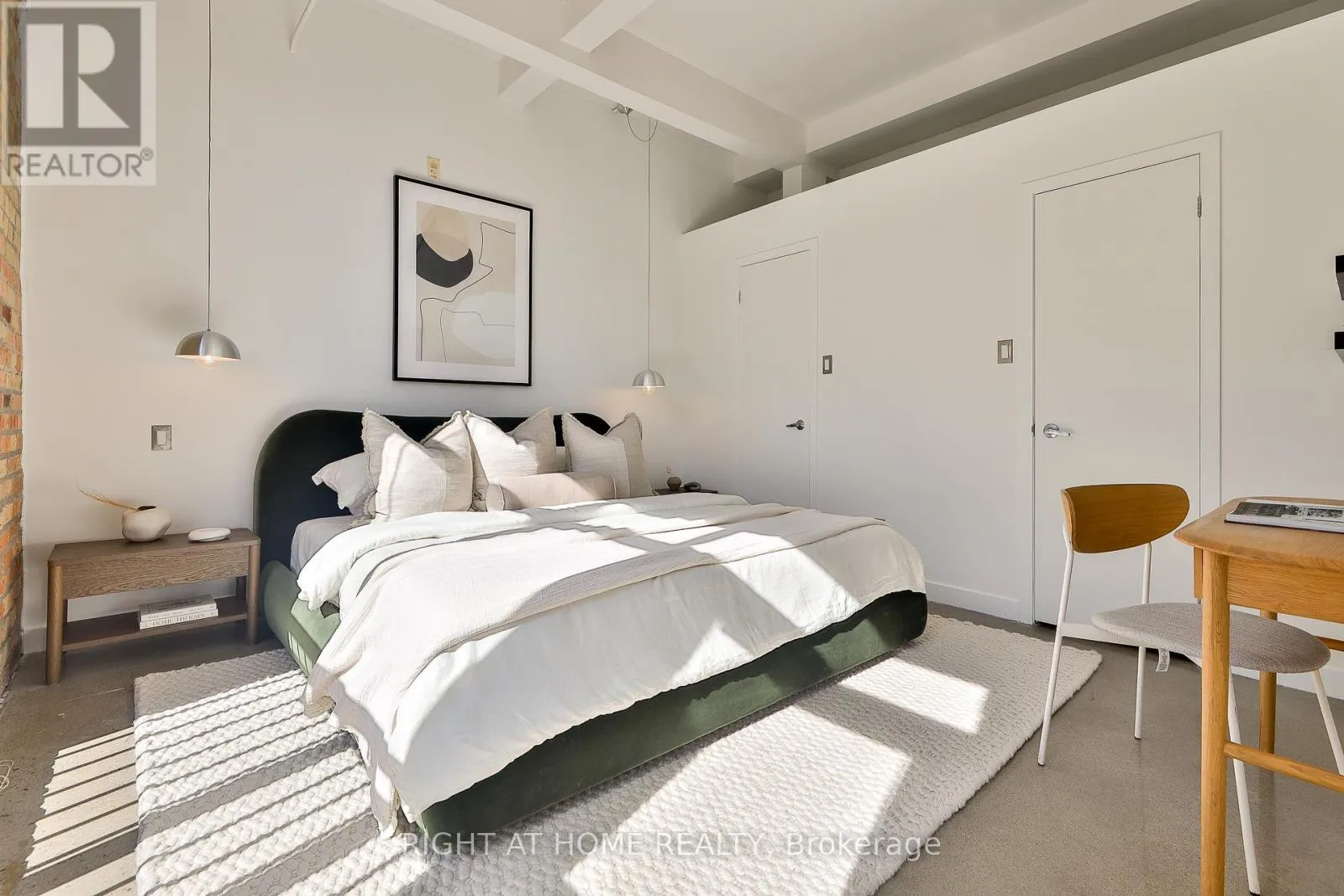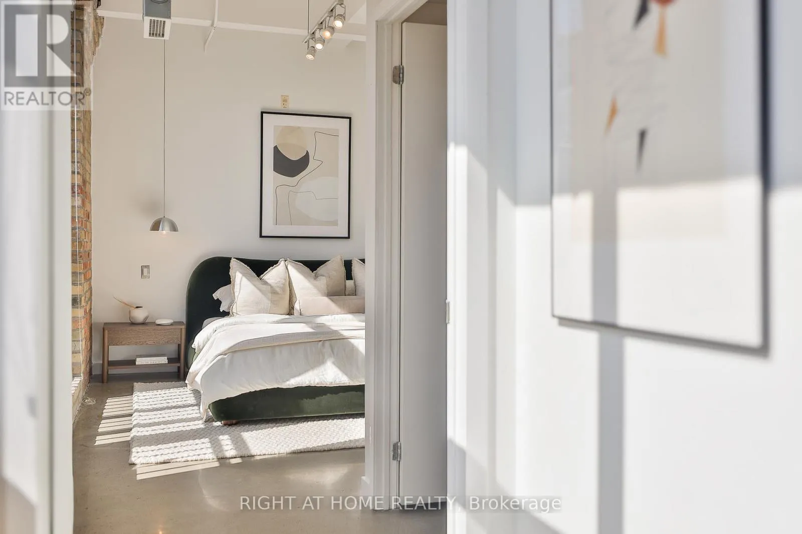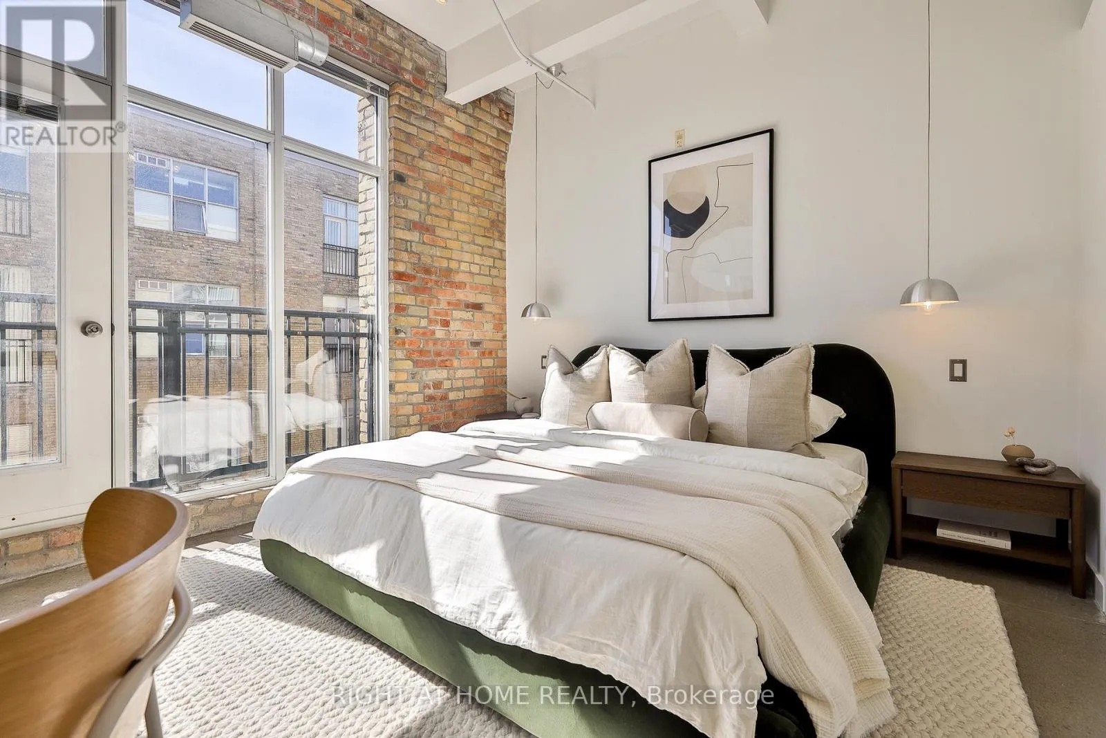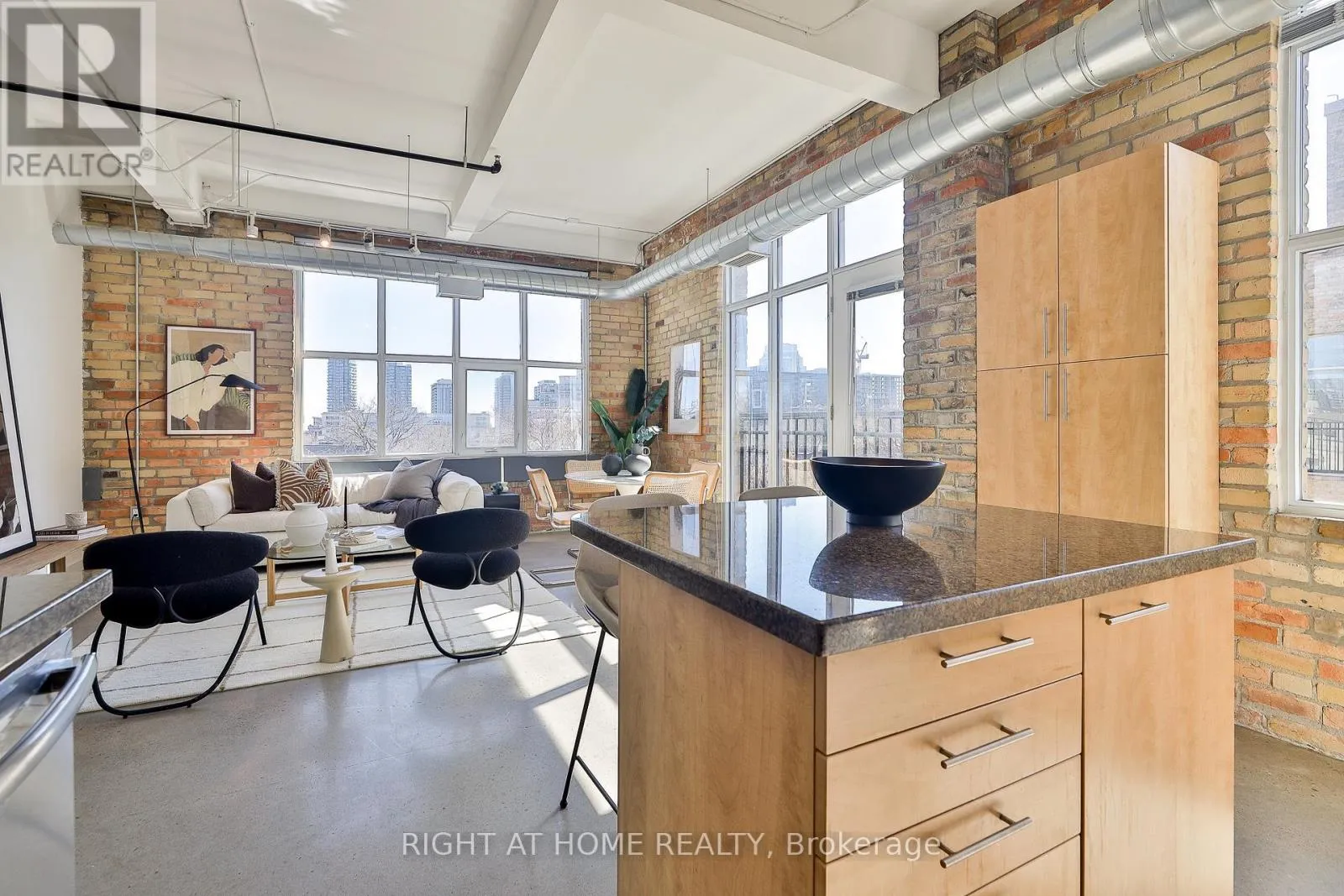 Cross Streets: Queen St W/Strachan Ave. ** Directions: Queen & Crawford. Authentic hard loft living at the iconic Chocolate Company Lofts, directly across from Trinity Bellwoods Park. A rare southwest corner 2-bedroom suite, tucked away from Queen and overlooking a quiet, tree-lined residential pocket - offering the perfect blend of natural light and privacy. Rich in character with exposed brick, original beams, polished concrete floors and soaring ceilings. This thoughtfully designed loft features a functional split 2-bedroom layout, two full bathrooms and a well-appointed kitchen with full-size stainless steel appliances, stone countertops, a large eat-in island and ample storage. The spacious primary bedroom features two walk-in closets and a 4-piece ensuite. Queen West at your doorstep and moments to Ossington, Dundas West, King West, and the city's best restaurants, cafés, and boutiques - with TTC at your doorstep. Parking, storage locker and a double bike rack included. Building features 24hr security/concierge, a nicely outfitted gym and spacious party room. (id:27476)