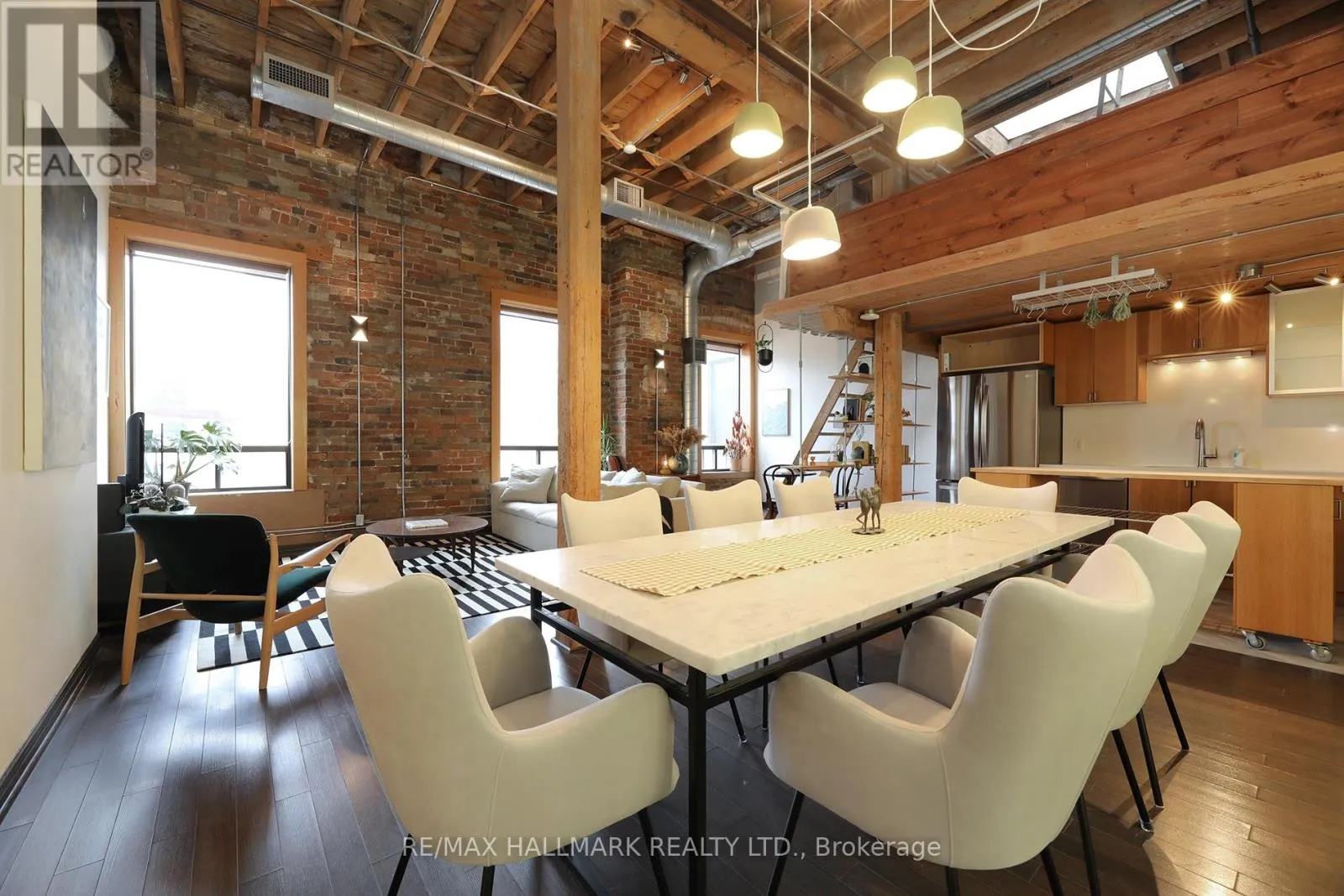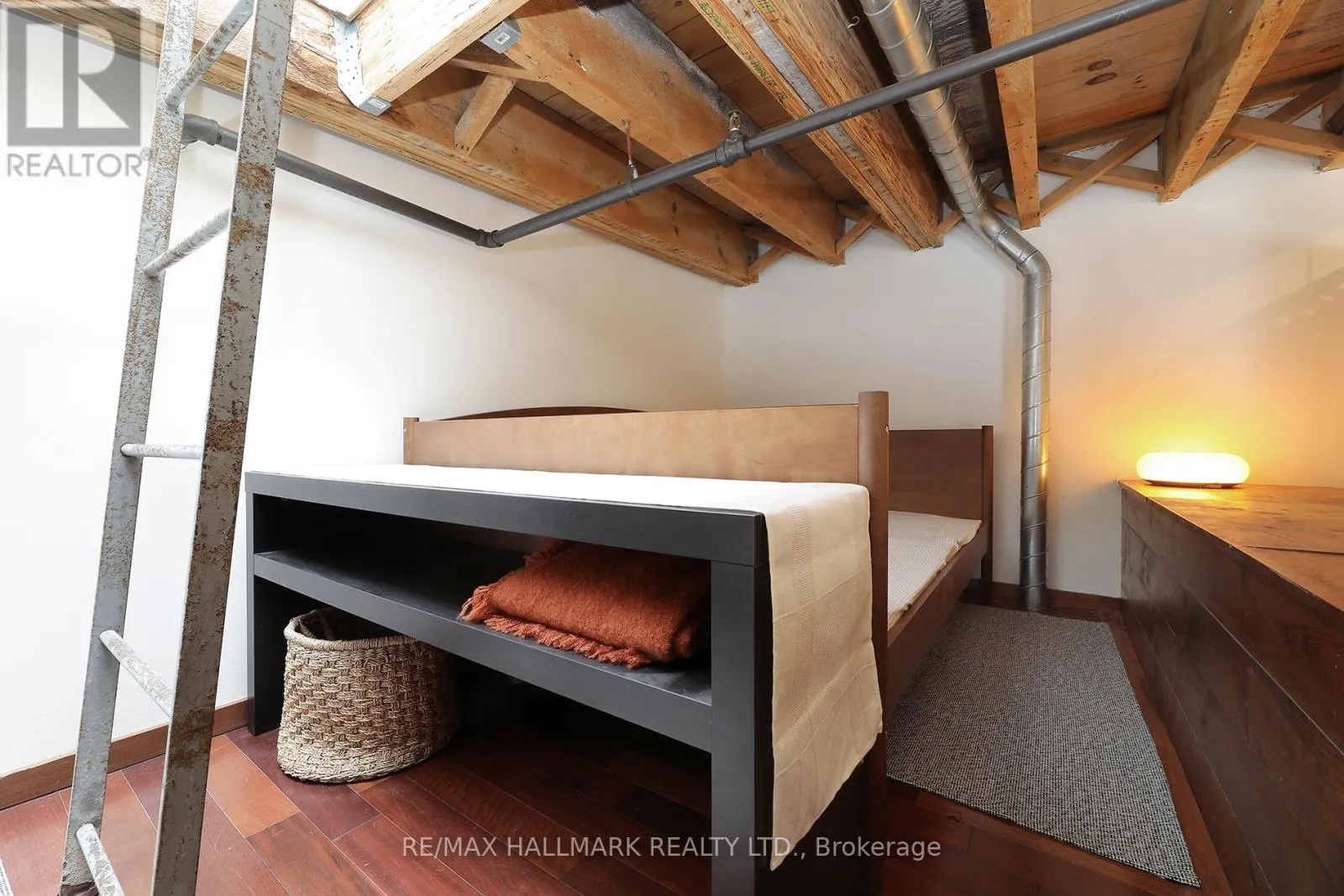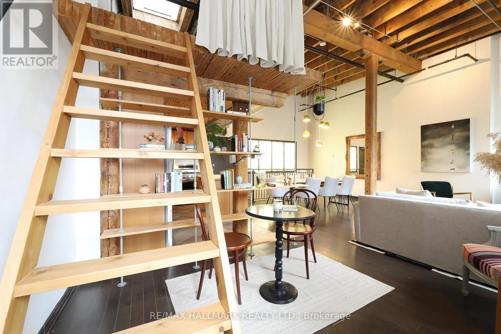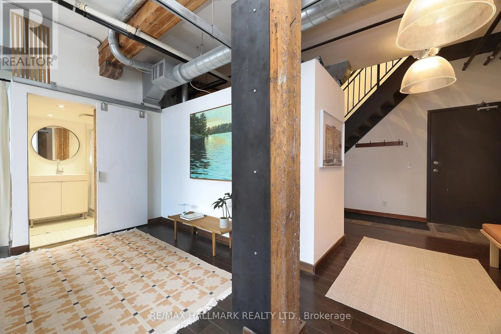 Cross Streets: Queen St E & Jarvis. ** Directions: Queen St E between George & Sherbourne. Welcome to the iconic live/work Boiler Factory Lofts at 189 Queen St E--a boutique heritage conversion w/ just 11 exclusive units. This one-of-a-kind, 1300+ sq ft, 2-storey hard loft w/ mezzanine, rare 1+2 bedroom layout, 2 full washrooms, & a rooftop terrace blends historic character w/ modern living. Authentic post & beam construction showcases exposed brick, original wood beams, reclaimed industrial lighting, & soaring 14-foot ceilings w/ oversized factory-style windows. The lower level, w/ its own private entrance, features a primary suite w/ walk-in closet, 3-piece ensuite washroom, & attached den/office (potential 2nd bedroom). Finished w/ hardwood floors, exposed beams, sliding warehouse doors, & a spacious foyer w/ industrial lighting. Includes ensuite laundry & a 4-piece guest washroom w/ cement countertop, porcelain tile, & wood slat ceiling. Upstairs, the main level impresses with soaring 14-foot ceilings, exposed beams, brick, & ductwork. The open-concept living/dining/lounge space is anchored by an island kitchen w/ herringbone vinyl flooring, stainless steel appliances, gas stove, & quartz countertop/backsplash. A separate entrance adds flexibility, while a forest-themed light installation creates a unique focal point. Perched above is a 135+ sq ft loft offering flexible space for sleeping or relaxing, w/ ladder access to the expansive east-facing rooftop terrace (330+ sq ft), fully fenced & ideal for dining or entertaining. The terrace can also be accessed through the common stairway. Located downtown w/ unbeatable access--steps to St. Lawrence Mkt, Eaton Centre, Distillery & Financial Districts, plus top dining & nightlife. The upcoming Ontario Line stop across the street will further enhance connectivity & long-term value. Moss Park is undergoing major revitalization, including a new recreation centre, pools, track, & redesigned green space. A rare chance to own a piece of Toronto's industrial history--perfect for those who refuse the ordinary. (id:27476)