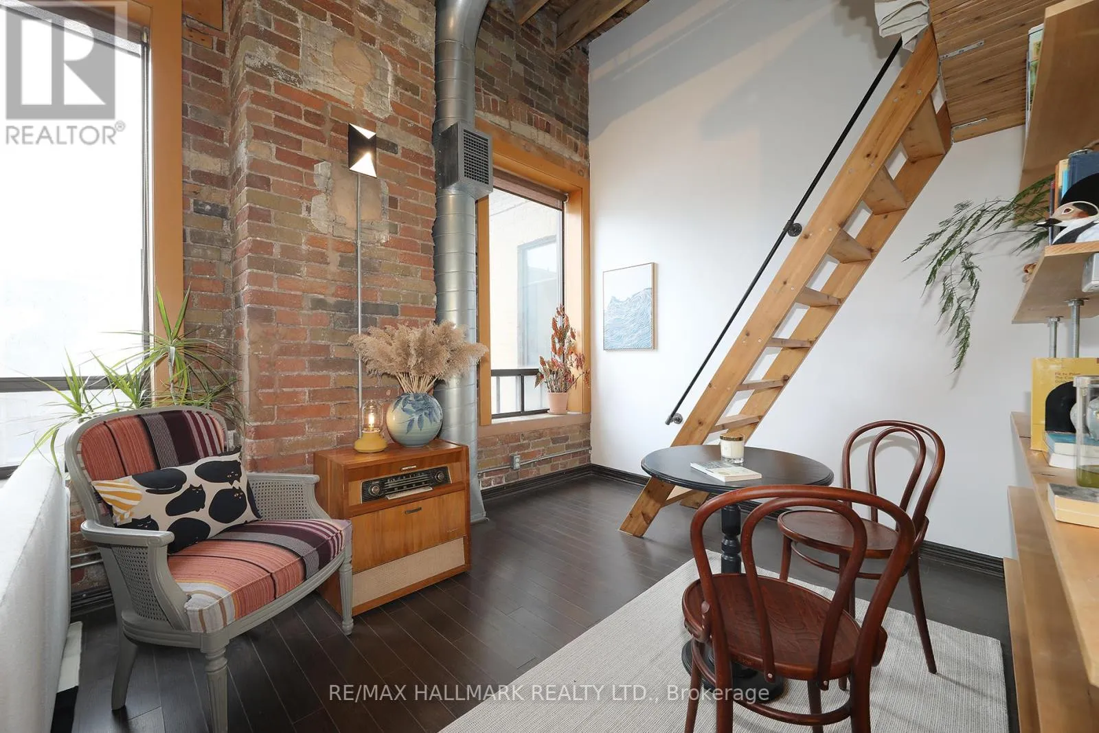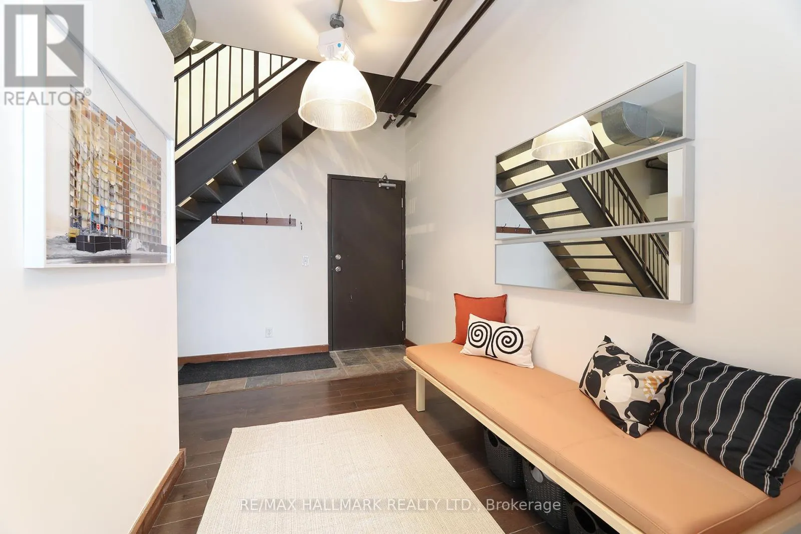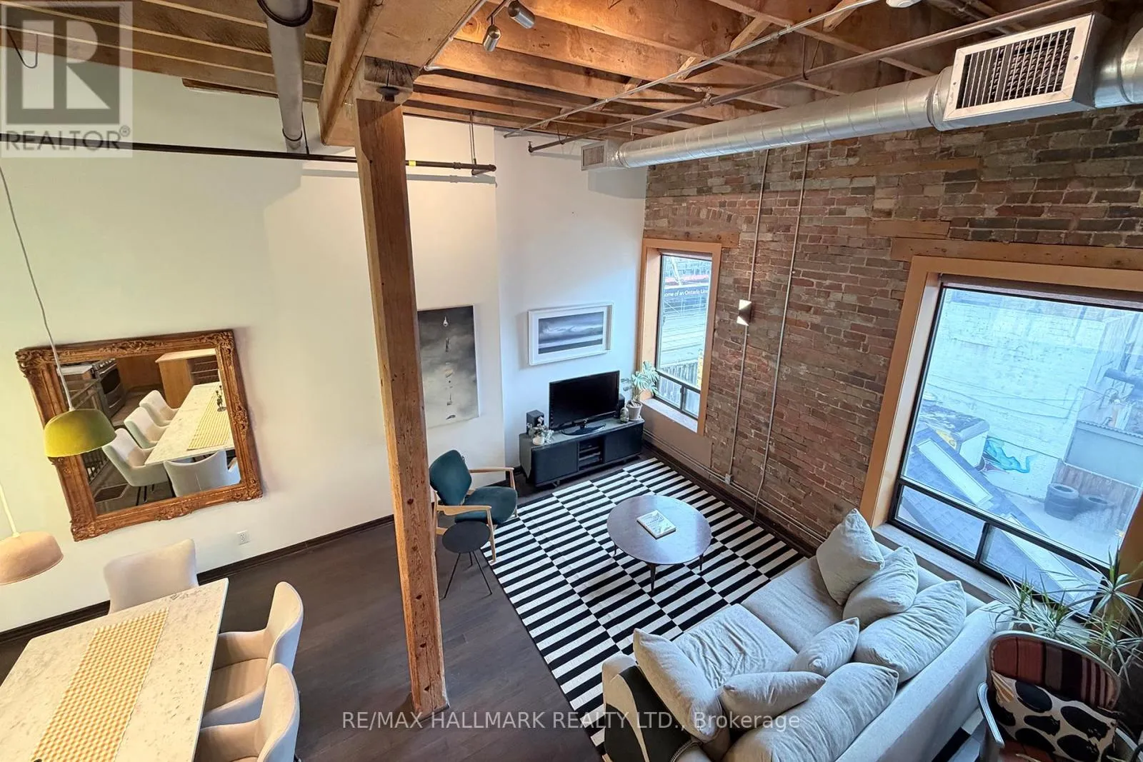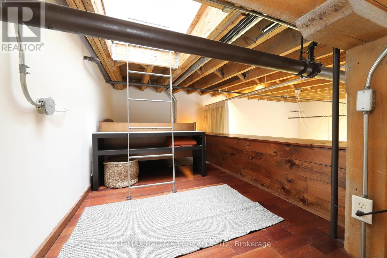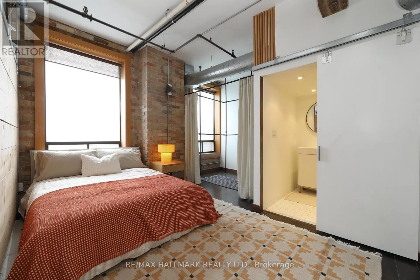 Cross Streets: Queen St E & Jarvis. ** Directions: Queen St E between George & Sherbourne. Welcome to the iconic live/work Boiler Factory Lofts at 189 Queen St E--a boutique heritage conversion w/ just 11 exclusive units. This one-of-a-kind, 1300+ sq ft, 2-storey hard loft w/ mezzanine, rare 1+2 bedroom layout, 2 full washrooms, & a rooftop terrace blends historic character w/ modern living. Authentic post & beam construction showcases exposed brick, original wood beams, reclaimed industrial lighting, & soaring 14-foot ceilings w/ oversized factory-style windows. The lower level, w/ its own private entrance, features a primary suite w/ walk-in closet, 3-piece ensuite washroom, & attached den/office (potential 2nd bedroom). Finished w/ hardwood floors, exposed beams, sliding warehouse doors, & a spacious foyer w/ industrial lighting. Includes ensuite laundry & a 4-piece guest washroom w/ cement countertop, porcelain tile, & wood slat ceiling. Upstairs, the main level impresses with soaring 14-foot ceilings, exposed beams, brick, & ductwork. The open-concept living/dining/lounge space is anchored by an island kitchen w/ herringbone vinyl flooring, stainless steel appliances, gas stove, & quartz countertop/backsplash. A separate entrance adds flexibility, while a forest-themed light installation creates a unique focal point. Perched above is a 135+ sq ft loft offering flexible space for sleeping or relaxing, w/ ladder access to the expansive east-facing rooftop terrace (330+ sq ft), fully fenced & ideal for dining or entertaining. The terrace can also be accessed through the common stairway. Located downtown w/ unbeatable access--steps to St. Lawrence Mkt, Eaton Centre, Distillery & Financial Districts, plus top dining & nightlife. The upcoming Ontario Line stop across the street will further enhance connectivity & long-term value. Moss Park is undergoing major revitalization, including a new recreation centre, pools, track, & redesigned green space. A rare chance to own a piece of Toronto's industrial history--perfect for those who refuse the ordinary. (id:27476)