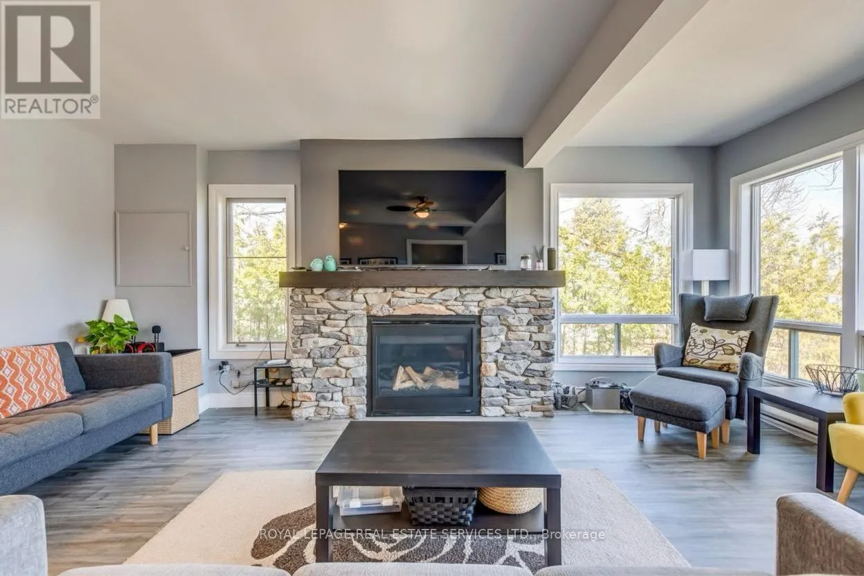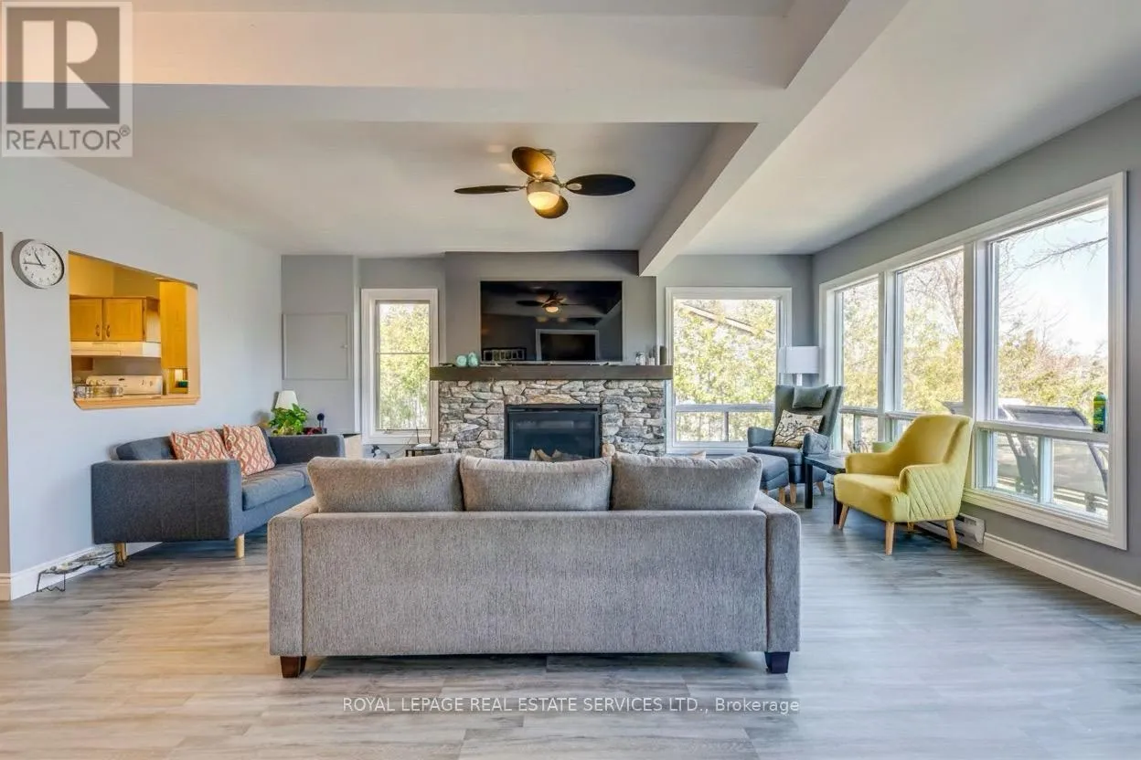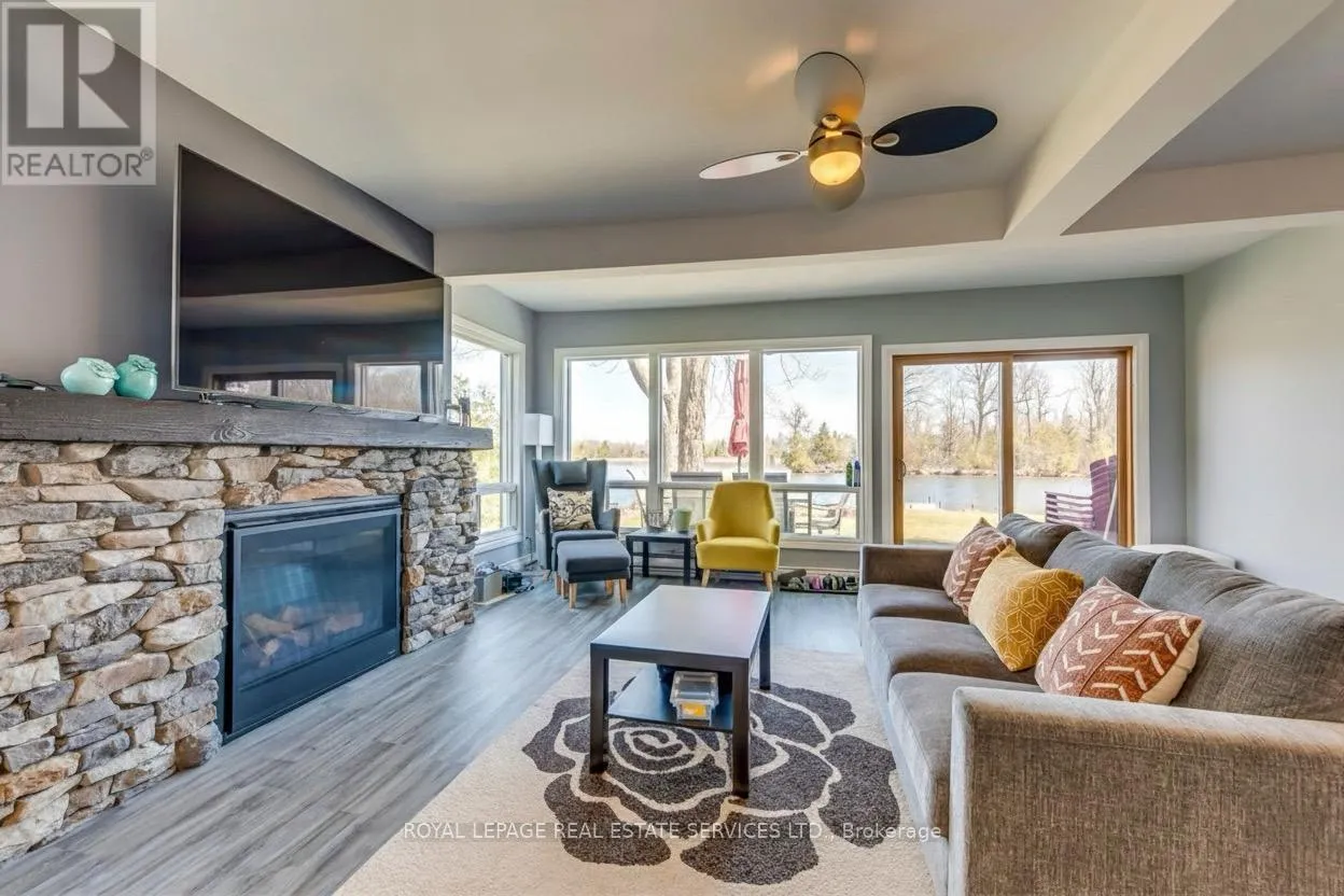 CR30 and Centennial Ln Amazing 4 season cottage with 3 bdrm + den, 2 bath. Bright and Open Dining and Living area with sliding glass doors to the lakeside deck. Enjoy expansive views of the water while relaxing each night by the comfort of the beautifully constructed propane fireplace. Kitchen offers Oak cupboards, dishwasher, double sink, fridge & stove. Baseboard electric heaters keep the cottage cozy & warm all year round.. Fully winterized. Drilled well & holding tank. Detached single car garage and 2 car parking out back. Strong WiFi & cell phone capabilities.50 feet of shoreline along the Trent Severn Waterway offering excellent kayaking, canoeing, swimming, fishing & boating. Very nice level lot with mature trees & privacy hedges along a municipally maintained road with garbage & recycling pick-up. A turn-key Waterfront Property You don't want to Miss! (id:27476)
