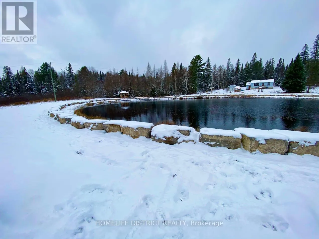 Cty Rd 503 and Reid St Escape to your private 111-acre nature retreat just minutes from Kinmount! This scenic property features mature trees cultivated over many years - perfect for developing trails, private retreats, or campground opportunities. The cozy bungalow offers two bedrooms, a kitchen, and a bright living room with expansive windows overlooking a picturesque 1-acre pond. The finished basement includes a spacious new 3-piece bathroom, dining area, game room, and laundry room. Enjoy a newly built 1,000 sq. ft. deck, two wooden gazebos, and a beautifully maintained grassy landscape surrounding the pond. Perfect setting for outdoor entertaining and relaxation. Recent renovations include a new kitchen, washroom, fresh paint, and all updated appliances. The property also boasts a completely rebuilt 100m driveway, a detached oversized 2-car garage, and a large implement shed. (id:27476)