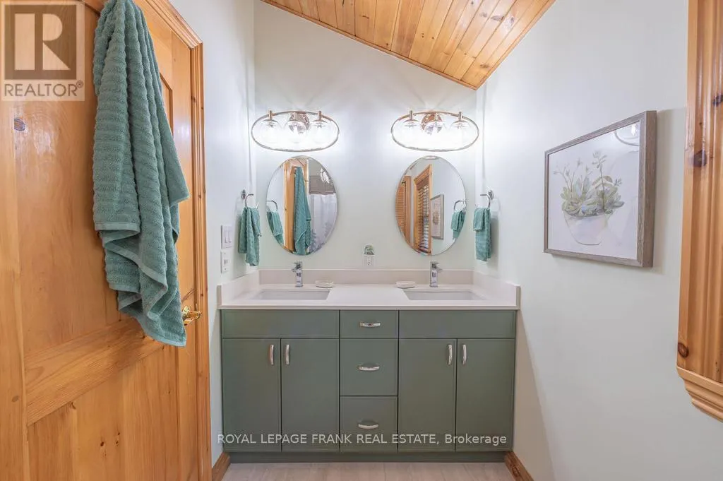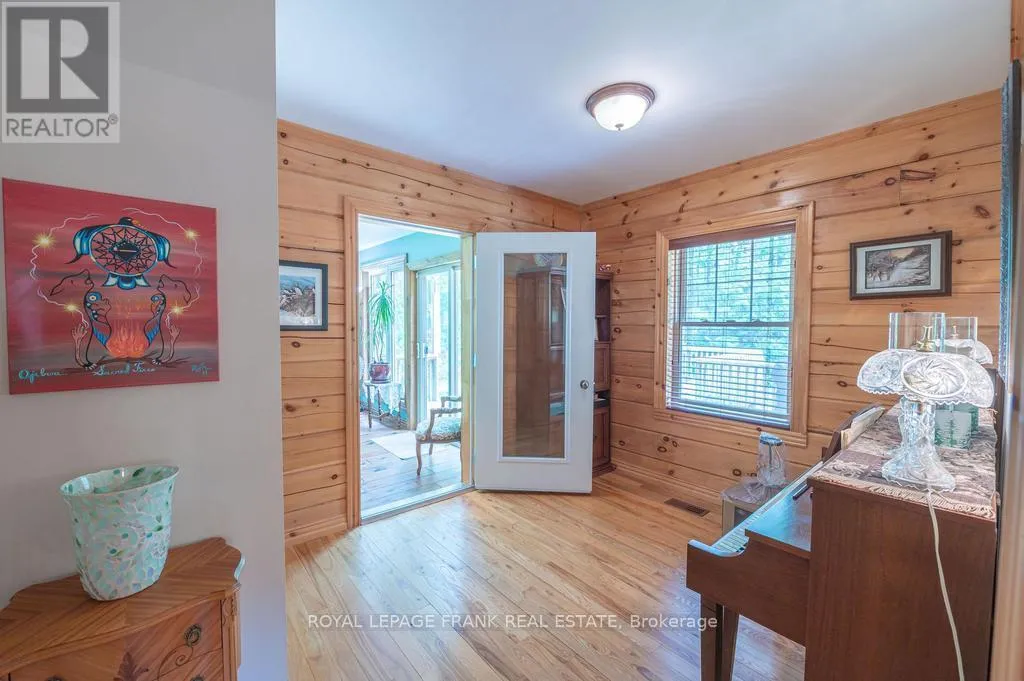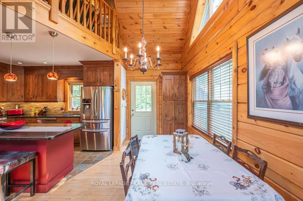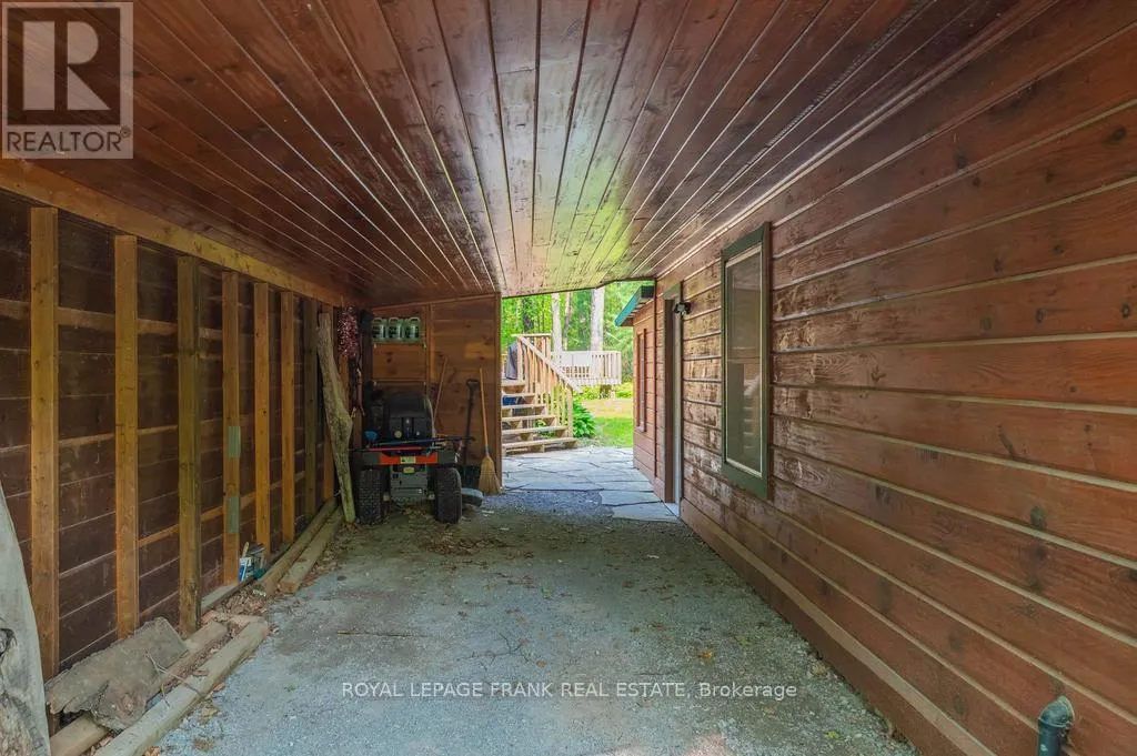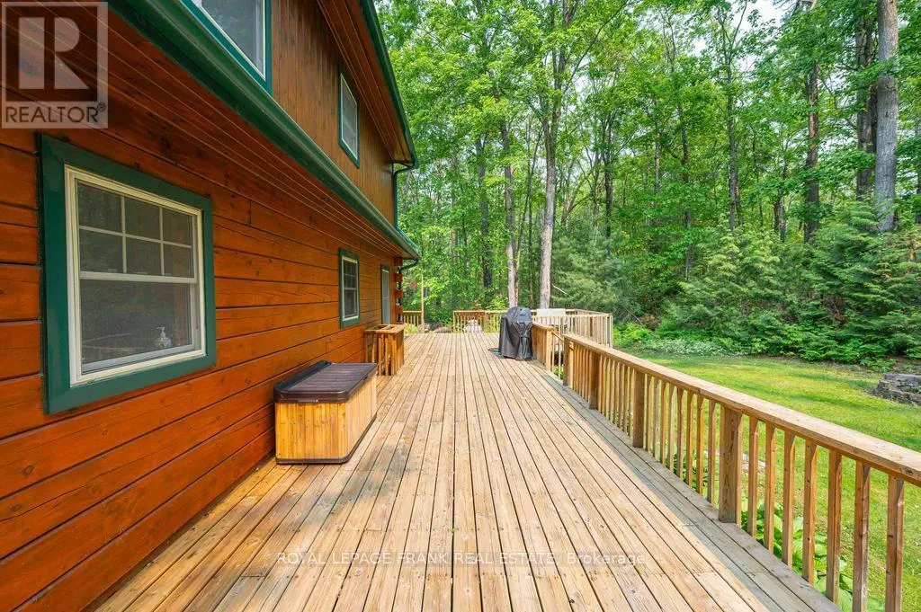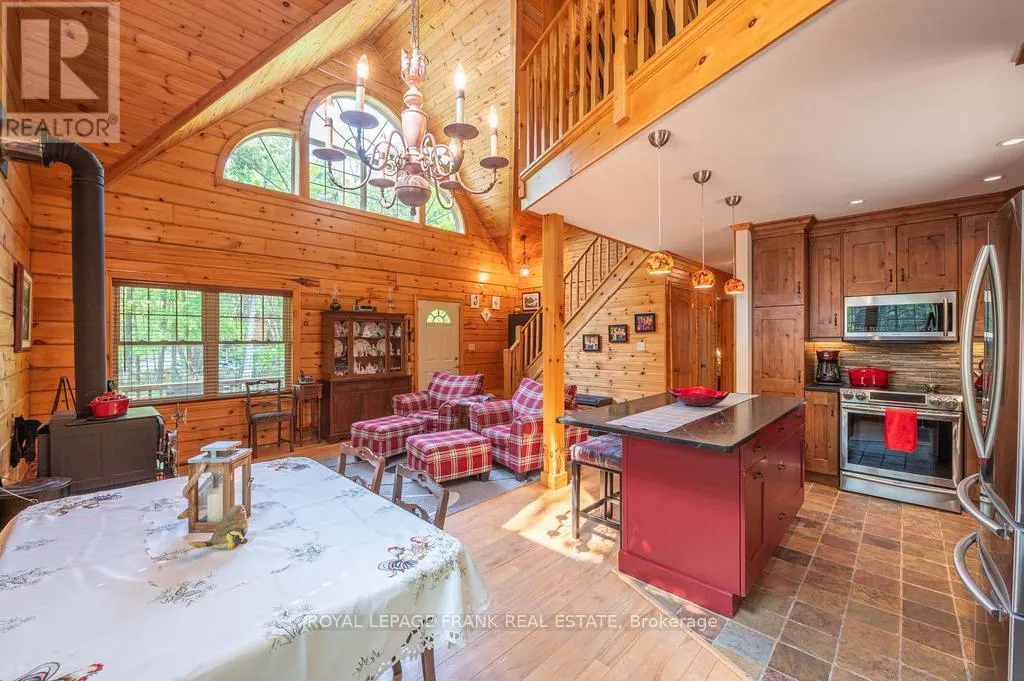 Cross Streets: Sugarbush Cr. and Sugarbush Blvd. ** Directions: Lakehurst to Flynn's Rd to Barcroft to Sugarbush Cr. Well maintained home nestled on 1.5 acre treed lot a short walk to a public access on Pigeon Lake for great swimming. You won't be disappointed by this classic rustic log home featuring 3 bedrooms, 2.5 baths, stunning vaulted ceilings, open concept with a cozy wood stove which is WETT certified. The 4-season sunroom with propane stove overlooks a private treed yard. The updated kitchen with alderwood cabinets and soapstone counters blends perfectly with the open concept living area. The main level bedroom is located across from a newly renovated bathroom. The second floor has a large primary suite with a 5 pc ensuite bathroom plus an office area open to the floor below. The lower level is fully finished with a large family room and plenty of storage. Screened in porch, large deck, perennial gardens and an oversized double car garage with carport. Situated on a township road, and a school bus route, close to the town of Buckhorn. (id:27476)