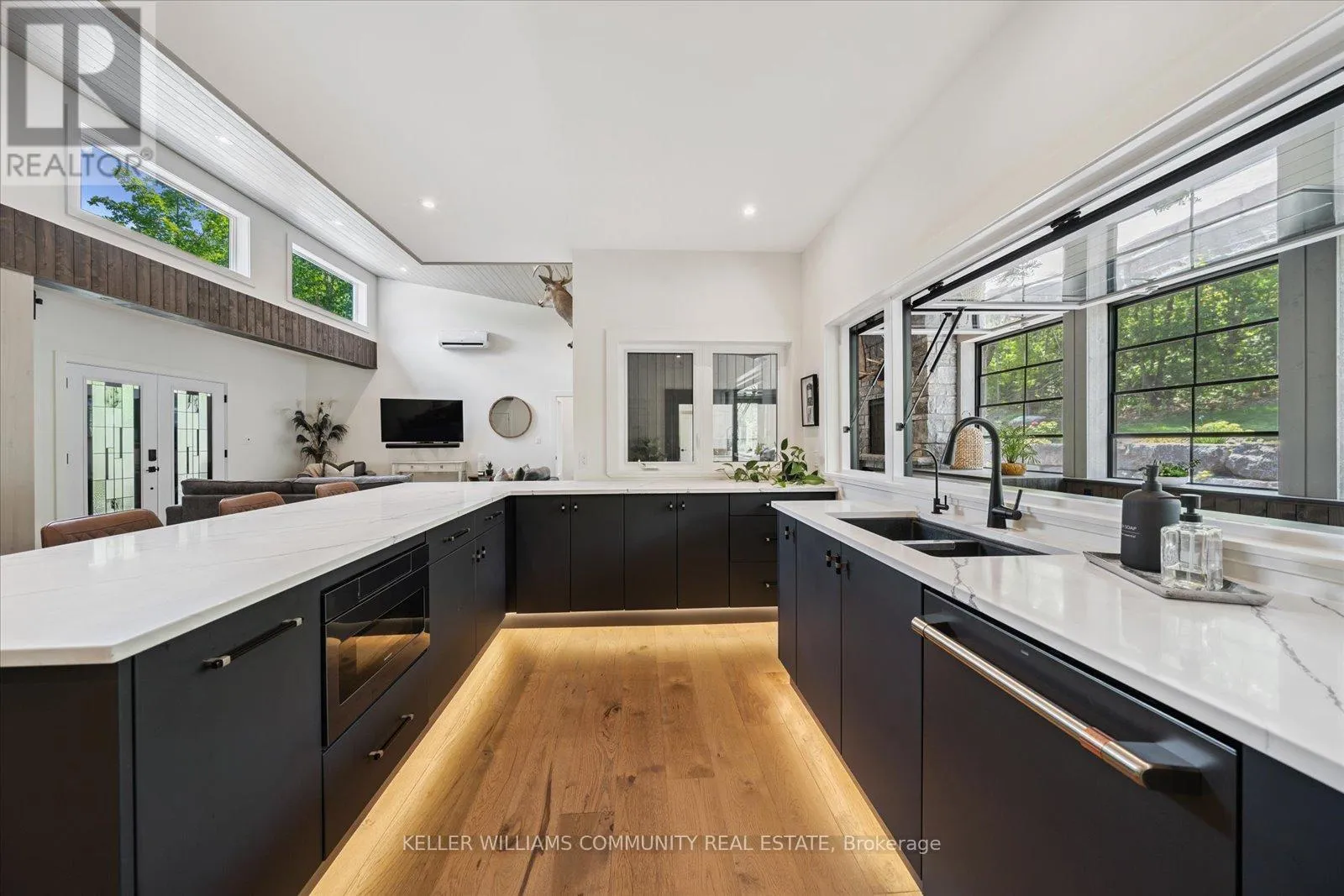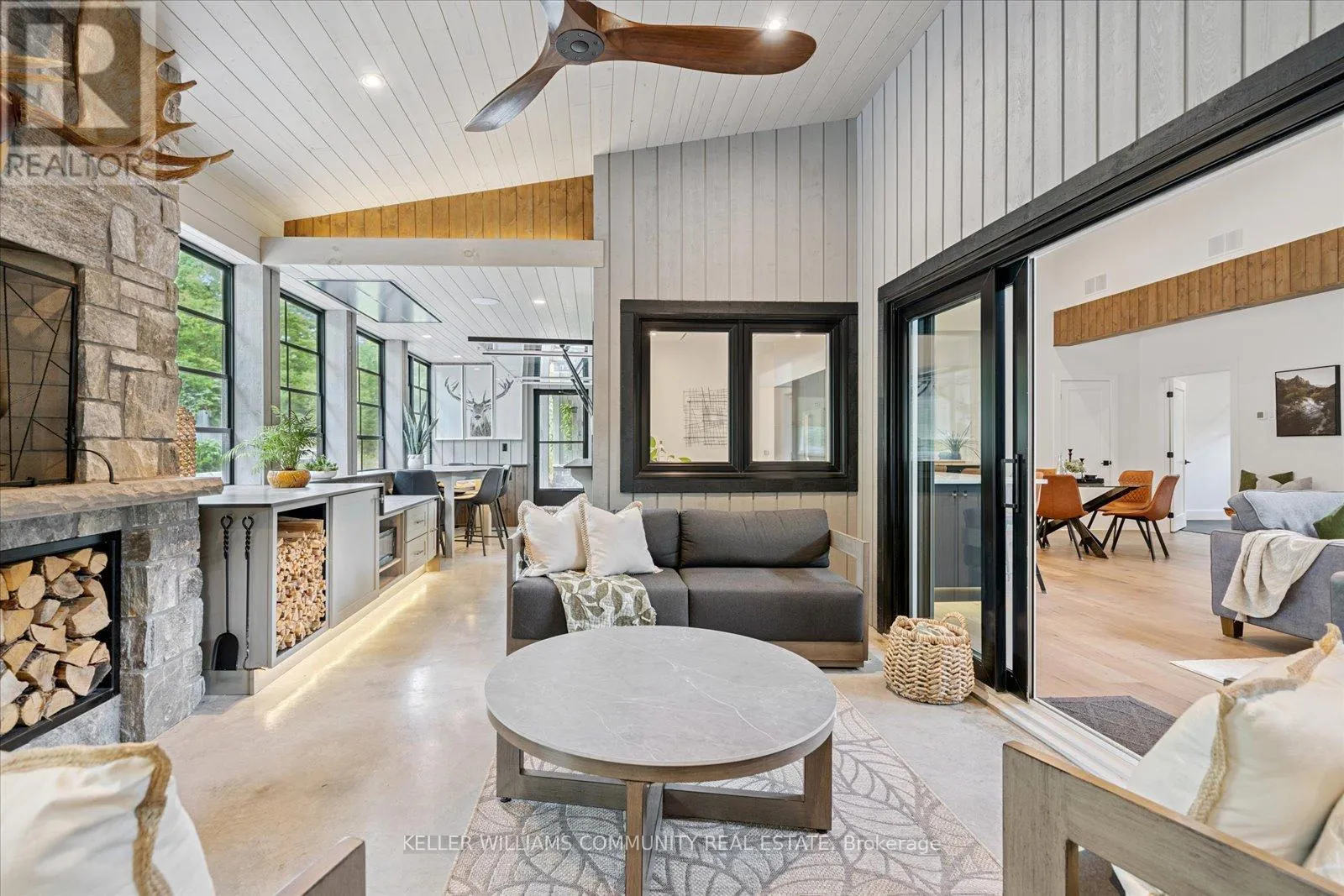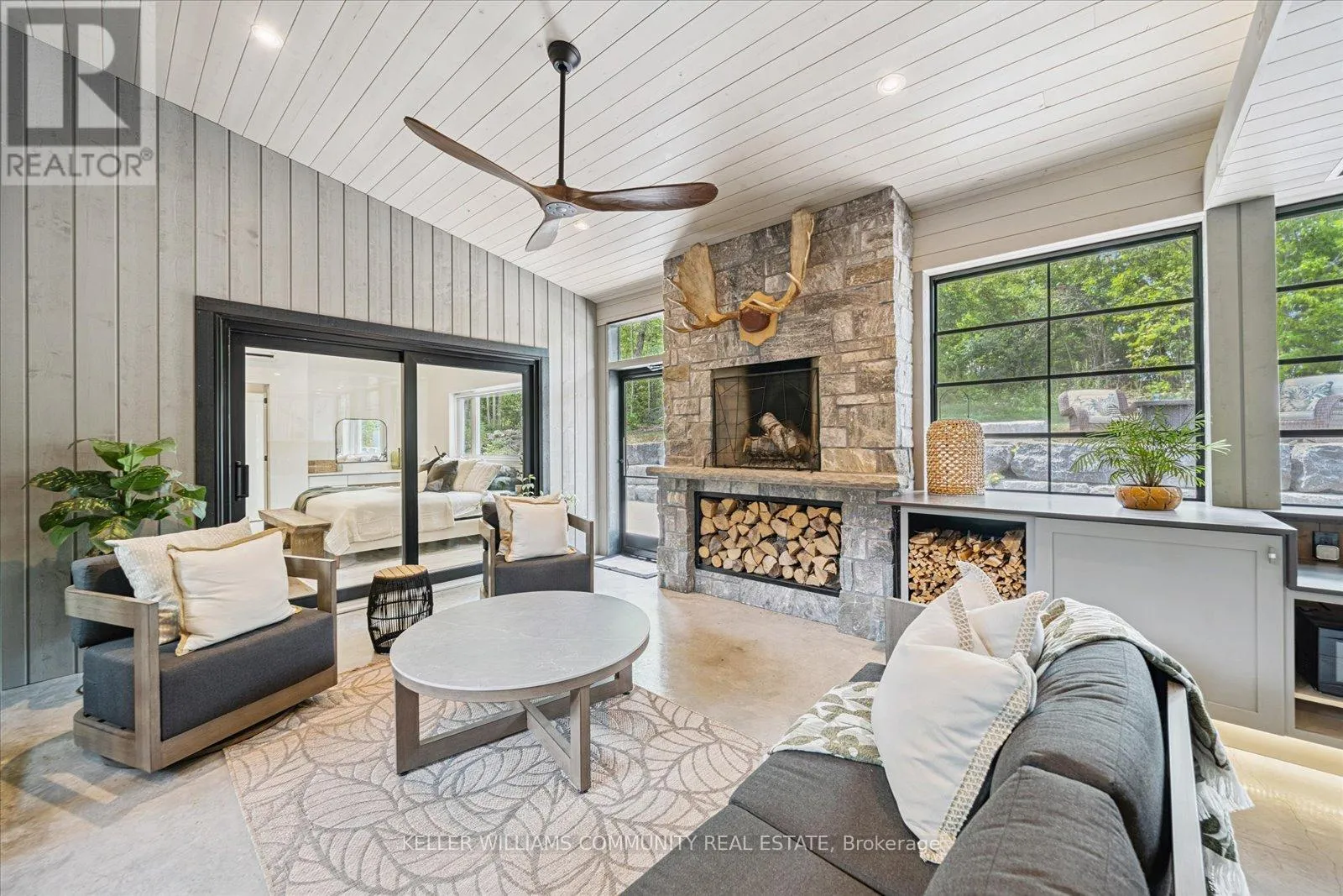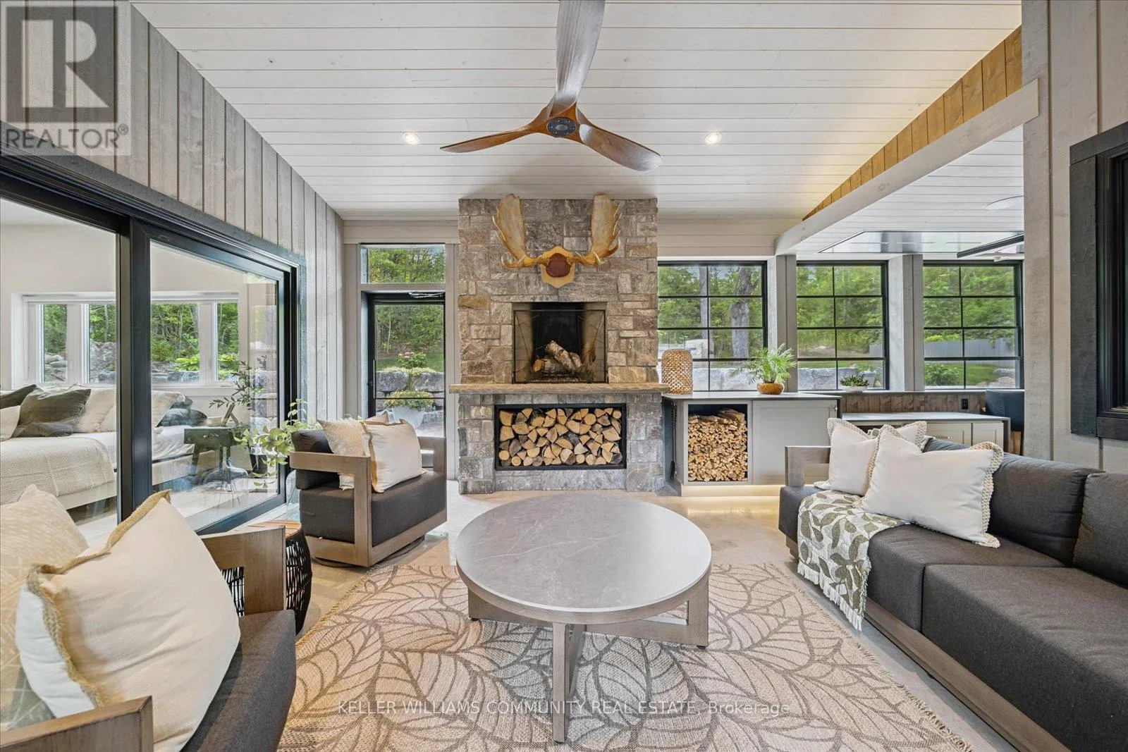 Cross Streets: Lakehurst Rd / Laplantes Rd. ** Directions: From Buckhorn take Lakehurst Rd West, turn right on Laplantes Rd. Welcome to 33 Laplantes Road, a custom-built multi-generational residence where craftsmanship, comfort, and natural beauty come together. Designed with intention from the ground up, this home offers an exceptional standard of living for families who value space, flexibility, and long-term planning.Radiant in-floor heating runs throughout the entire home, including the garage and sunroom. The chef-inspired kitchen features Caf appliances, double dishwashers, quartz countertops, and a full butler's kitchen for effortless entertaining and large family gatherings.With nearly 5,000 sq. ft. of finished, heated space (including the garages), the floor plan is highly efficient with no wasted square footage. The upper-level guest suite includes its own full kitchen, private living room, and bathroom-an ideal setup for multi-generational living, long-term guests, or adult children who need independence and privacy while staying close to home.A major highlight is the professional-grade heated workshop and garage, designed for serious craftspeople, collectors, and entrepreneurs. With 10' bay doors, an integrated dust extraction system, private office, wash bay, bathroom, and dedicated laundry, it's a rare, high-functioning space. The zoning also allows for a home-based business, creating even more opportunity to live and work on-site.The heated sunroom, anchored by a striking 1796 Rumford fireplace, features overhead-style windows that open to the outdoors and connect seamlessly to the kitchen-perfect for gatherings or quiet mornings. Outside, enjoy multiple stamped concrete patios, an outdoor shower, and a covered BBQ pavilion, all set in a private, wooded landscape.Located just minutes from pristine lakes and cottage-country amenities, this property offers a rare blend of luxury, privacy, function, and nature-a true lifestyle estate with timeless multi-generational appeal. (id:27476)