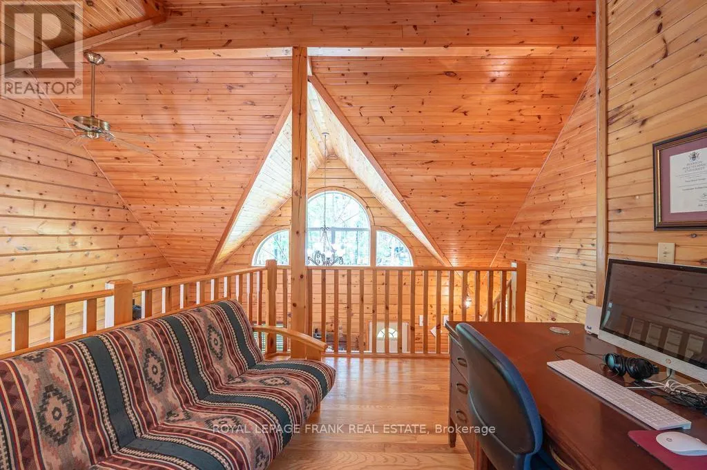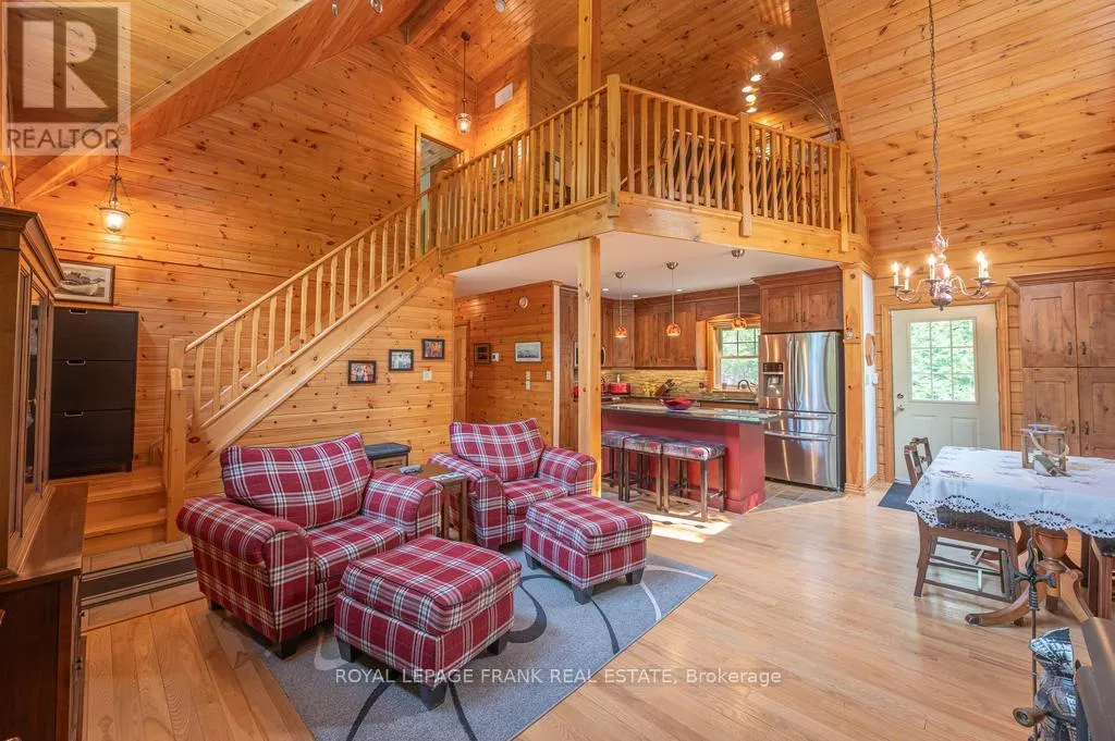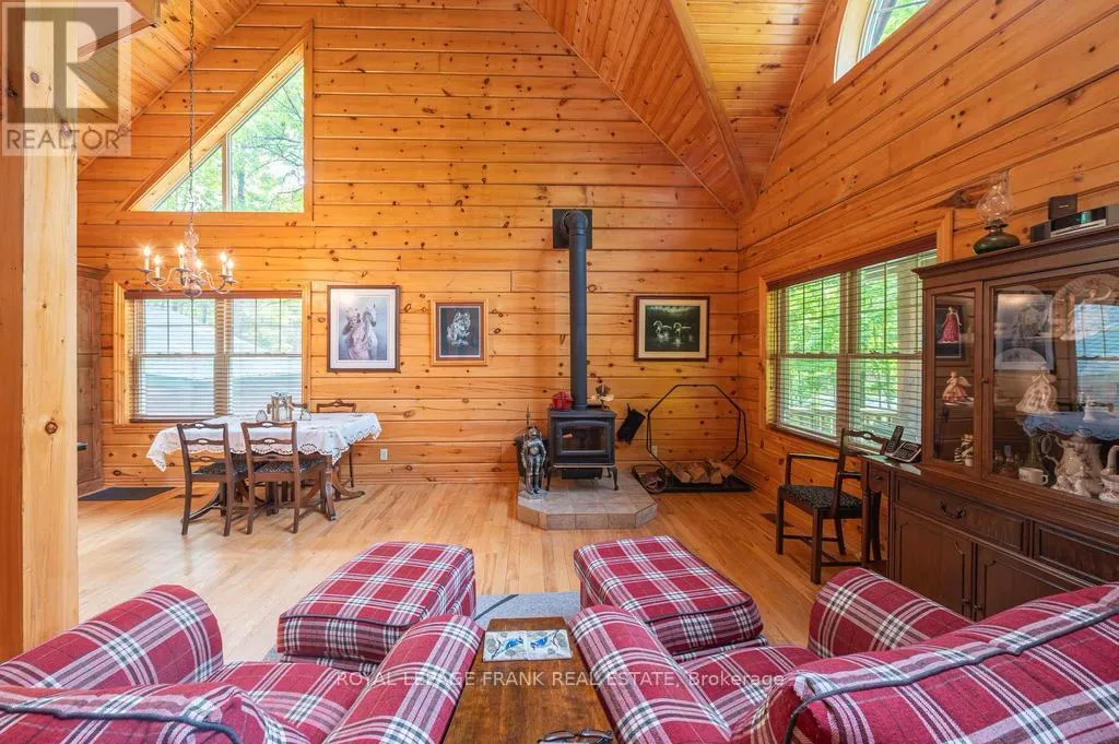 Cross Streets: Sugarbush Cr. and Sugarbush Blvd. ** Directions: Lakehurst to Flynn's Rd to Barcroft to Sugarbush Cr. Well maintained home nestled on 1.5 acre treed lot a short walk to a public access on Pigeon Lake for great swimming. You won't be disappointed by this classic rustic log home featuring 3 bedrooms, 2.5 baths, stunning vaulted ceilings, open concept with a cozy wood stove which is WETT certified. The 4-season sunroom with propane stove overlooks a private treed yard. The updated kitchen with alderwood cabinets and soapstone counters blends perfectly with the open concept living area. The main level bedroom is located across from a newly renovated bathroom. The second floor has a large primary suite with a 5 pc ensuite bathroom plus an office area open to the floor below. The lower level is fully finished with a large family room and plenty of storage. Screened in porch, large deck, perennial gardens and an oversized double car garage with carport. Situated on a township road, and a school bus route, close to the town of Buckhorn. (id:27476)