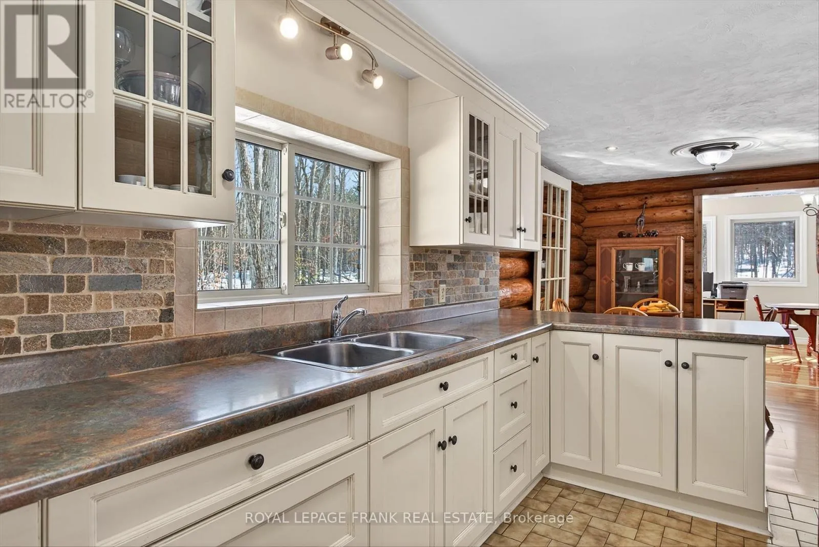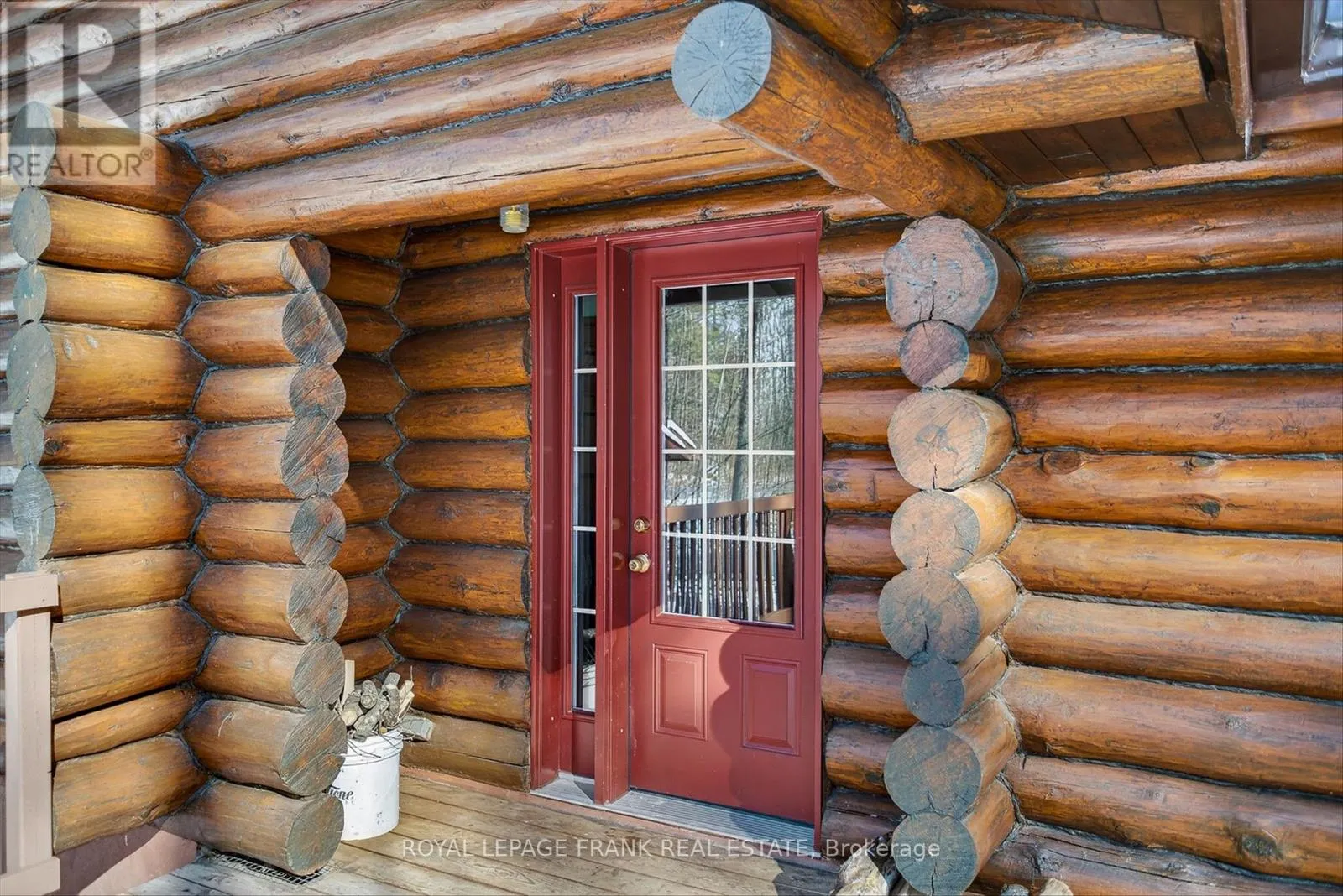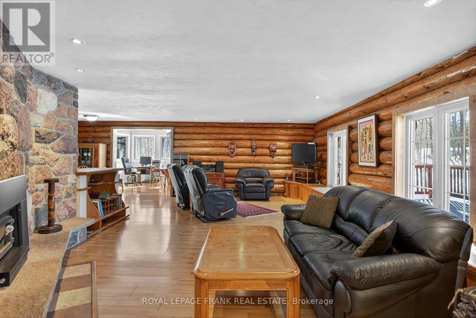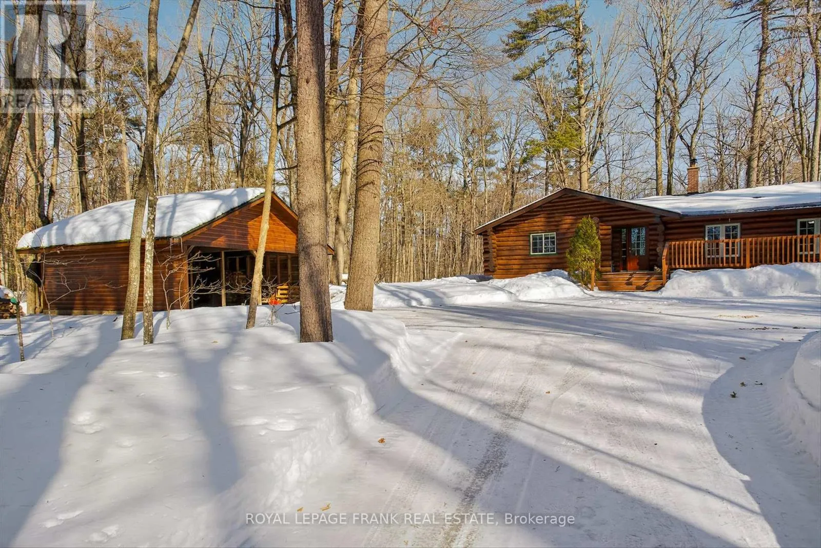 Cross Streets: Barcroft Rd/Sugarbush Cres. ** Directions: Lakehurst Rd to Flynn's Rd to Barcroft Rd to Sugarbush Cres. Lovely log home nestled on over an acre of treed privacy in the great community of the Sugarbush surrounded by Pigeon and Buckhorn Lakes. Just minutes to all amenities in Buckhorn or Ennismore. This property has great swimming and a spot to launch your kayak or canoe at the public access just down the road and only minutes to the beautiful Sandy Beach and 6 Foot Bay Golf Course. This well maintained home features pegged hardwood floors, beautiful granite fireplace (not WETT), vaulted ceilings in the gorgeous dining room with a walkout to a large wrap around deck and a large fire pit. 2 bedrooms on the main floor and a 5 pc bath. Lovely kitchen with glass display cabinetry and peninsula. Downstairs is a large family room, 3rd bedroom, 2pc bath & office! Large utility /furnace room. Detached double car garage and outdoor sauna. Just a few of the updates: Forced air electric furnace (2017), roof (2018), septic (2025), 200 amp electrical panel (2025), outdoor sauna (2019). Note: a private one acre lot also for sale, mls #X12842806 adjacent, could be purchased together. Home Inspection available. (id:27476)