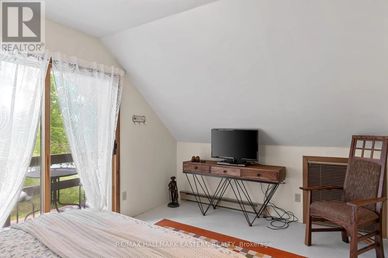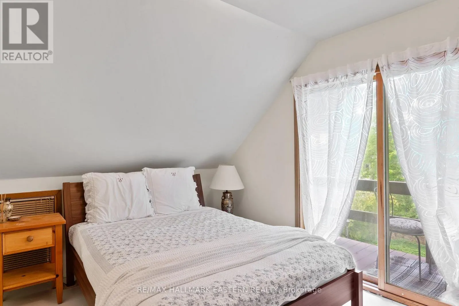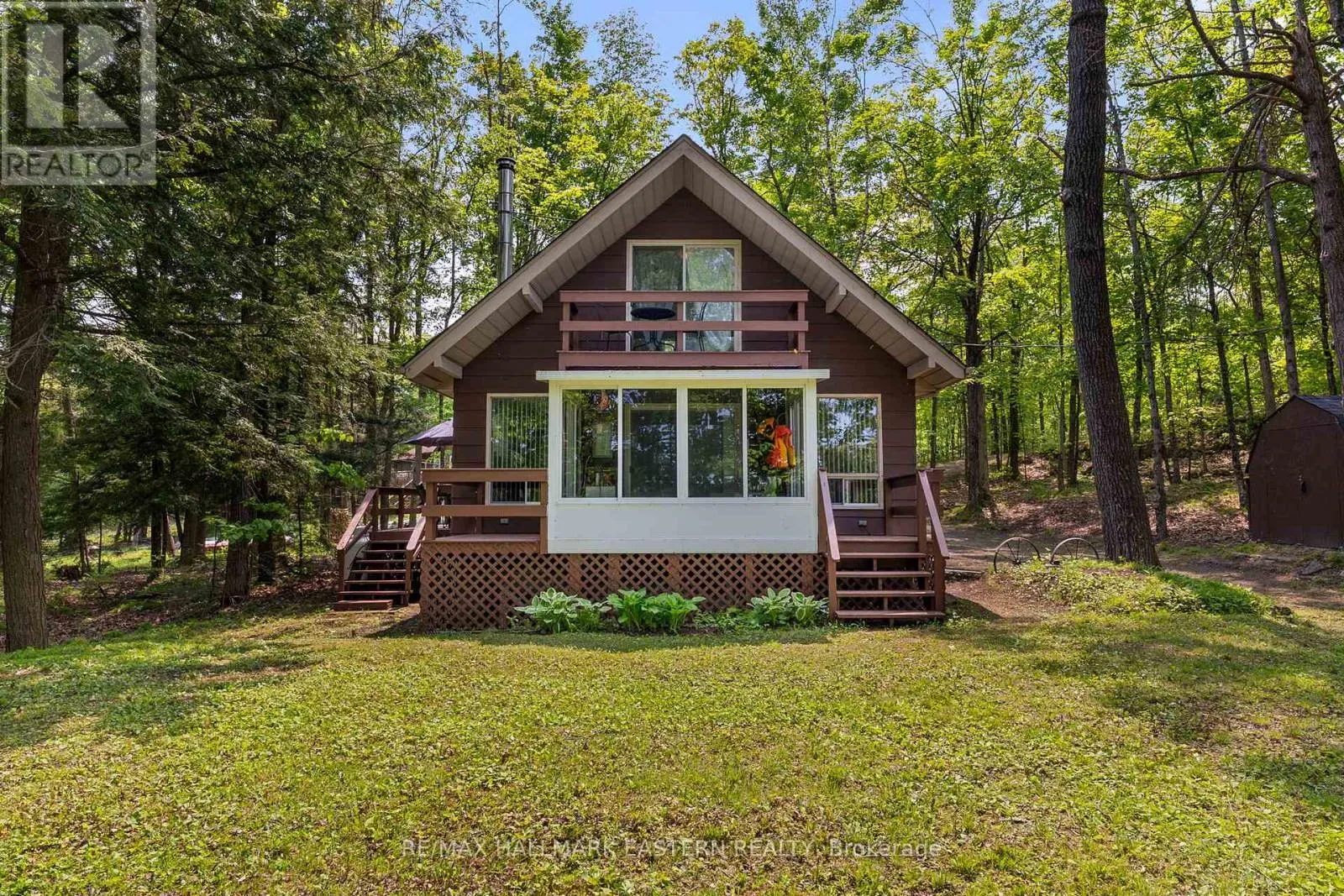 Cross Streets: Elbow Point Rd & Irwin Dr. ** Directions: Lakehurst Rd to Elbow Point Rd. Turn right onto Irwin Dr. Welcome to a private lakeside escape on Big Bald Lake, part of the sought-after Trent-Severn Waterway, offering access to five lakes without the need for locking. Nestled on a beautifully treed lot with 150' of shoreline, this four-season chalet-style cottage delivers exceptional privacy and a gentle, level approach to the water's edge. Inside, you'll find a warm and inviting open-concept layout with 3 bedrooms and a full 4-piece bath. The kitchen, dining and living areas are accented with rich wood finishes and anchored by a cozy propane fireplace, perfect for year-round enjoyment. A bright glass sunroom captures peaceful lake views, while the spacious deck and dock invite effortless outdoor living. The lakeside primary bedroom features its own walkout balcony, an ideal spot to start your day with coffee overlooking the water. Thoughtful updates include a new water pump and UV system (2024) and a newly reshingled roof (2025), offering added peace of mind. Directly across the lake, 283 acres of privately owned managed forest provide a serene, untouched backdrop. For those seeking a bit of adventure, a nearby jumping rock awaits, while the crystal-clear turquoise waters of Sandy Lake Beach are just minutes away for exceptional swimming and paddling. (id:27476)