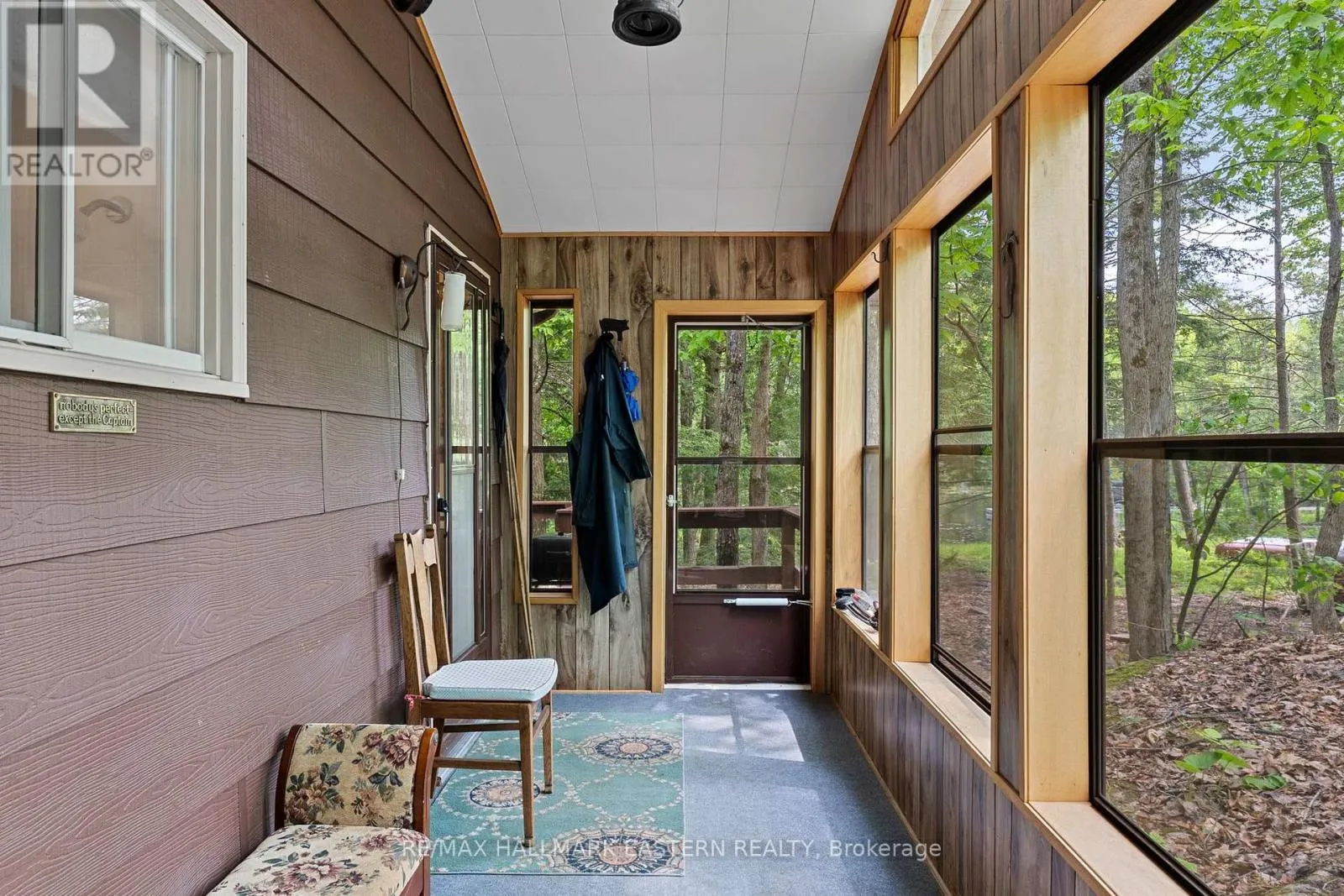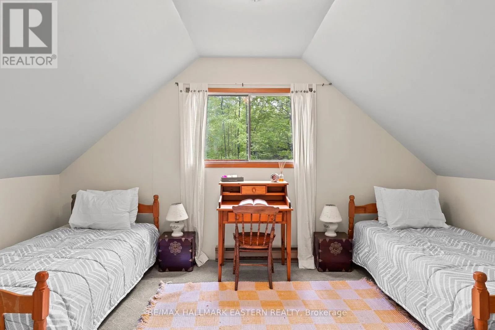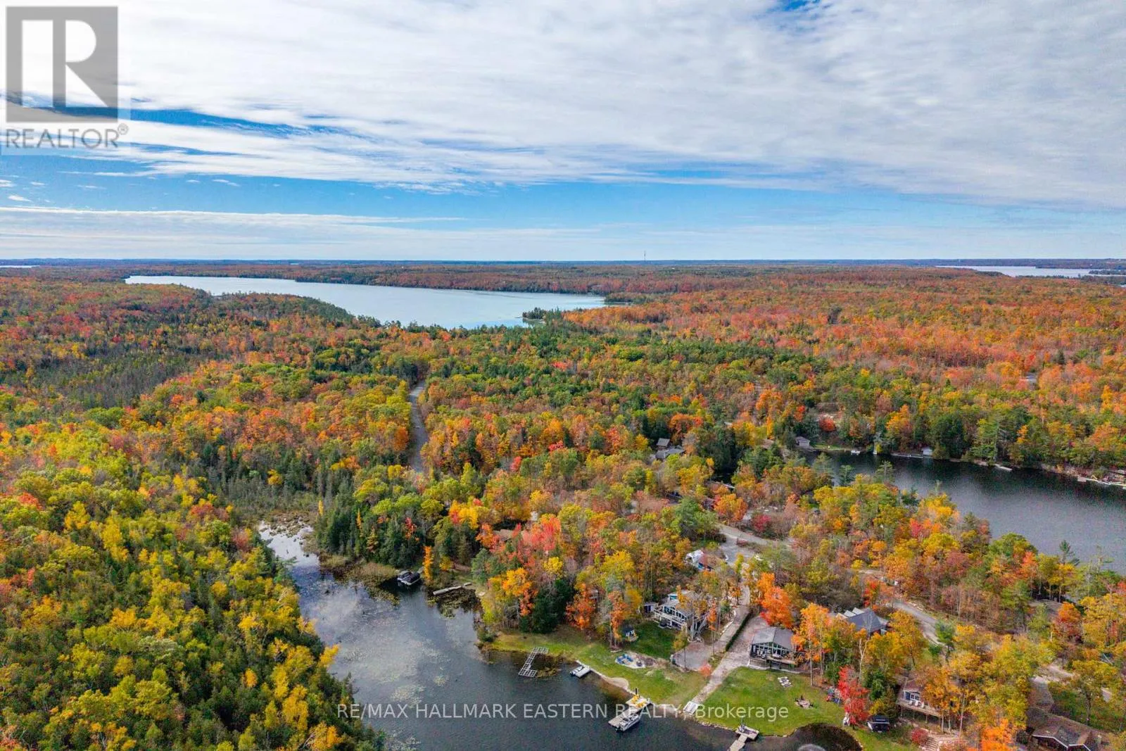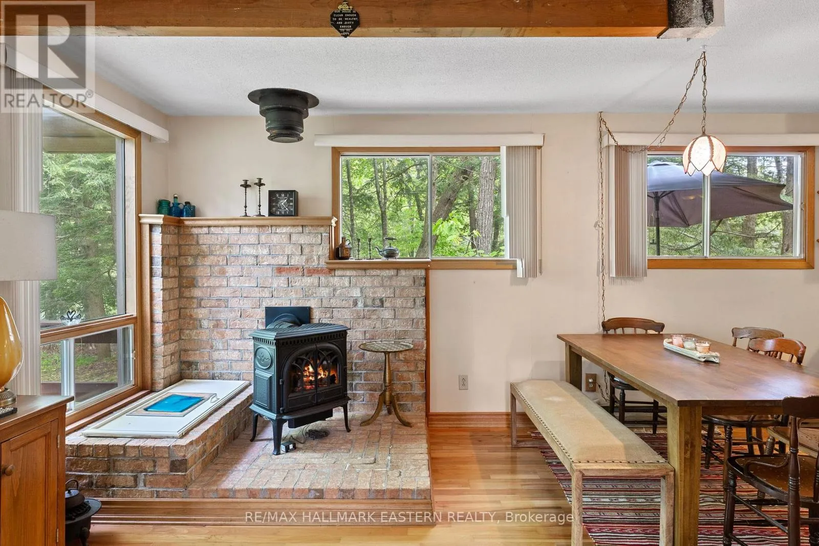 Cross Streets: Elbow Point Rd & Irwin Dr. ** Directions: Lakehurst Rd to Elbow Point Rd. Turn right onto Irwin Dr. Welcome to a private lakeside escape on Big Bald Lake, part of the sought-after Trent-Severn Waterway, offering access to five lakes without the need for locking. Nestled on a beautifully treed lot with 150' of shoreline, this four-season chalet-style cottage delivers exceptional privacy and a gentle, level approach to the water's edge. Inside, you'll find a warm and inviting open-concept layout with 3 bedrooms and a full 4-piece bath. The kitchen, dining and living areas are accented with rich wood finishes and anchored by a cozy propane fireplace, perfect for year-round enjoyment. A bright glass sunroom captures peaceful lake views, while the spacious deck and dock invite effortless outdoor living. The lakeside primary bedroom features its own walkout balcony, an ideal spot to start your day with coffee overlooking the water. Thoughtful updates include a new water pump and UV system (2024) and a newly reshingled roof (2025), offering added peace of mind. Directly across the lake, 283 acres of privately owned managed forest provide a serene, untouched backdrop. For those seeking a bit of adventure, a nearby jumping rock awaits, while the crystal-clear turquoise waters of Sandy Lake Beach are just minutes away for exceptional swimming and paddling. (id:27476)
